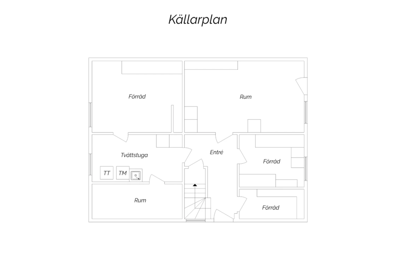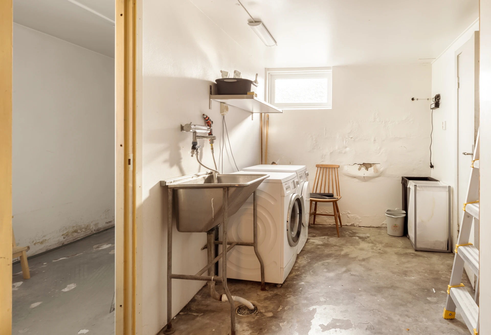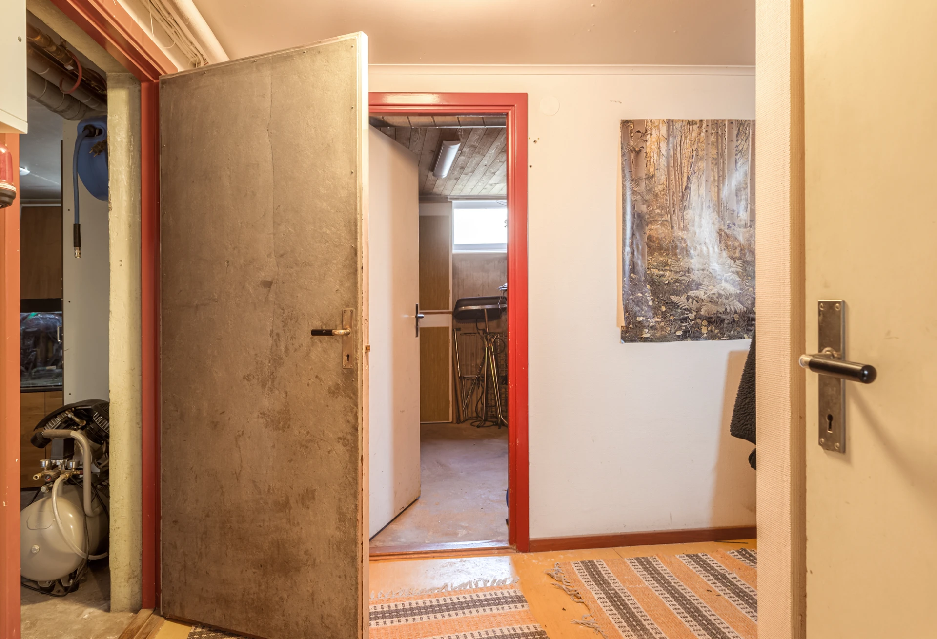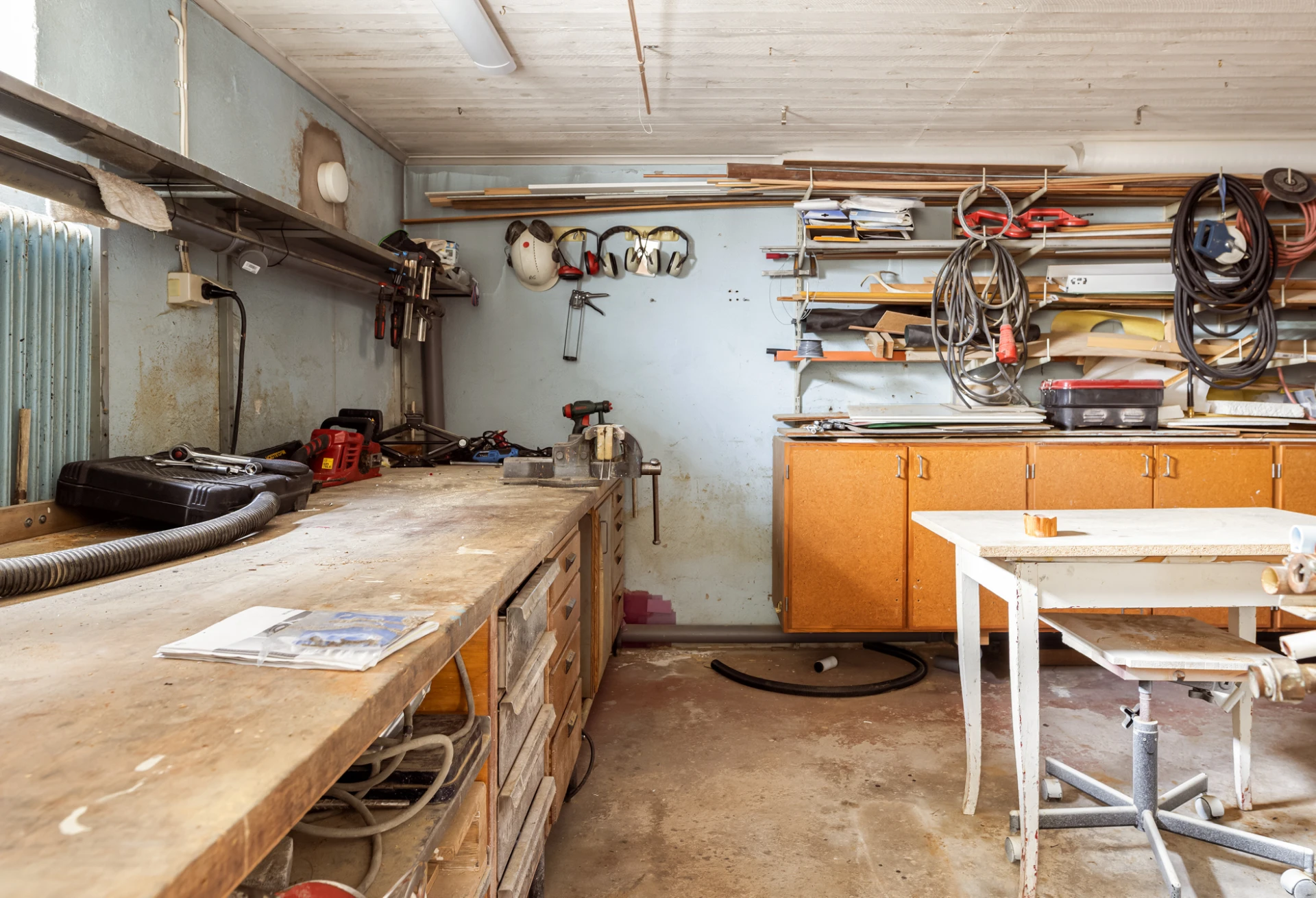 En trappa ner når vi den väl tilltagna källaren med ytterligare goda förvaringsmöjligheter, en gedigen verkstad för den händiga och dessutom ytterligare ytor där man tex kan inreda kontor eller hobbyrum.