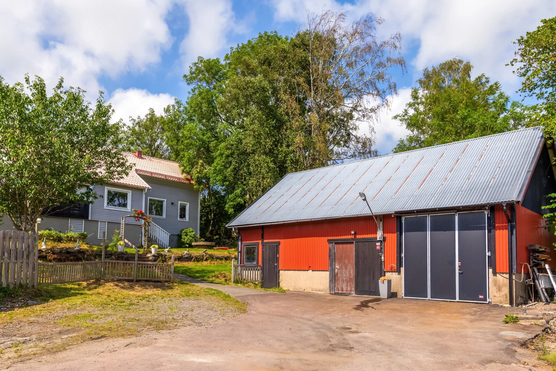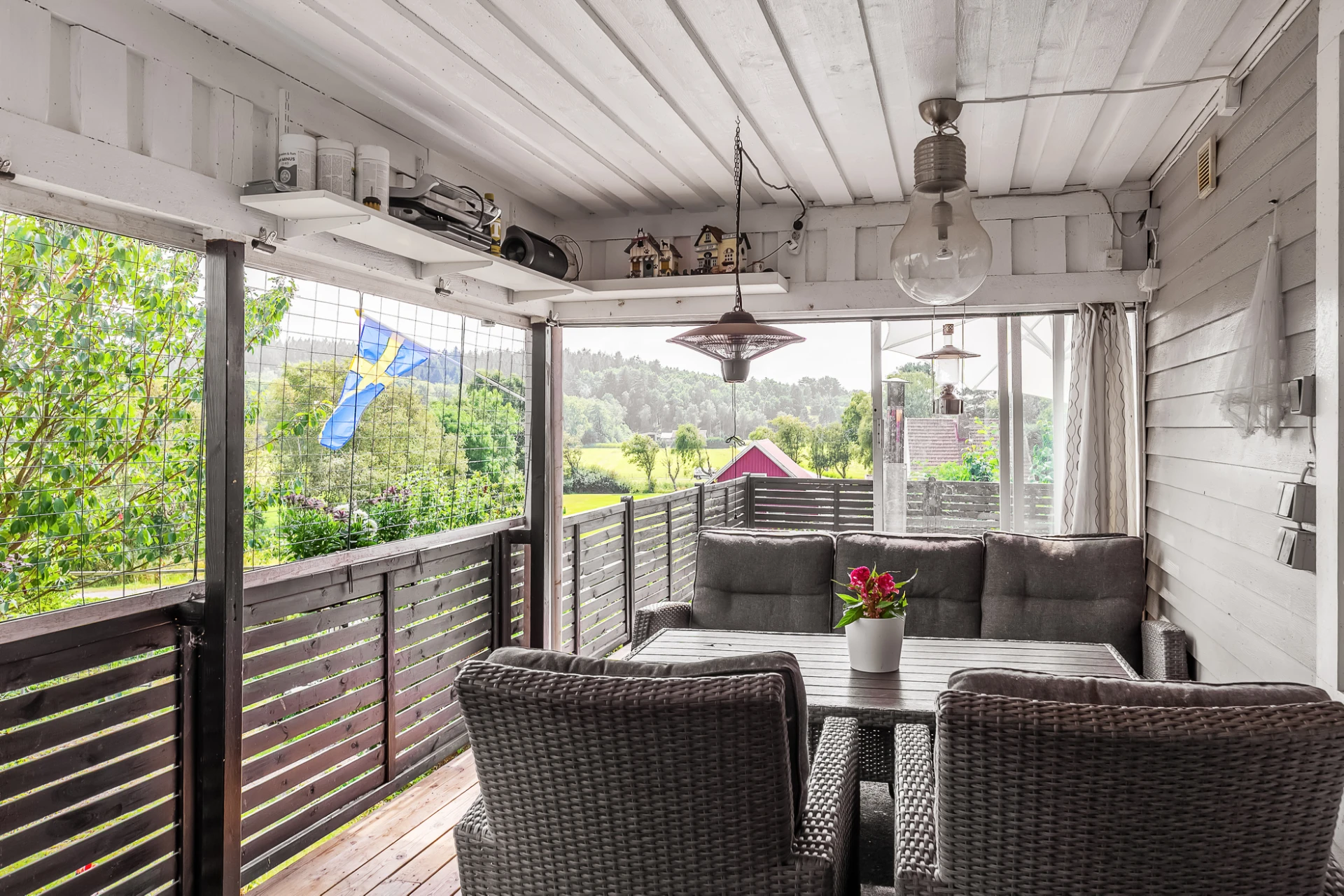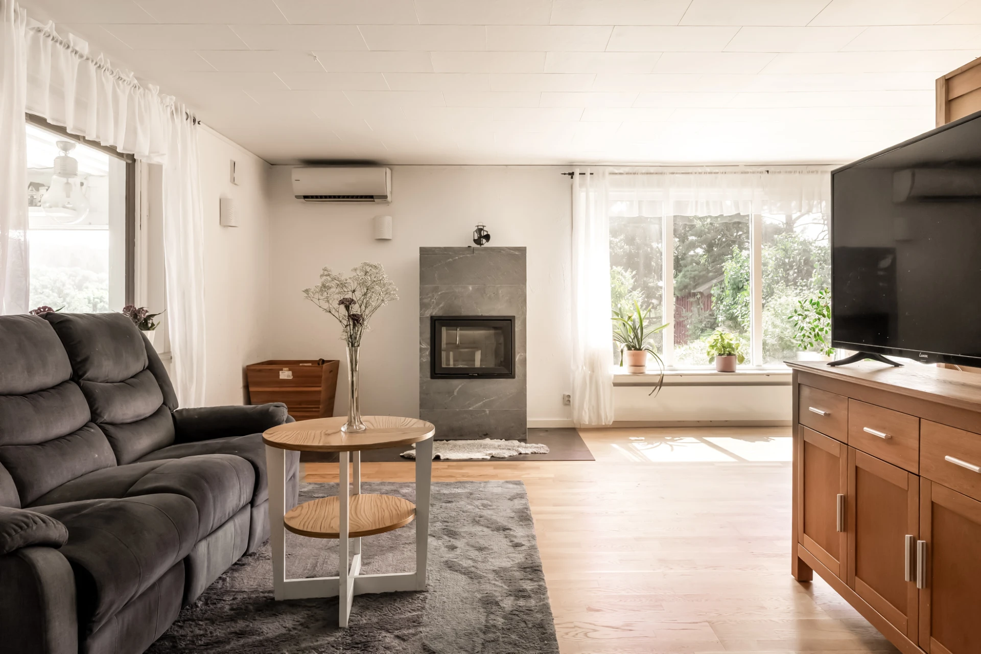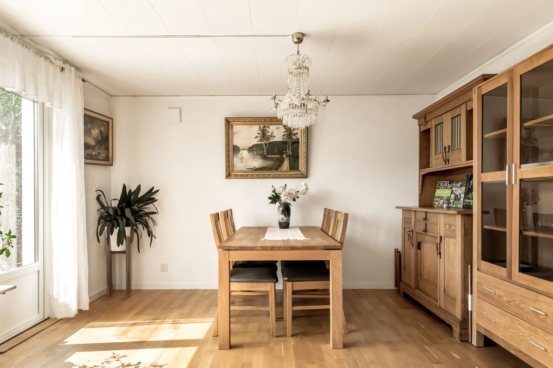 Parkettgolv, målade väggar, plats för stor matgrupp, täljstenskamin och utgång till trädgården