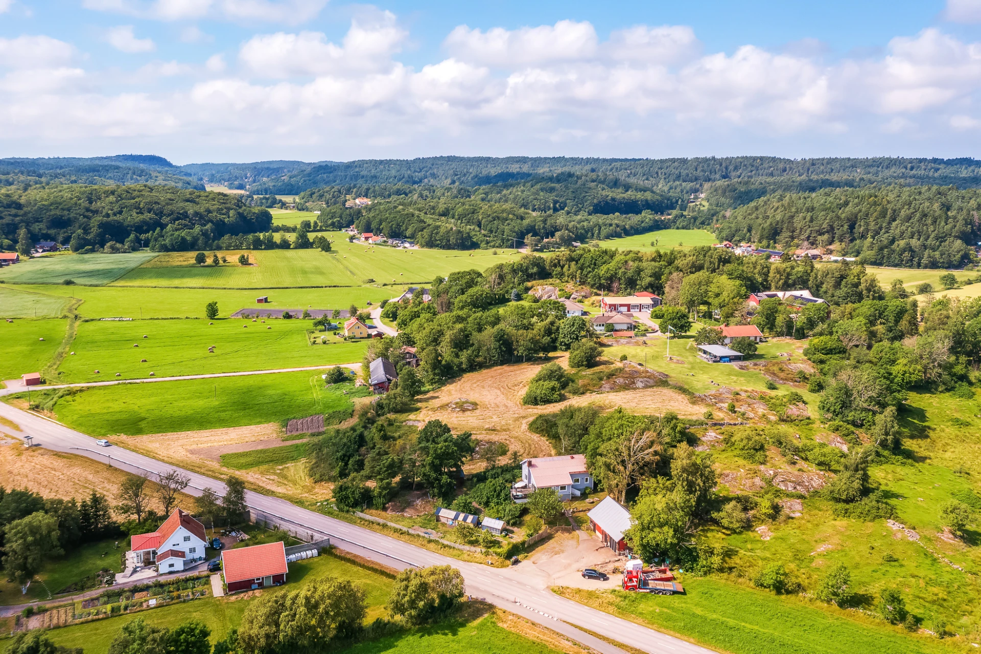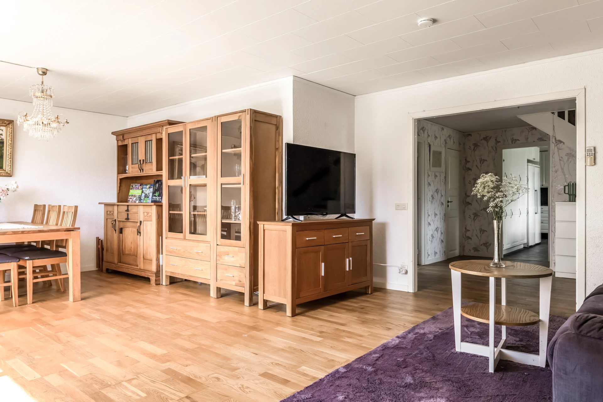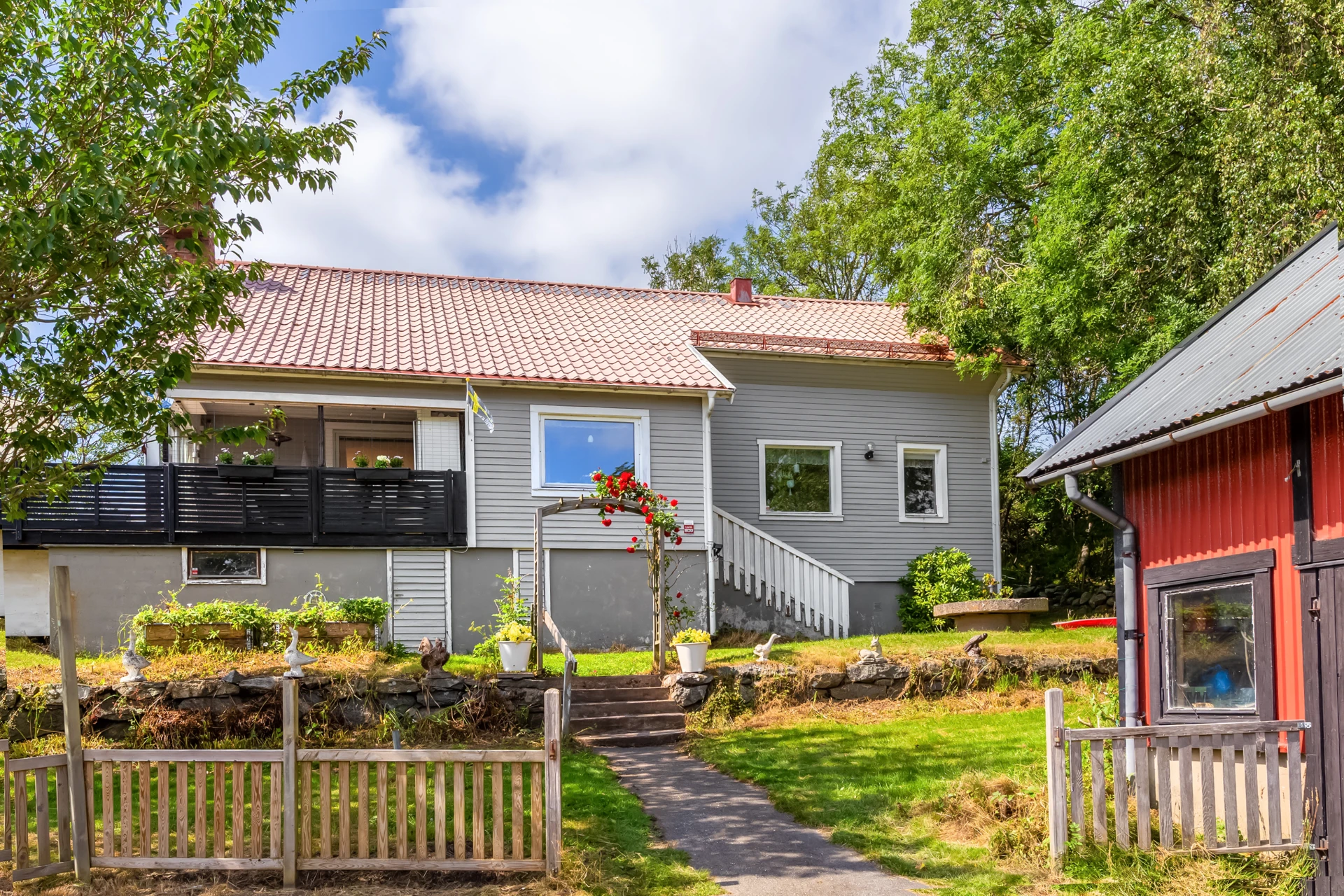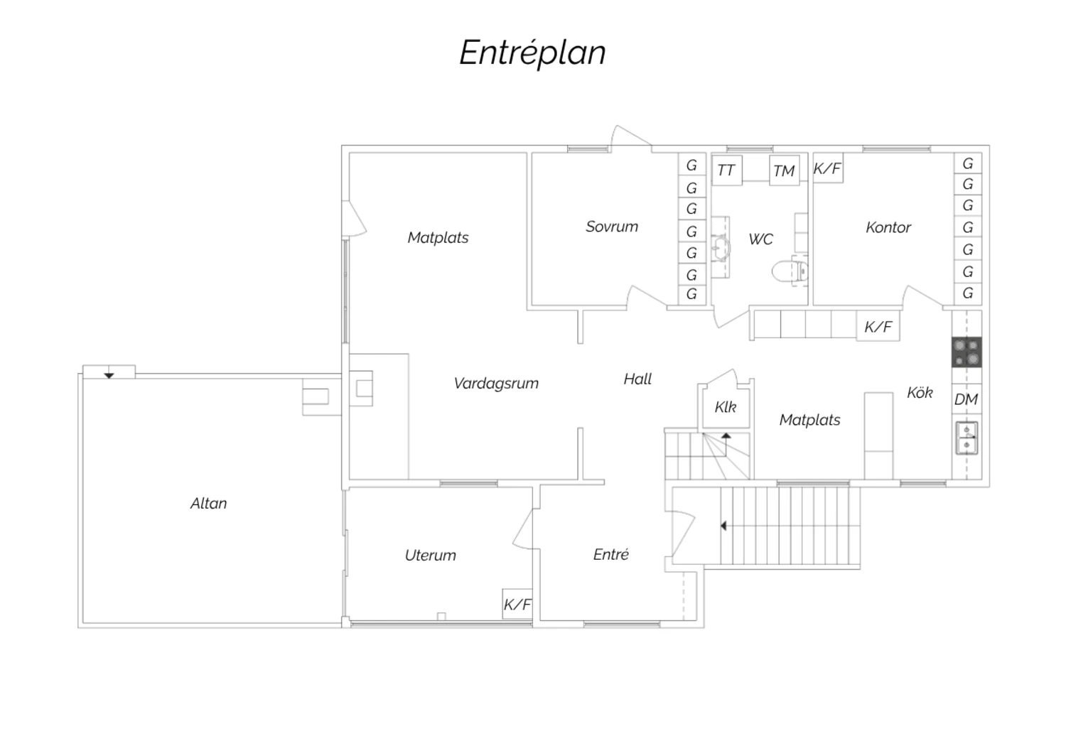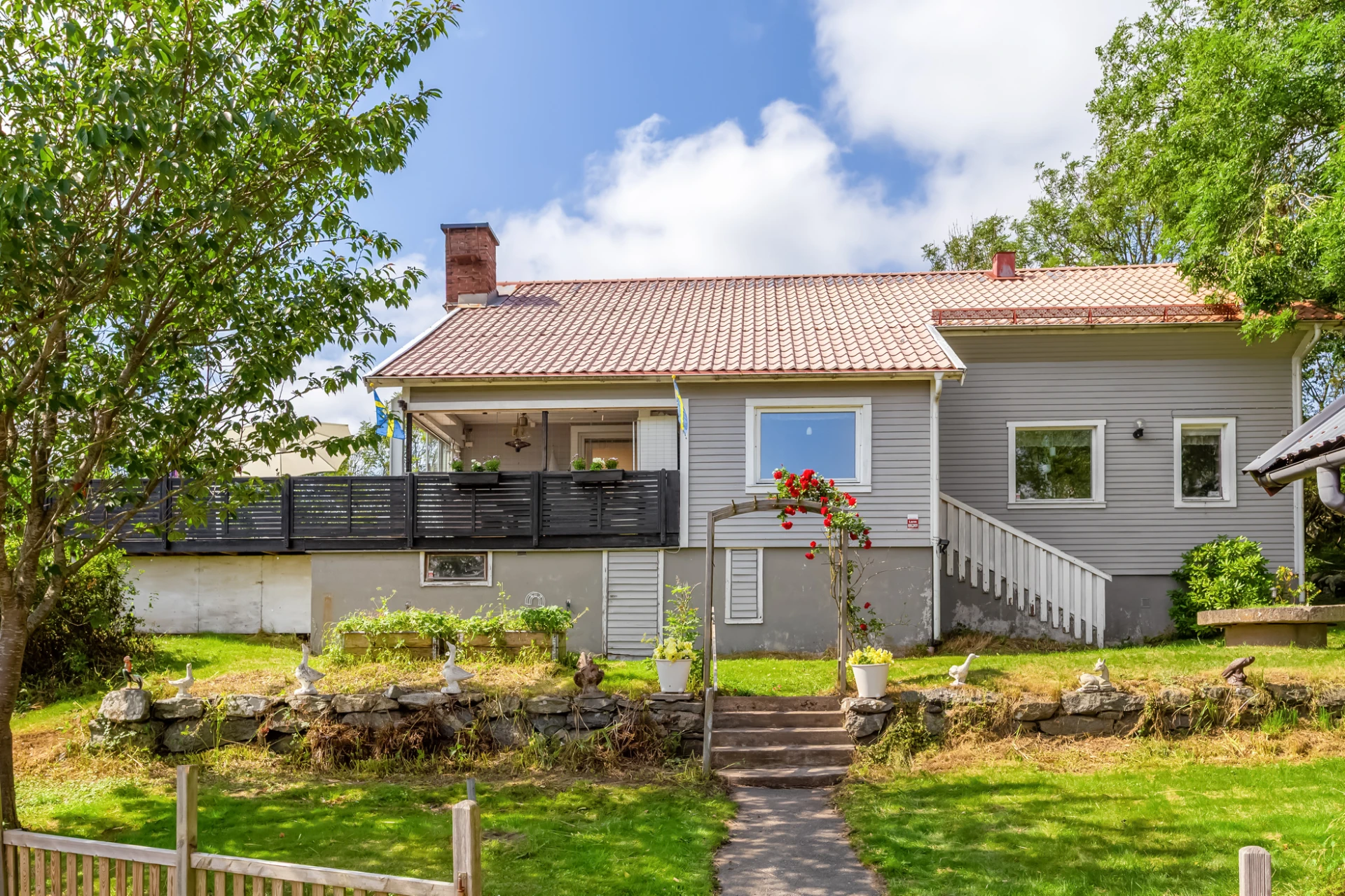 Parkettgolv, målade väggar, plats för stor matgrupp, täljstenskamin och utgång till trädgården