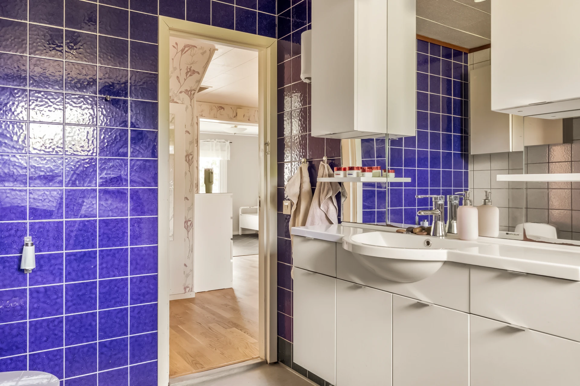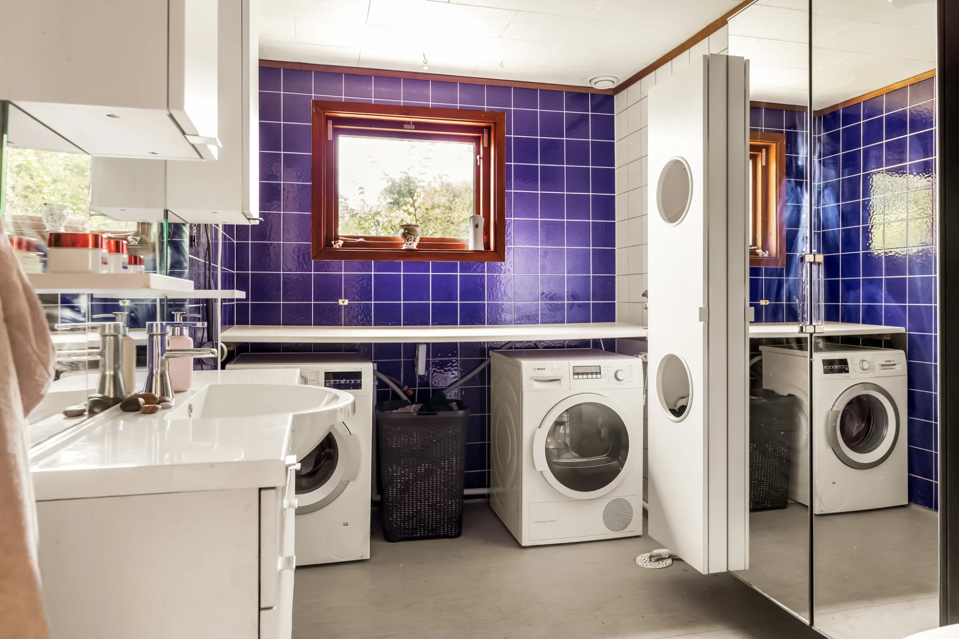 Våtrumsmatta, kaklade väggar, WC, tvättmaskin, torktumlare från Bosch, kommod och spegelskåp