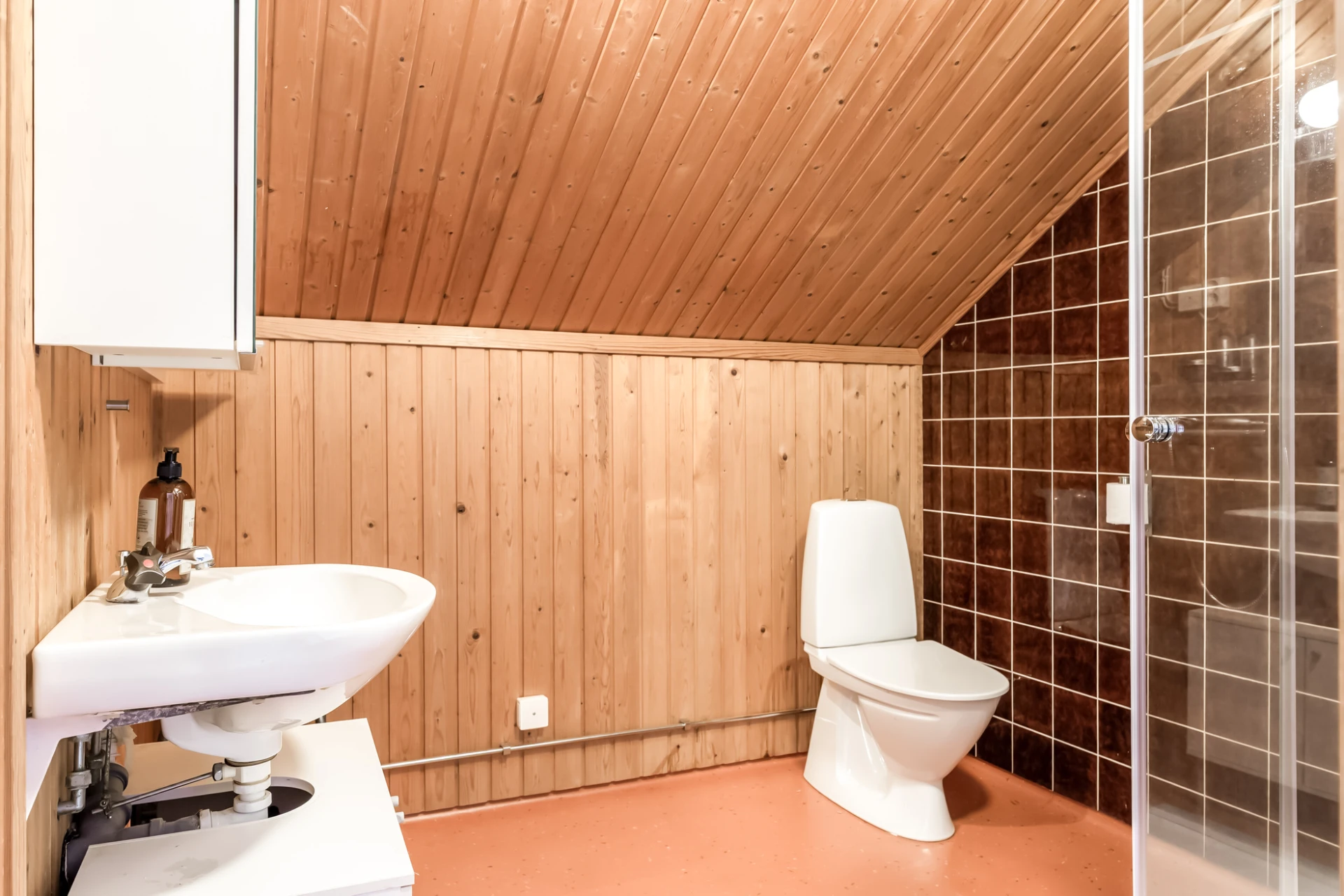 Våtrumsmatta, träpanel, kaklade väggar, WC, kommod, spegelskåp, duschvägg samt ett stort torkrum med stång och hyllor
