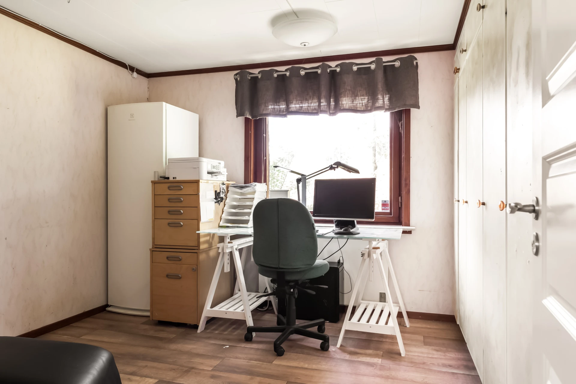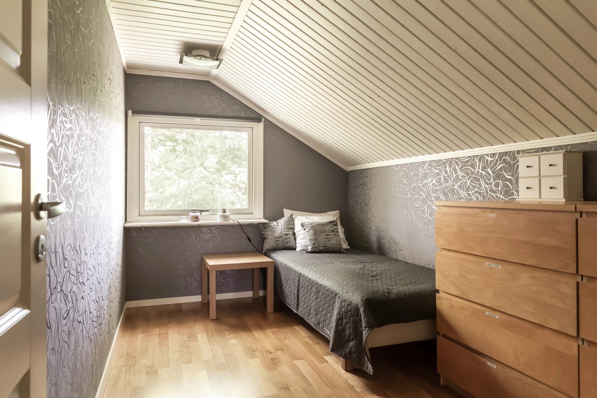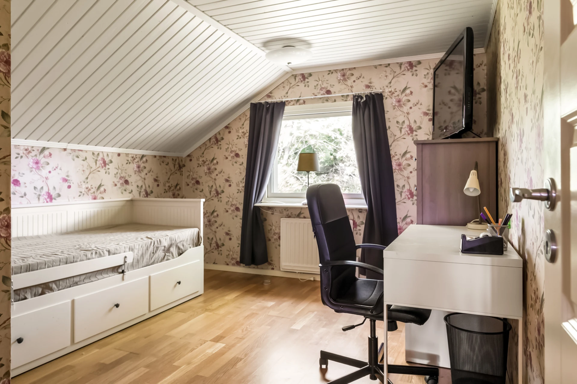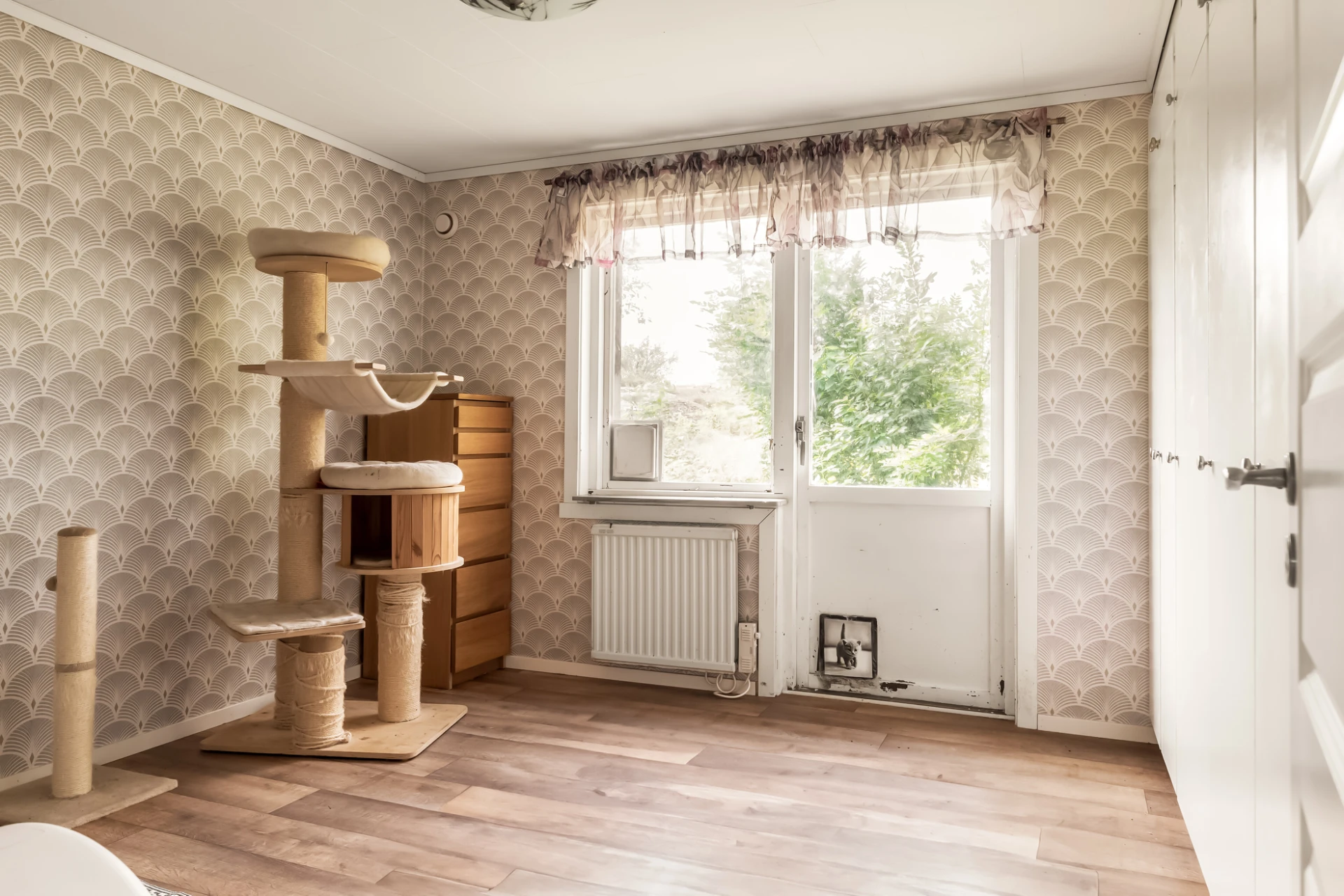 Vinylgolv, tapetserade väggar och inbyggda garderober