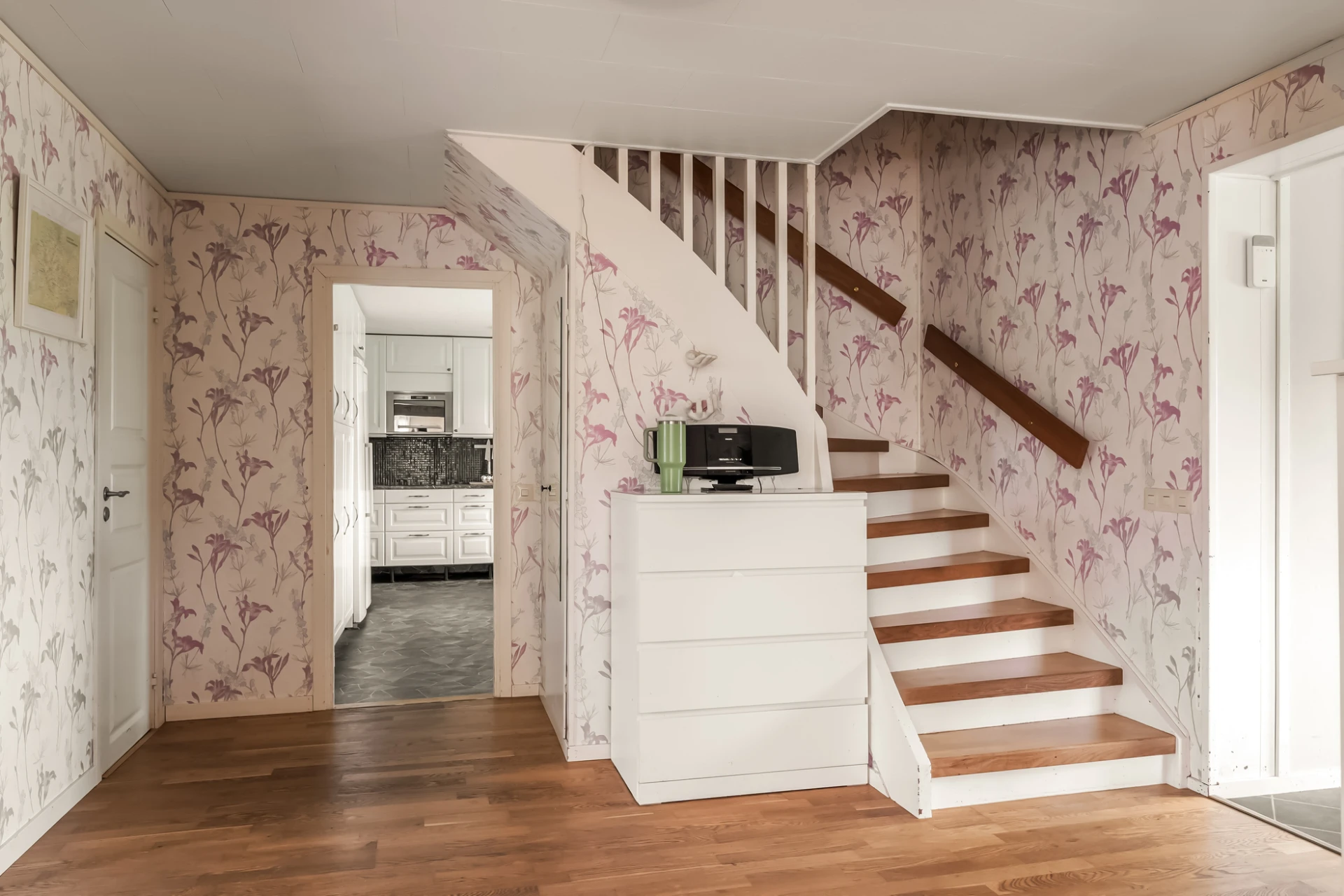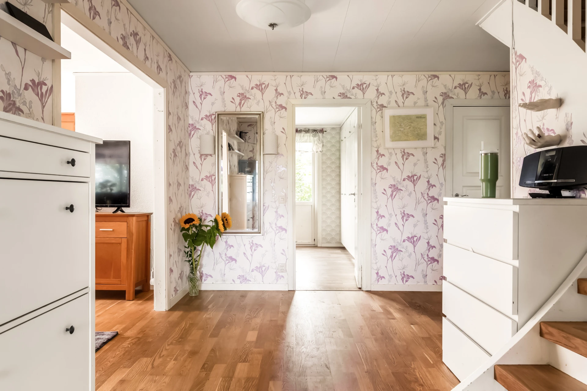 Vinylgolv (yttre hall), parkettgolv (inre hall) och tapetserade väggar