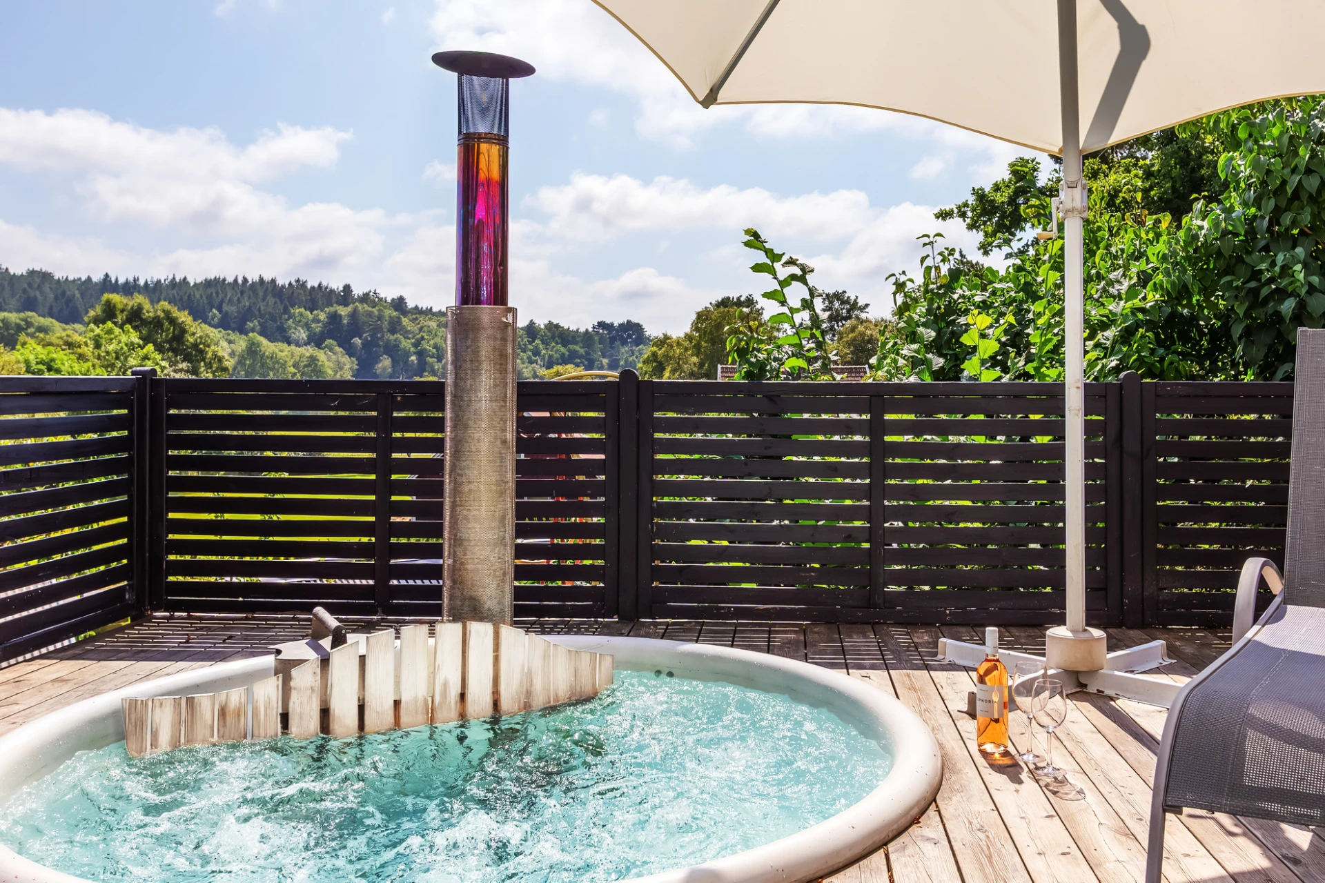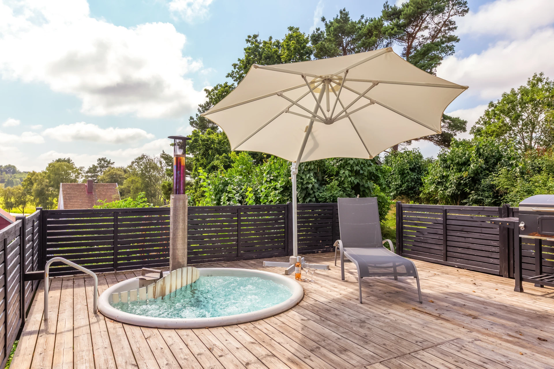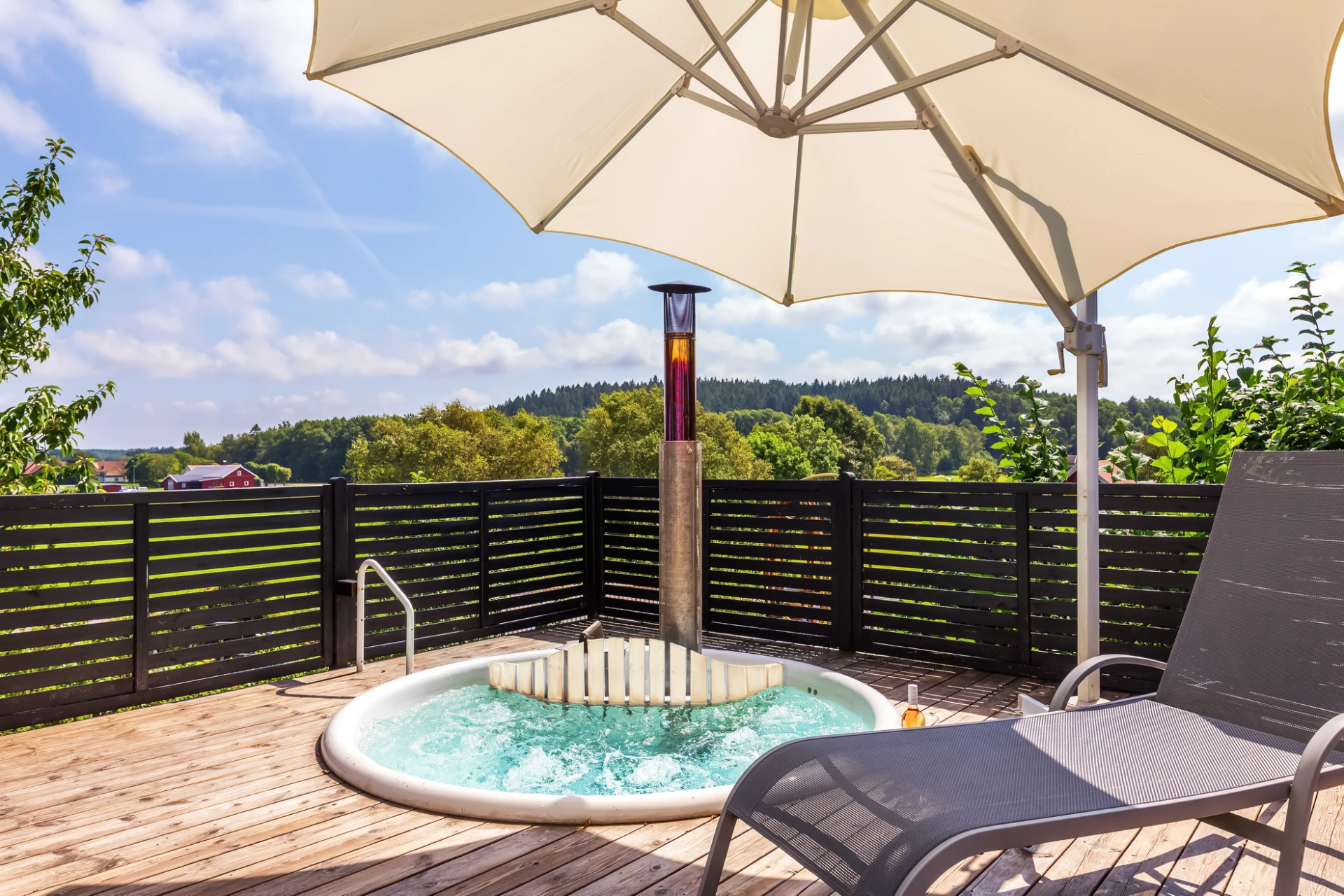 Stor altan med uterum och vedeldad badtunna i söderläge
