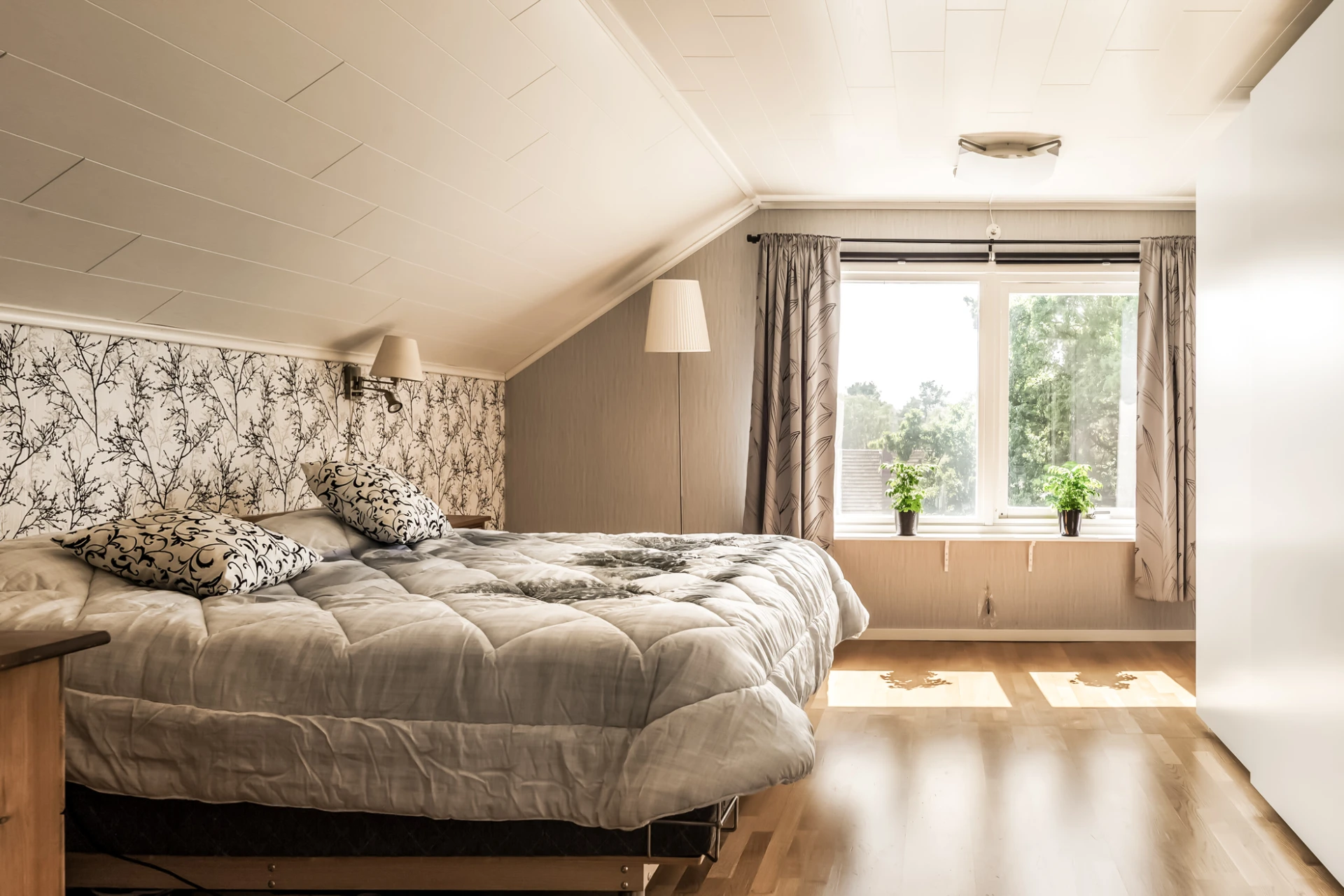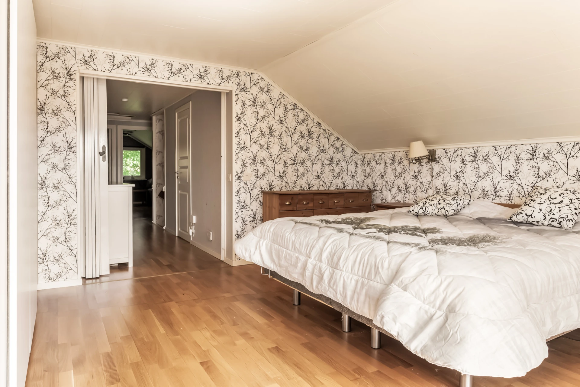 Laminatgolv, tapetserade väggar och skjutsgarderober