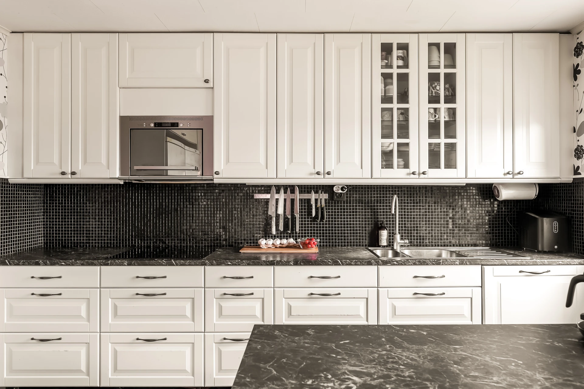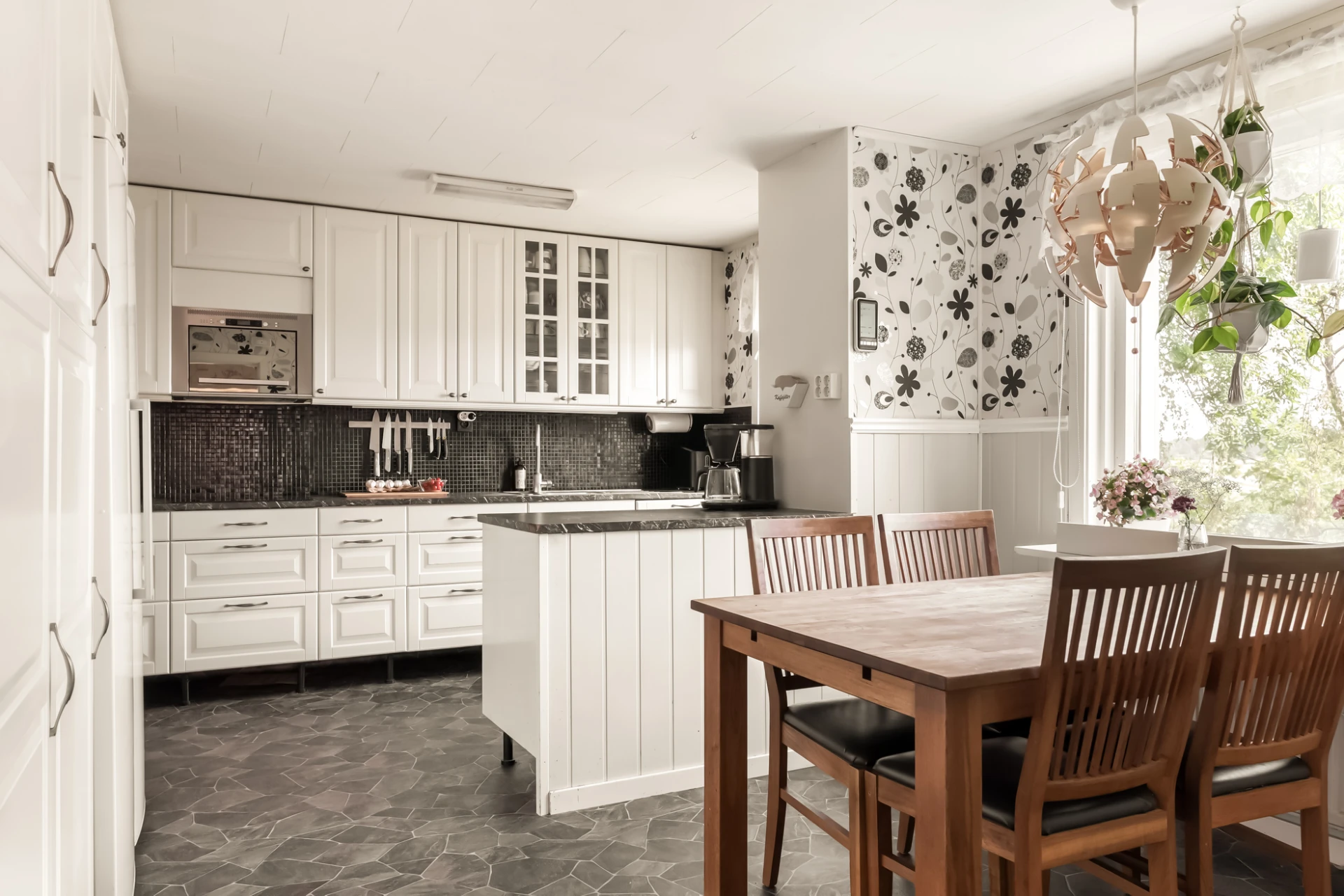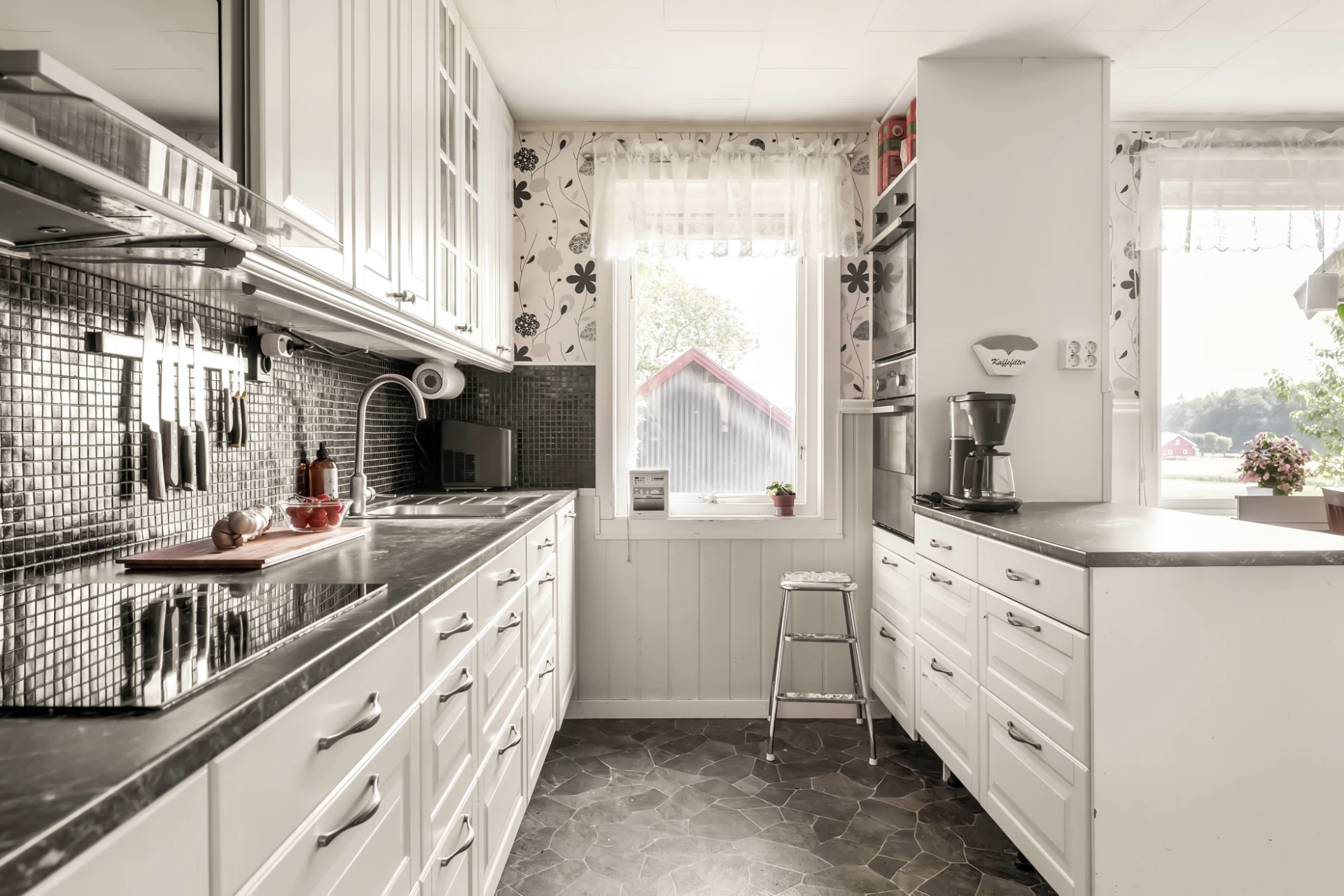Stilrent kök med vita luckor, bänkskiva i laminat, svart kakel, vinylgolv och tapetserade väggar. Utrustning består av kyl, frys, diskmaskin, induktionshäll, fläkt, ugn och mikro