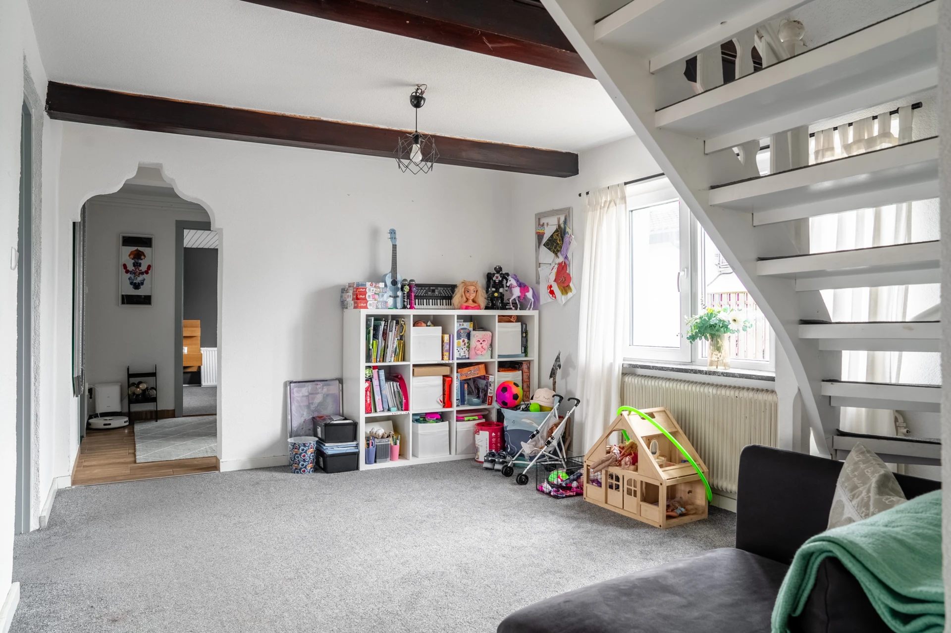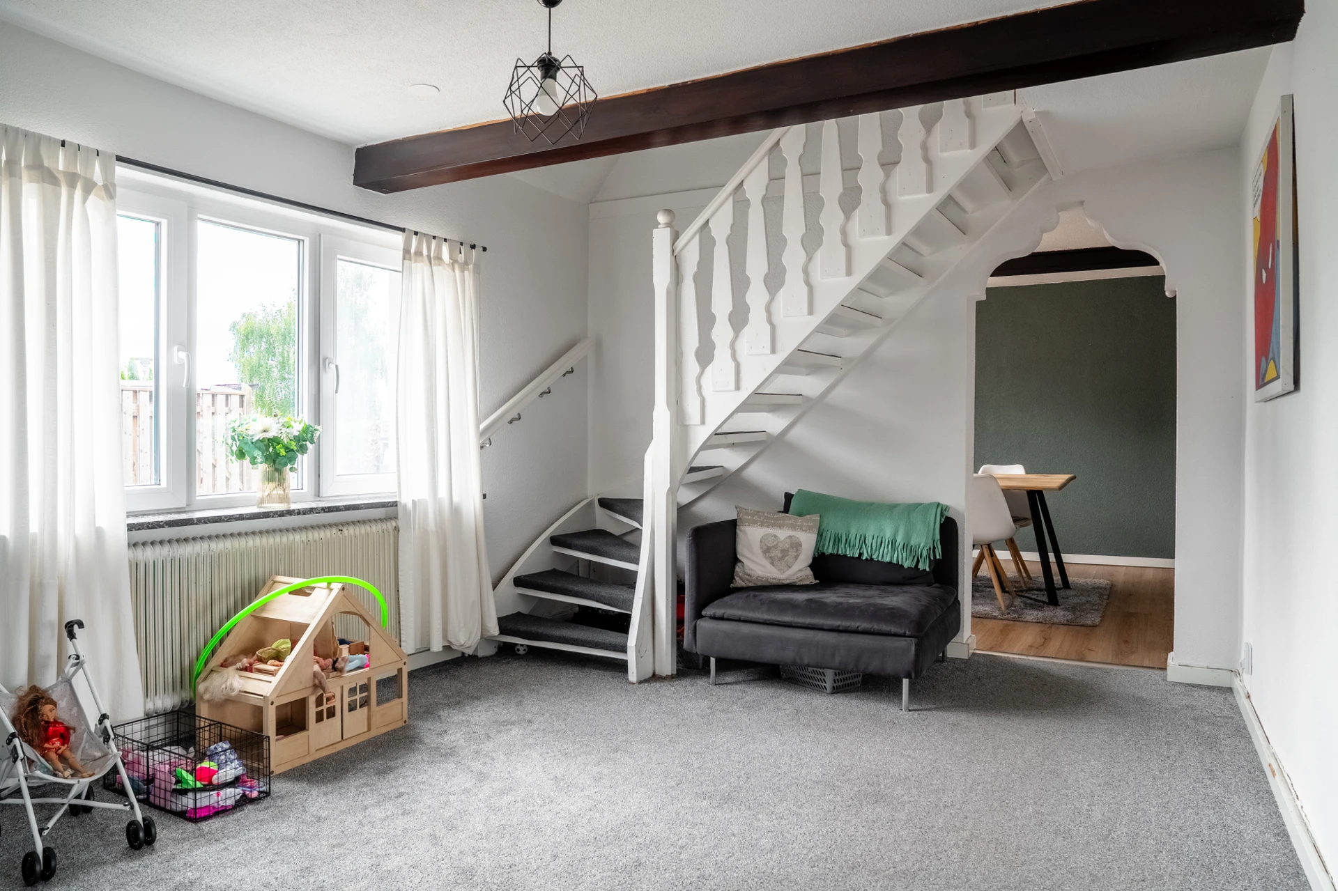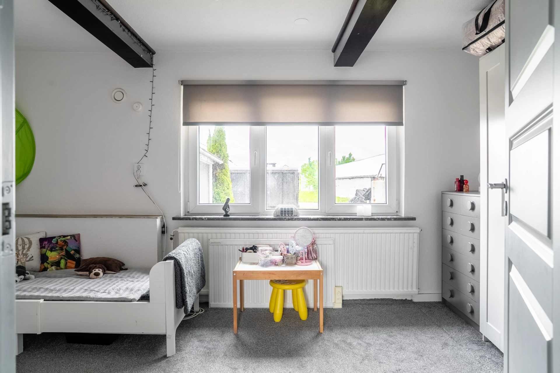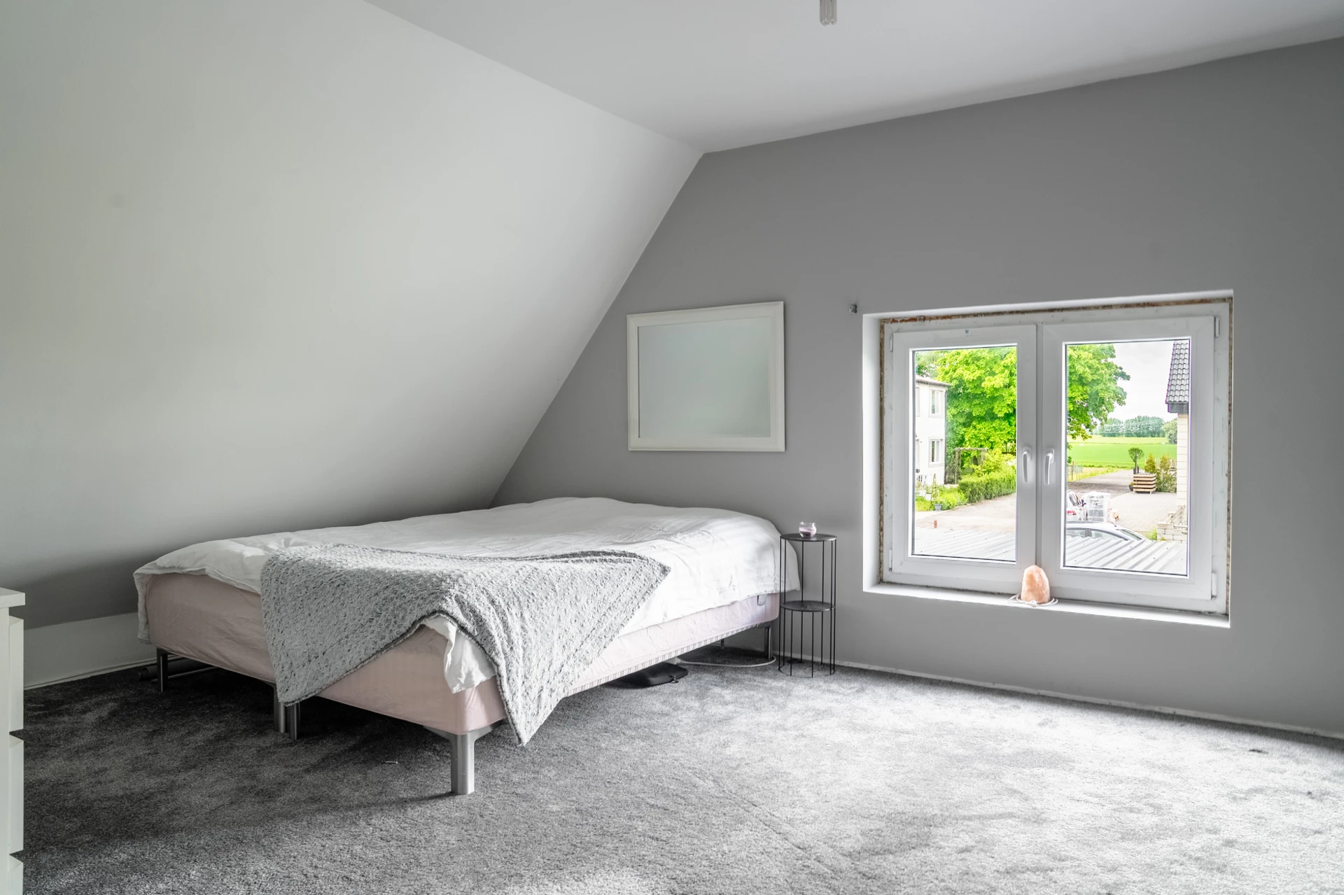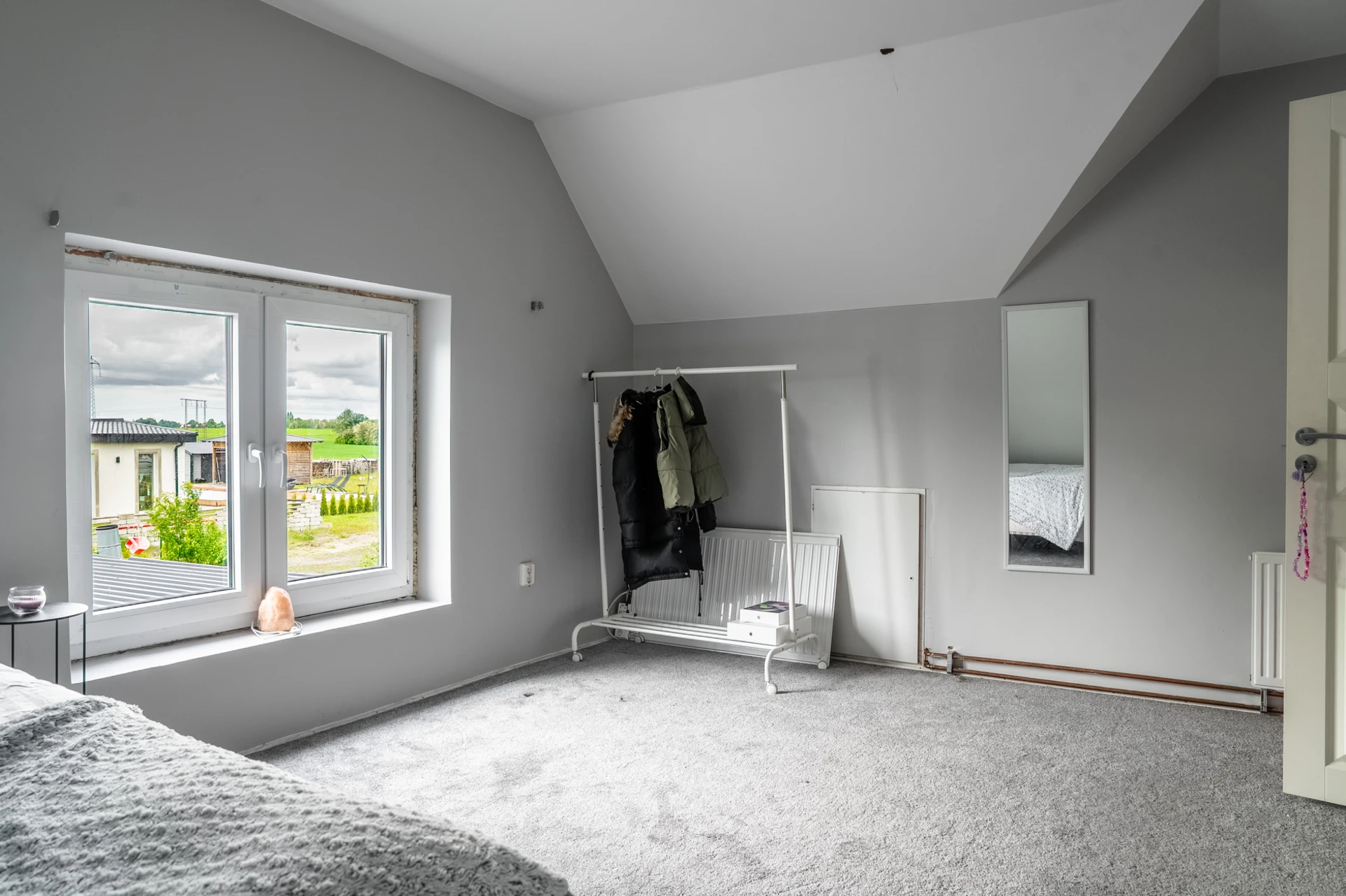 Grå heltäckningsmatta och ljusa väggar. Utgång till trädgård.