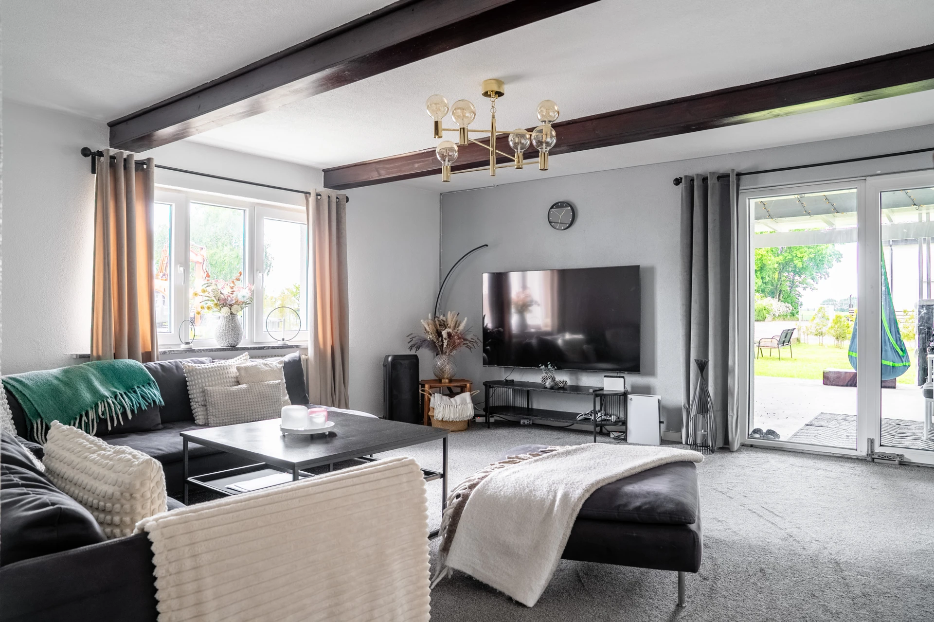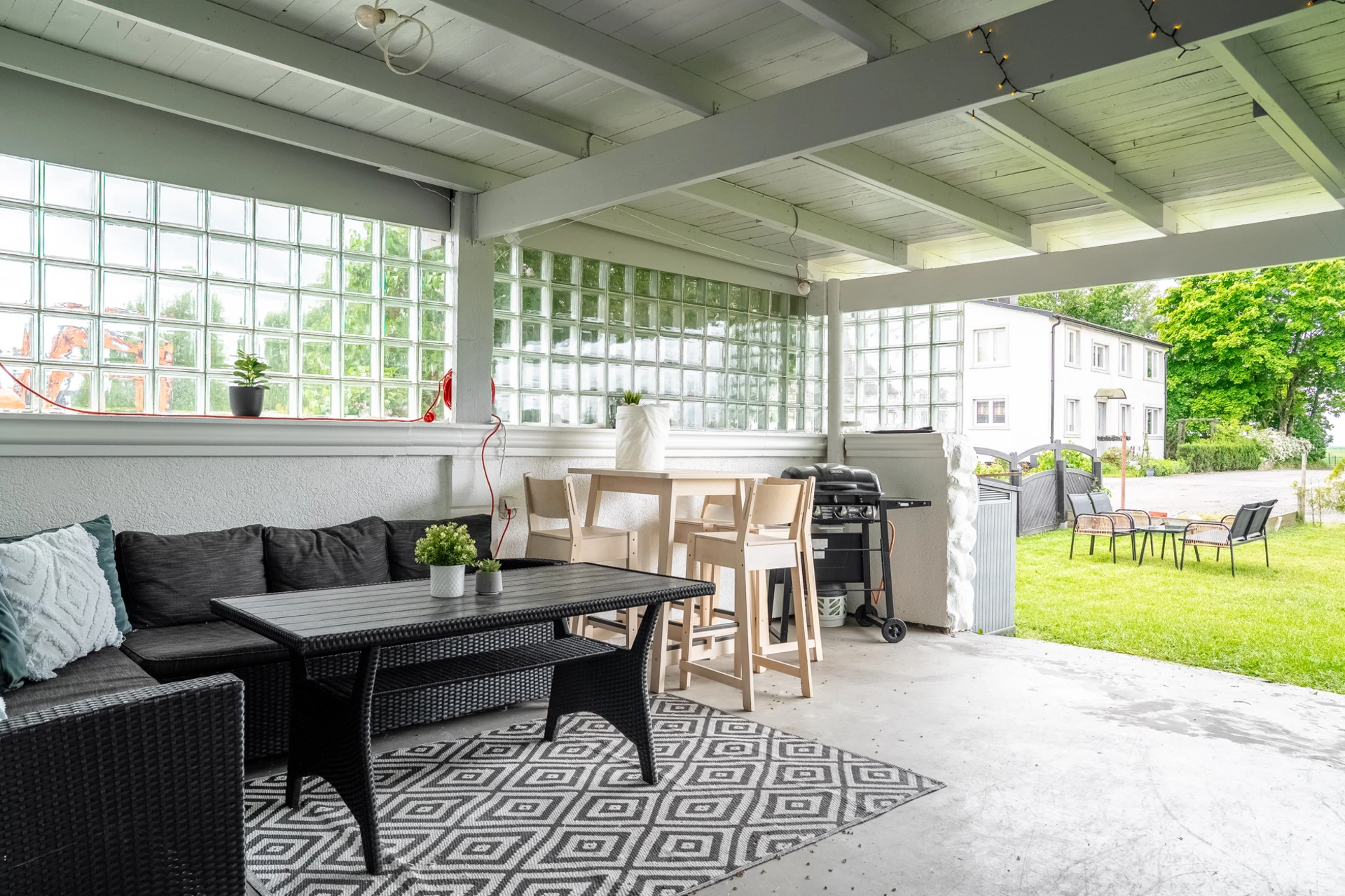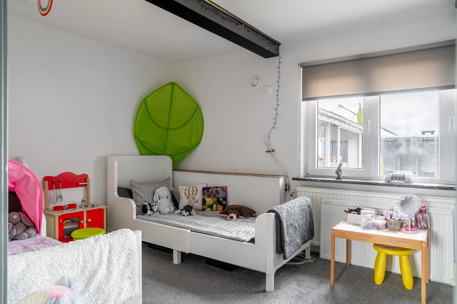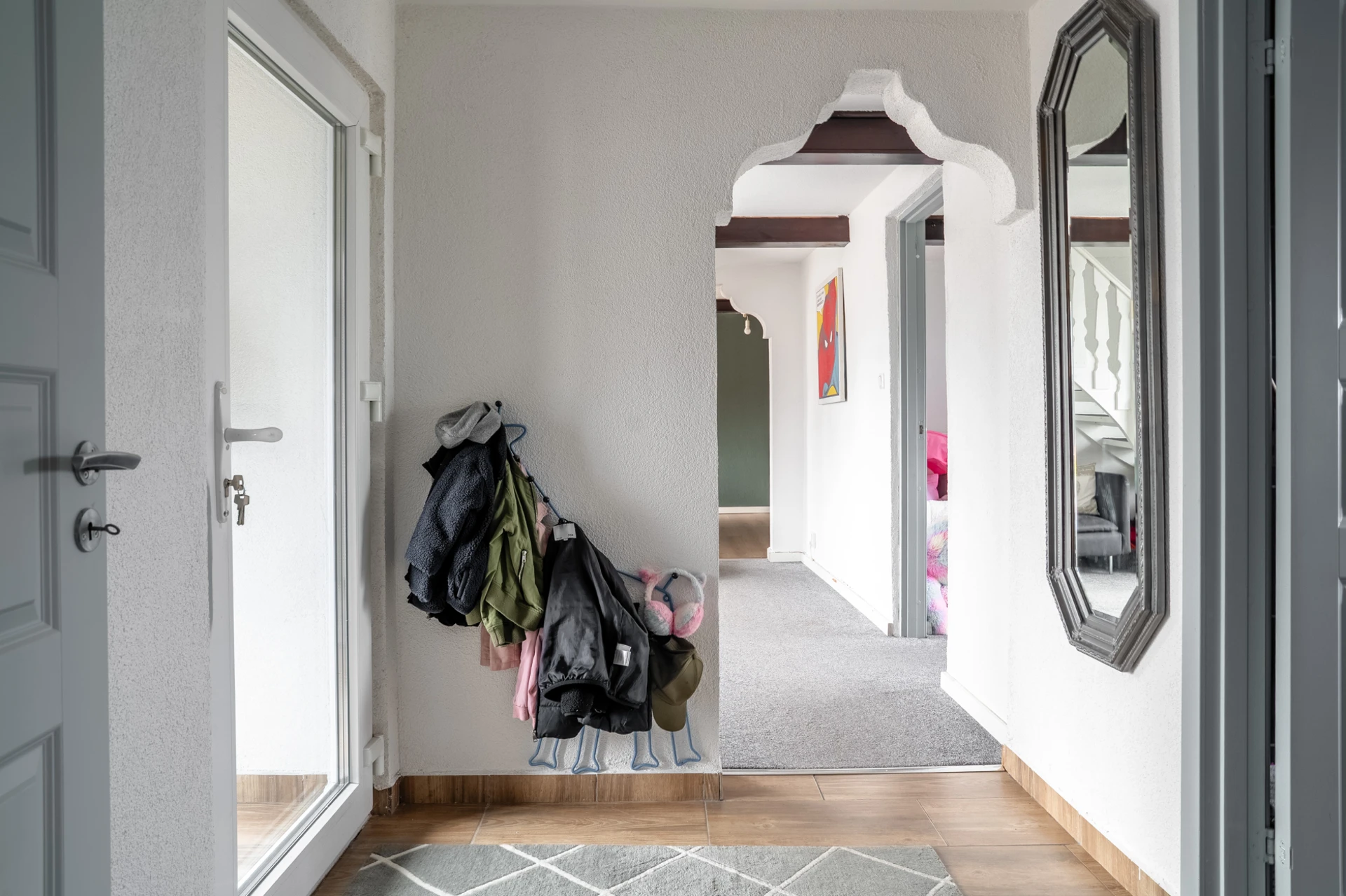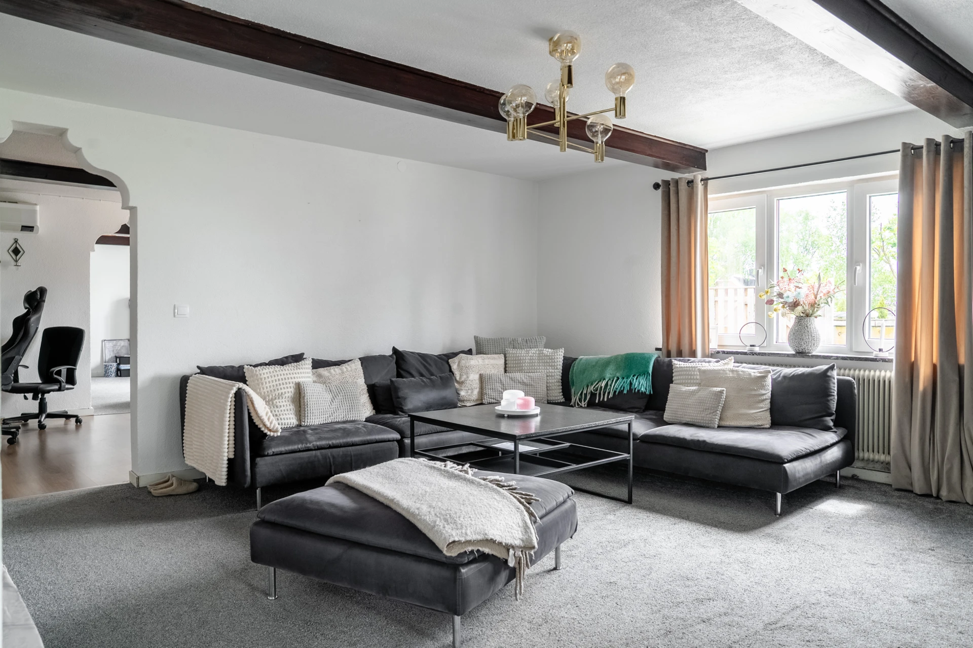 Grå heltäckningsmatta och ljusa väggar. Utgång till trädgård.