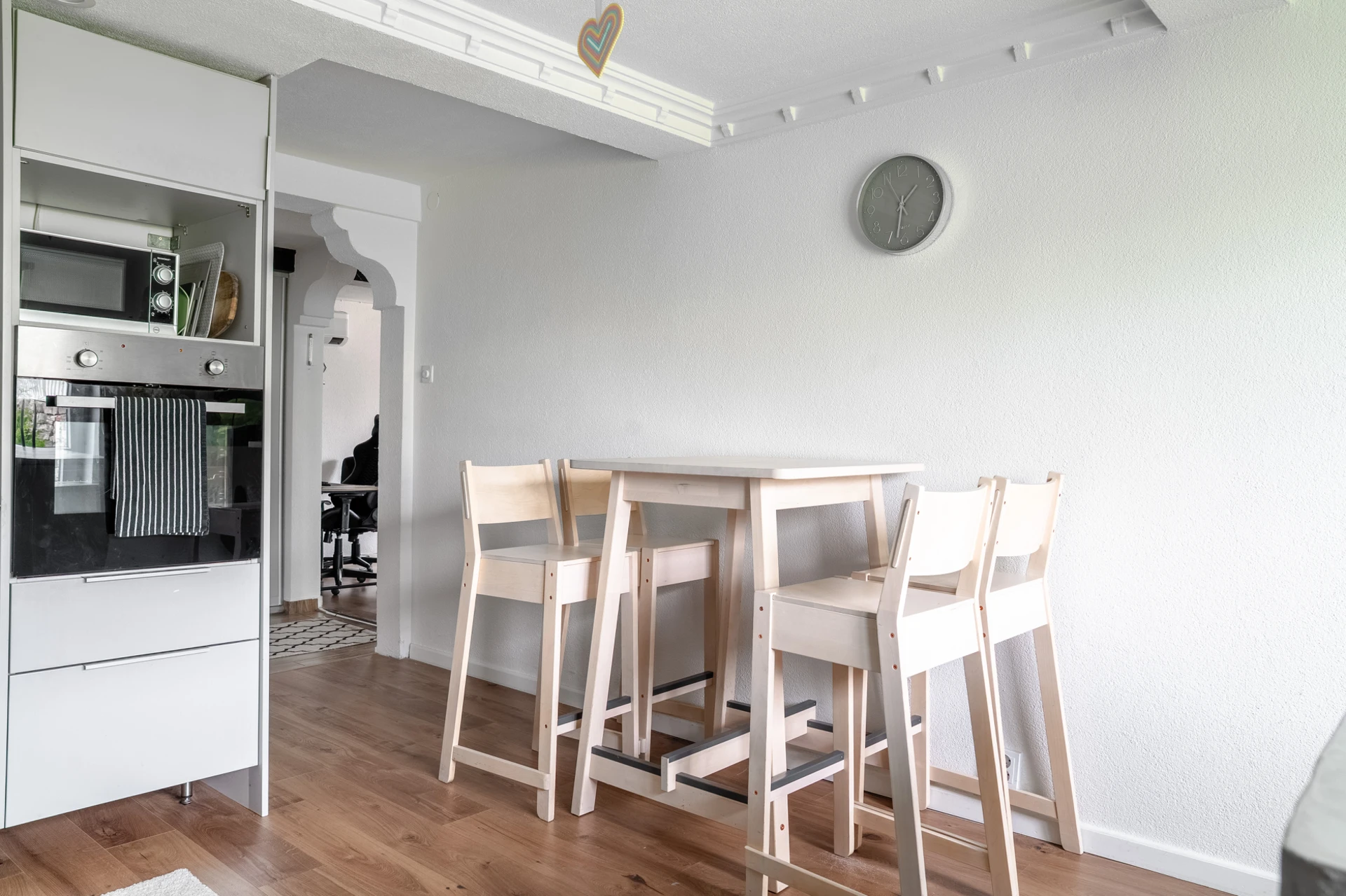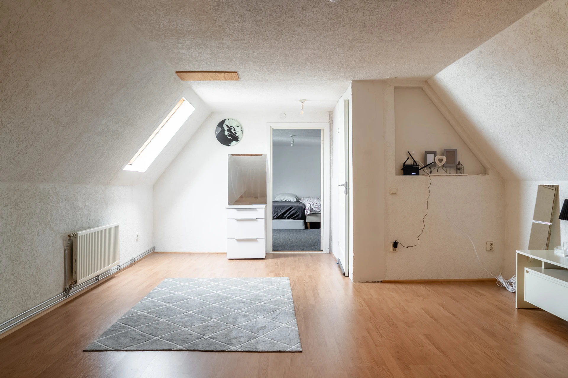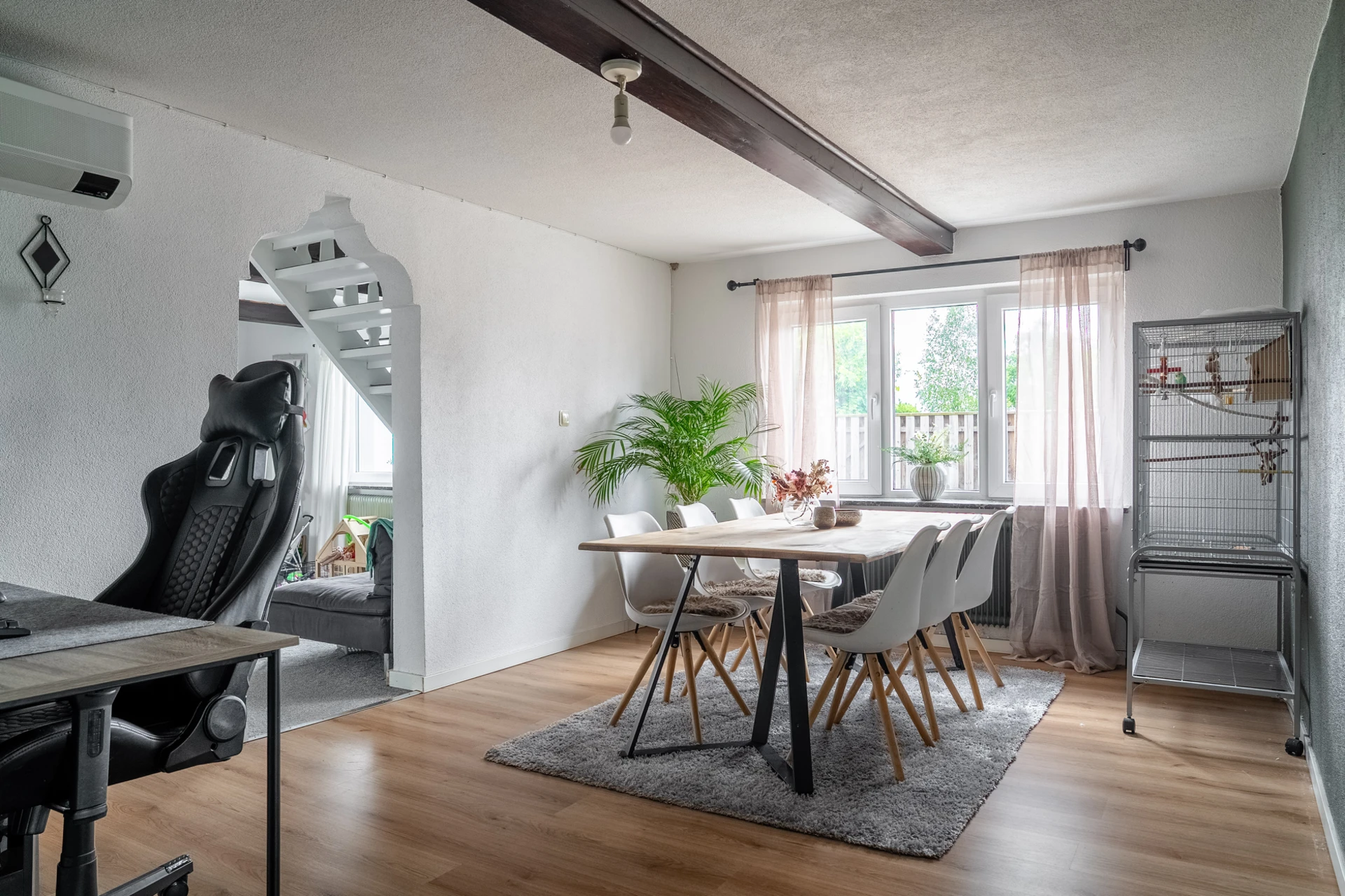 Laminatgolv och ljusa väggar.