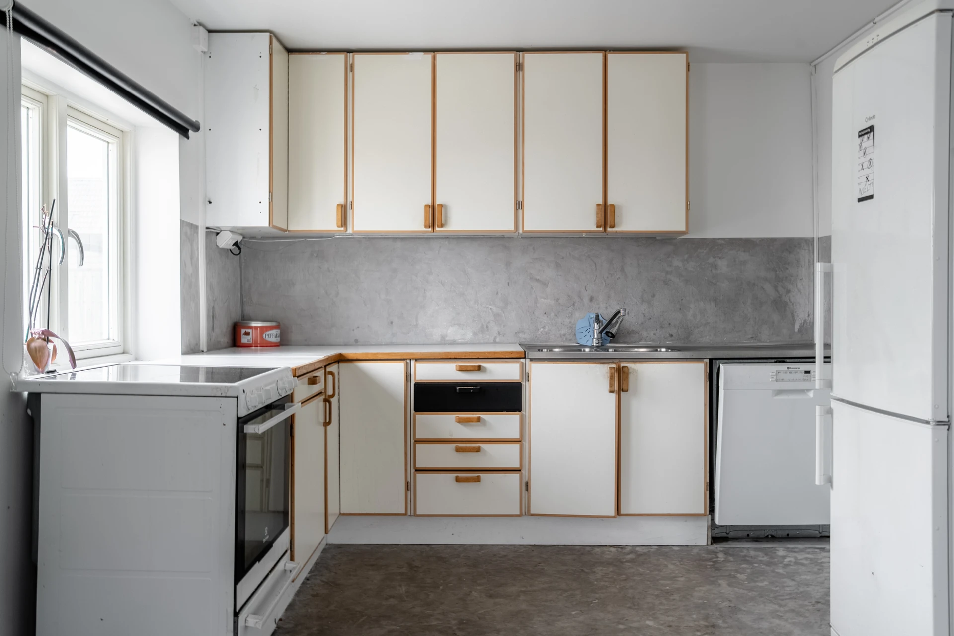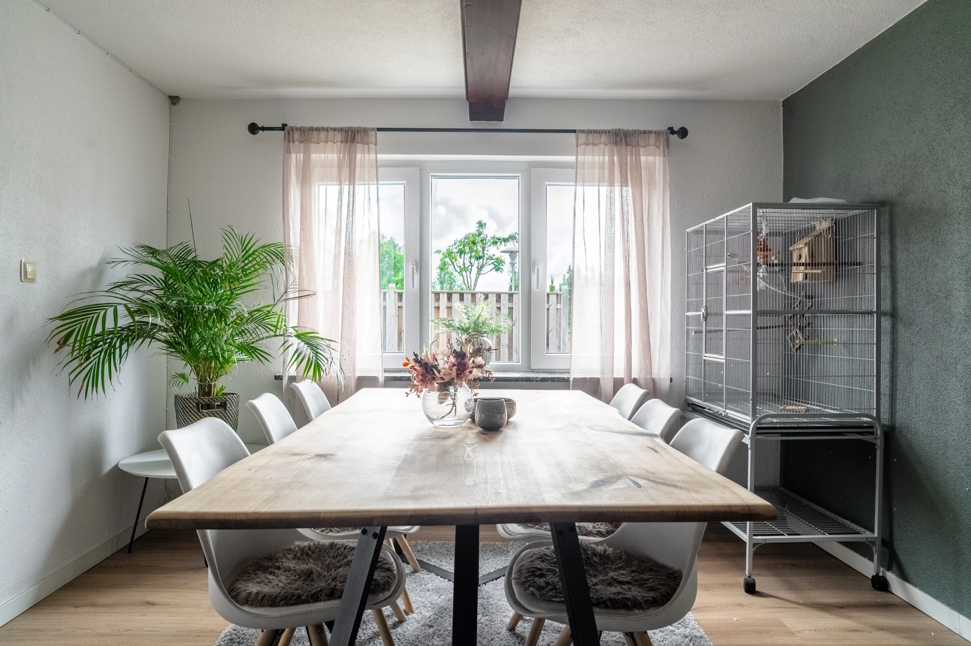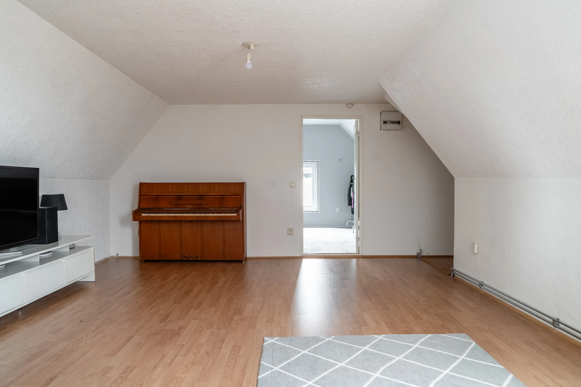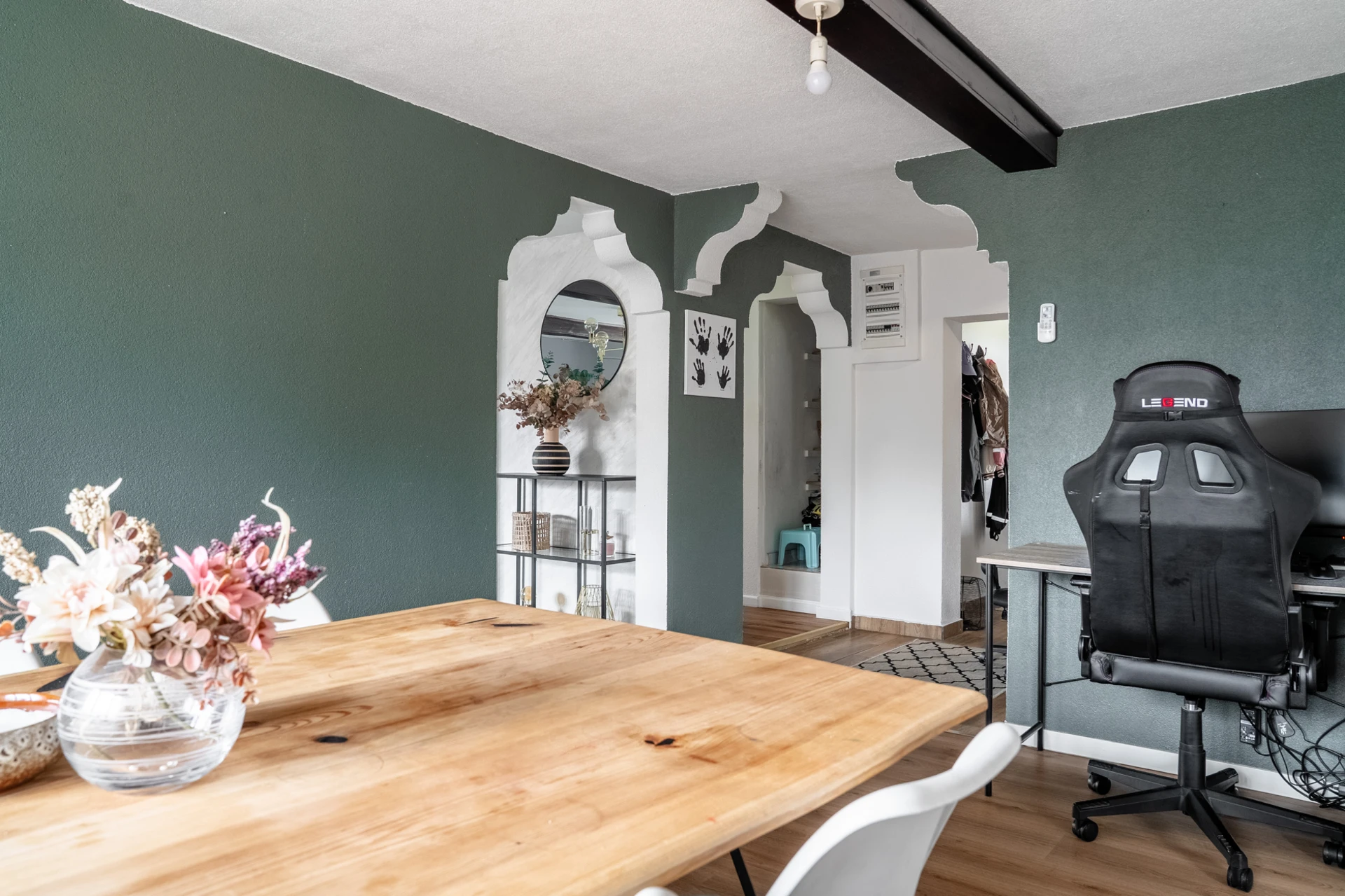 Laminatgolv och ljusa väggar.