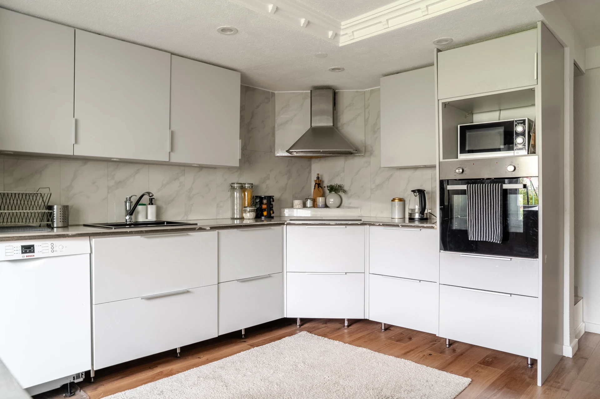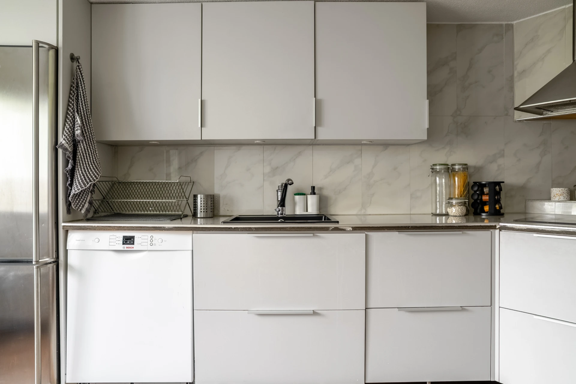 Laminatgolv och ljusa väggar. Grå köksinredning och stänkskydd i marmor ovan bänkskiva. Köket är utrustat med kyl/frys, spishäll, fläkt, inbyggd ugn och diskmaskin.