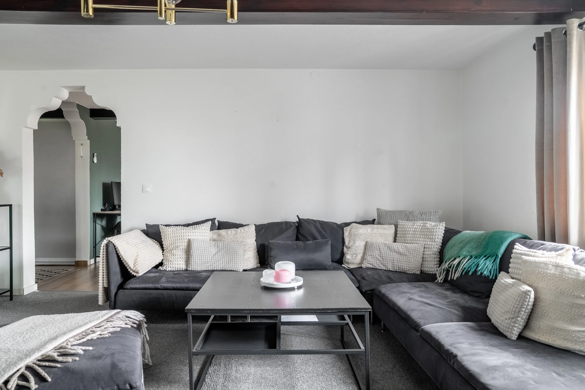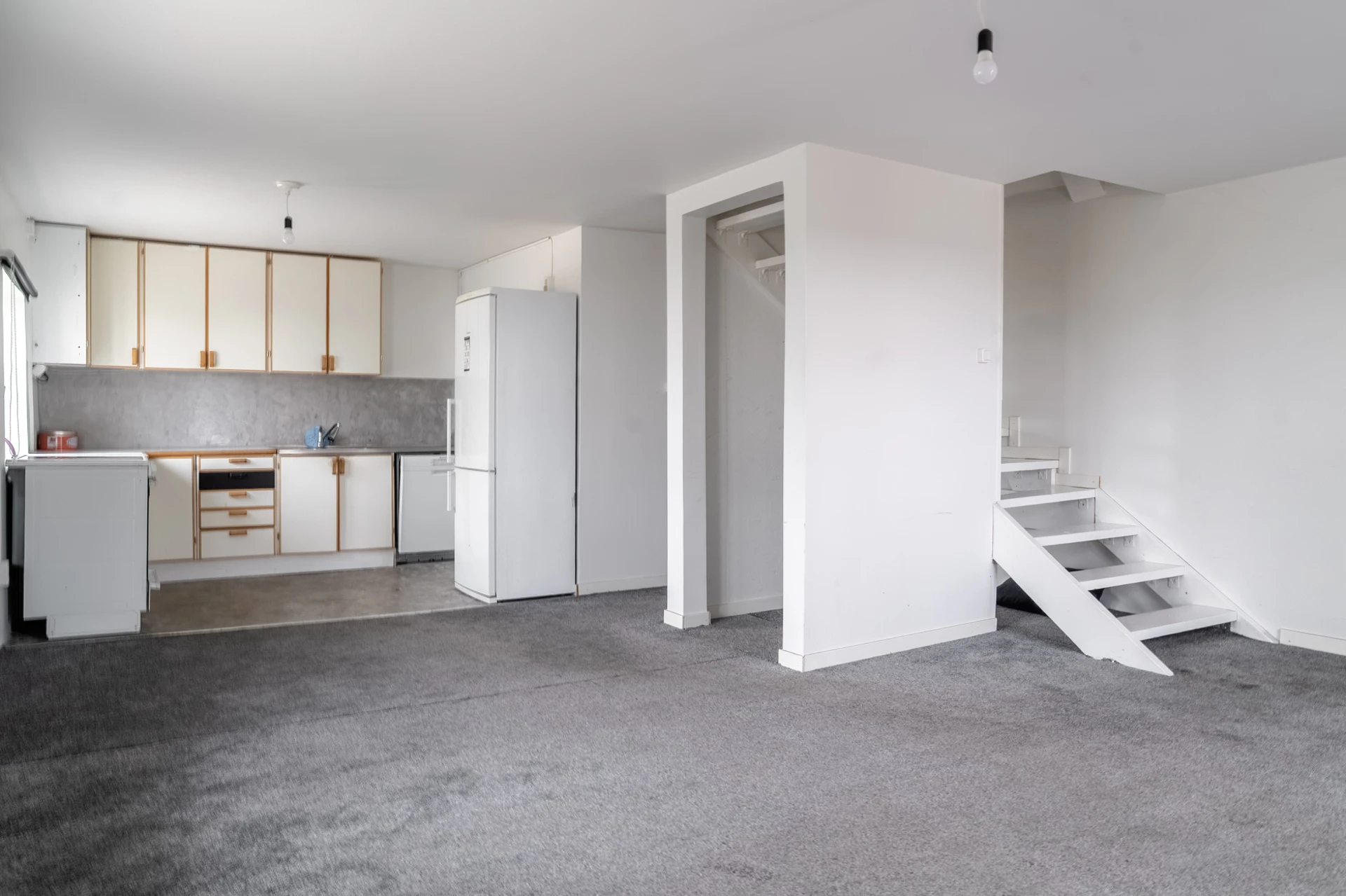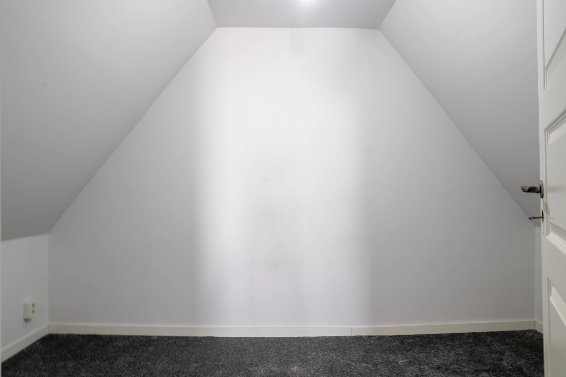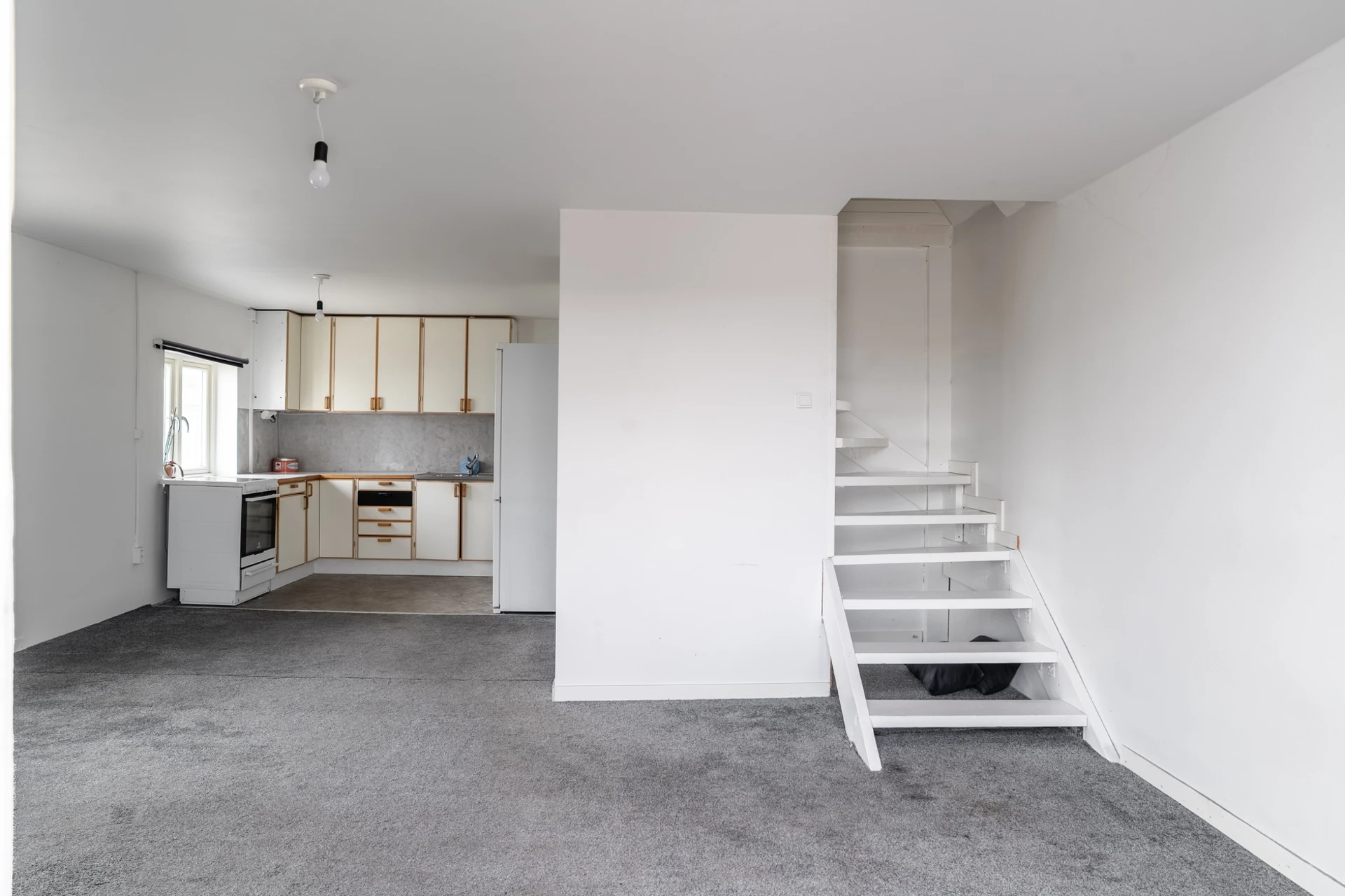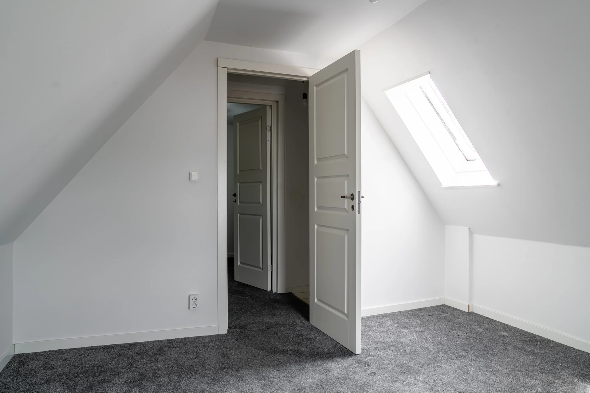 Grå heltäckningsmatta och ljusa väggar.