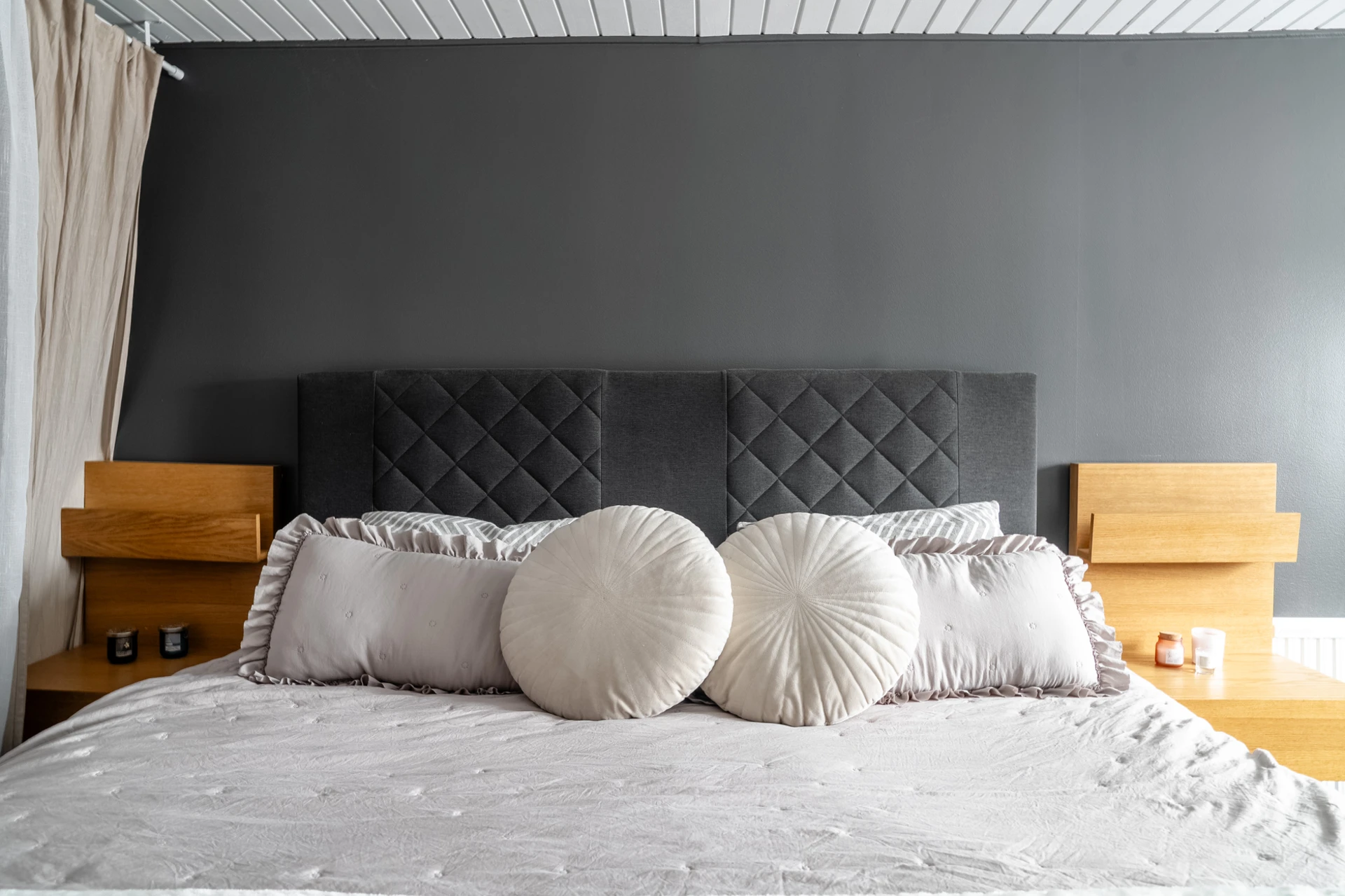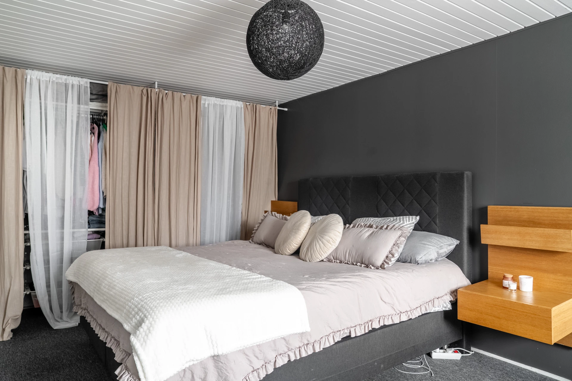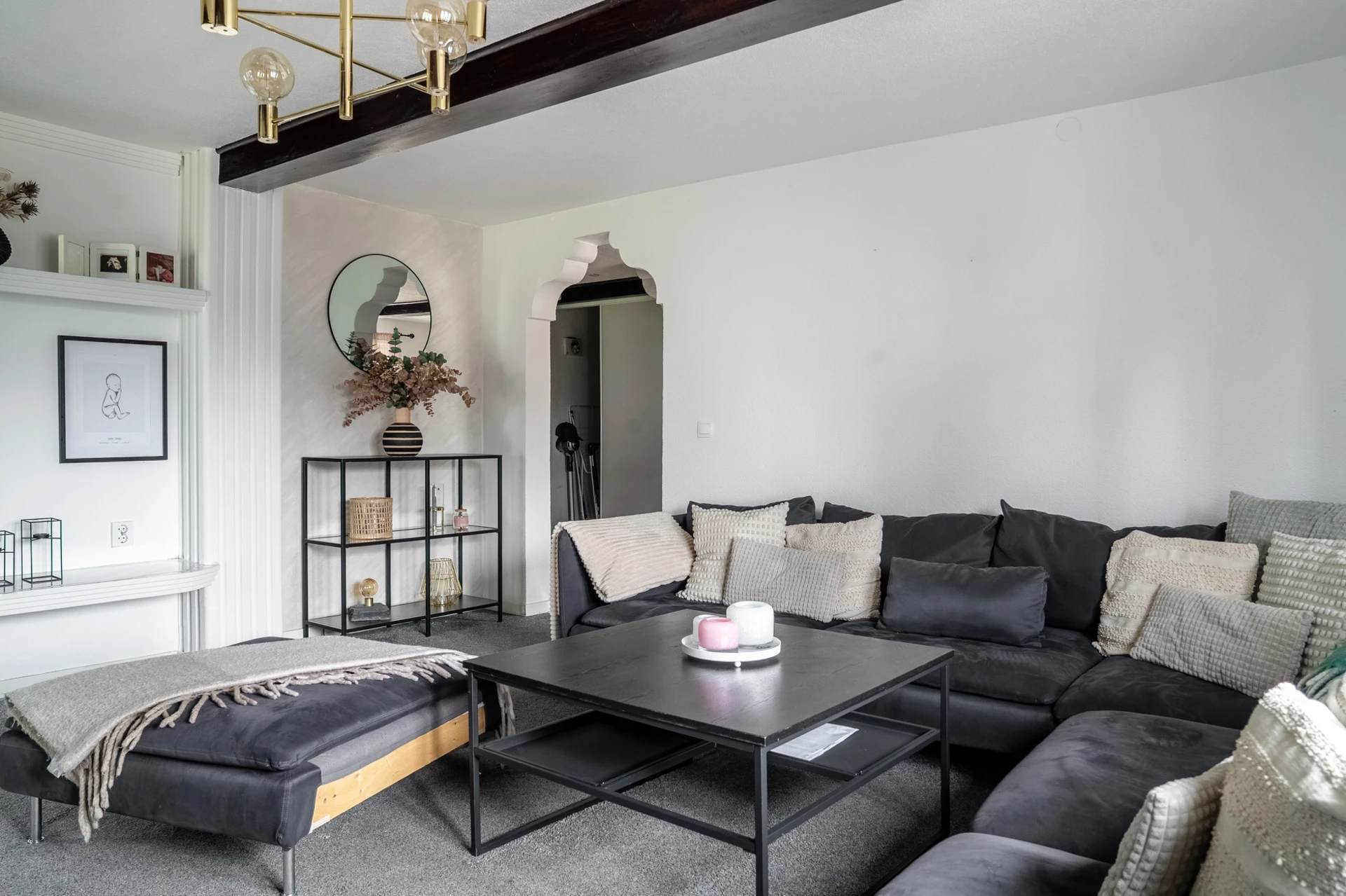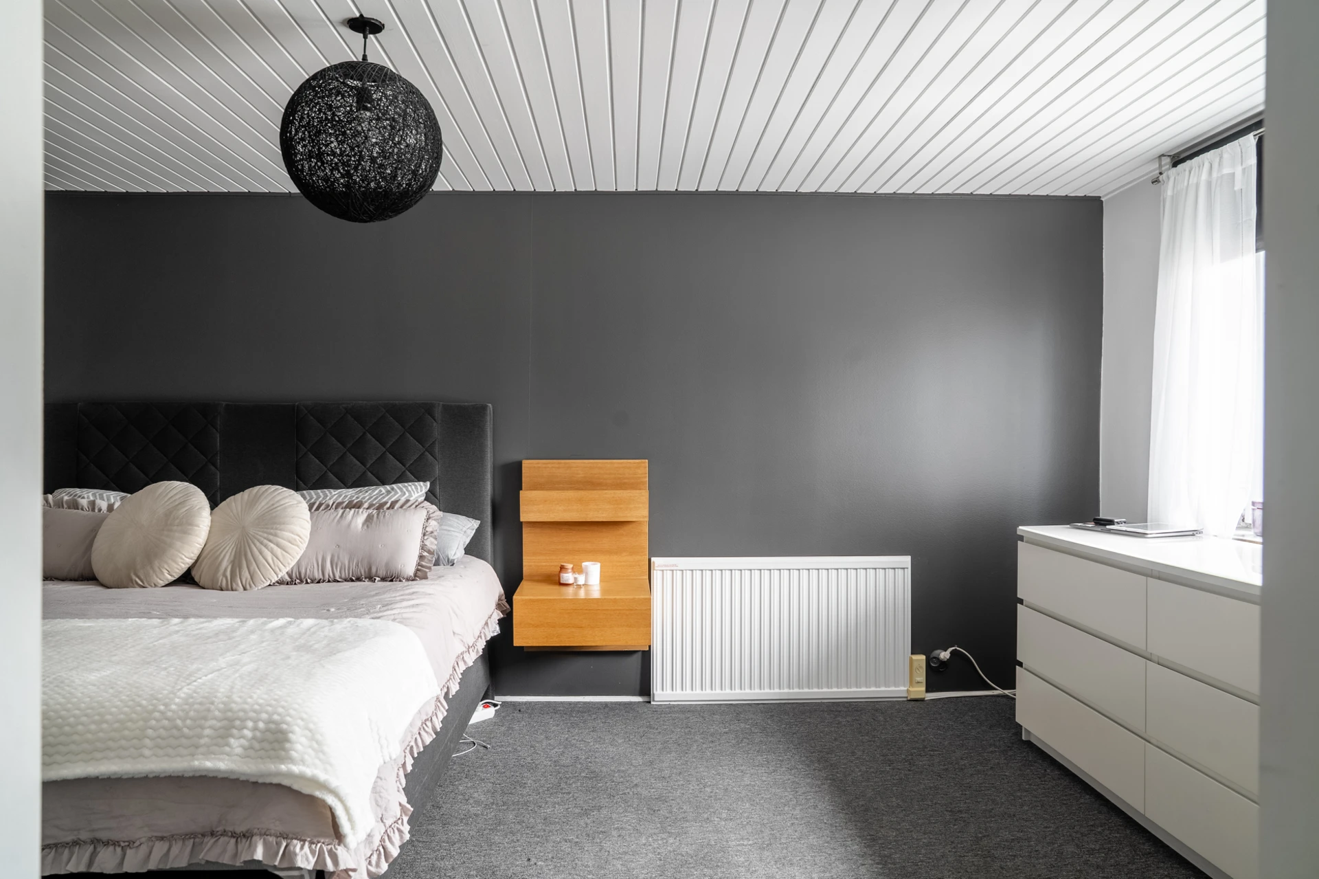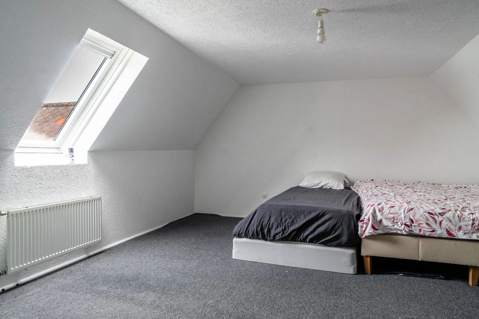 Grå heltäckningsmatta och ljusa väggar.