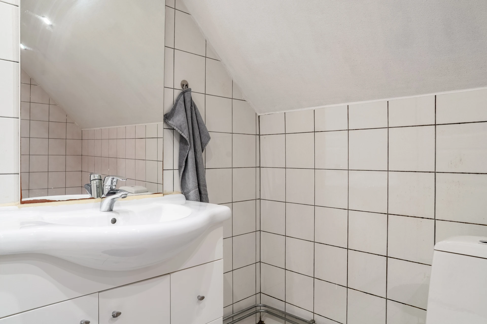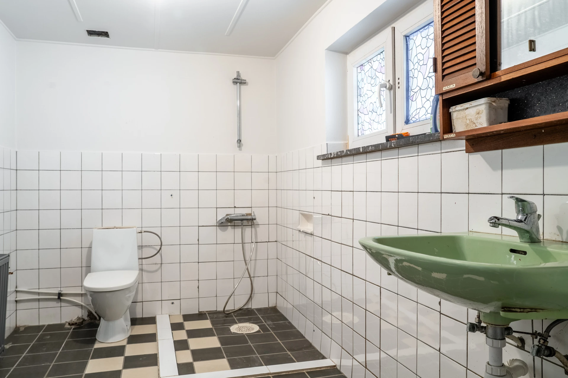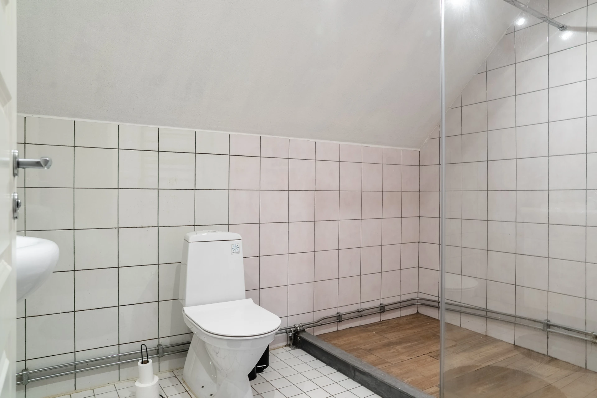 Vitt halvkaklat. Badrummet är utrustat med WC, dusch, handfat med underskåp och spegel.