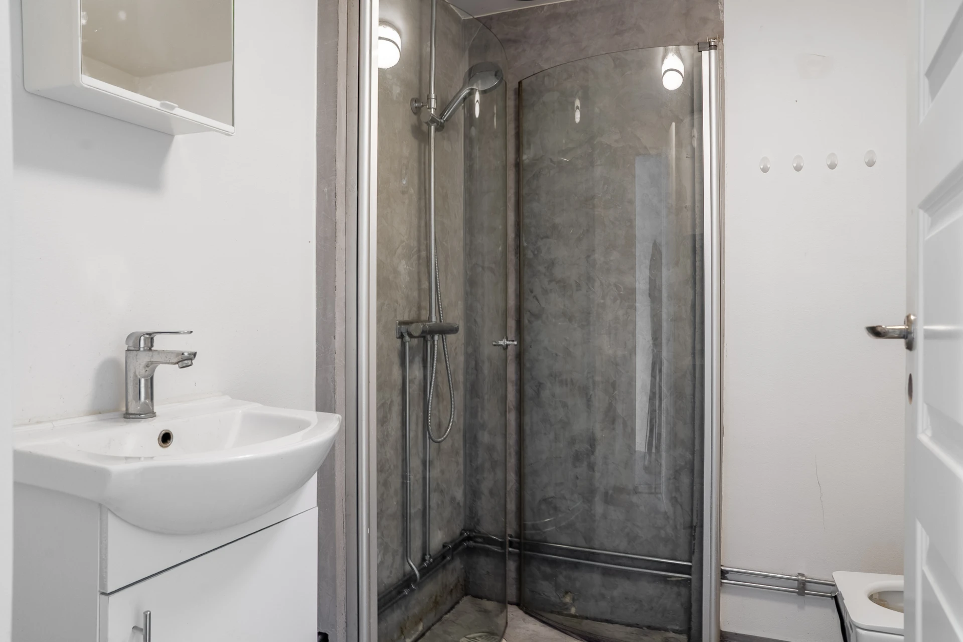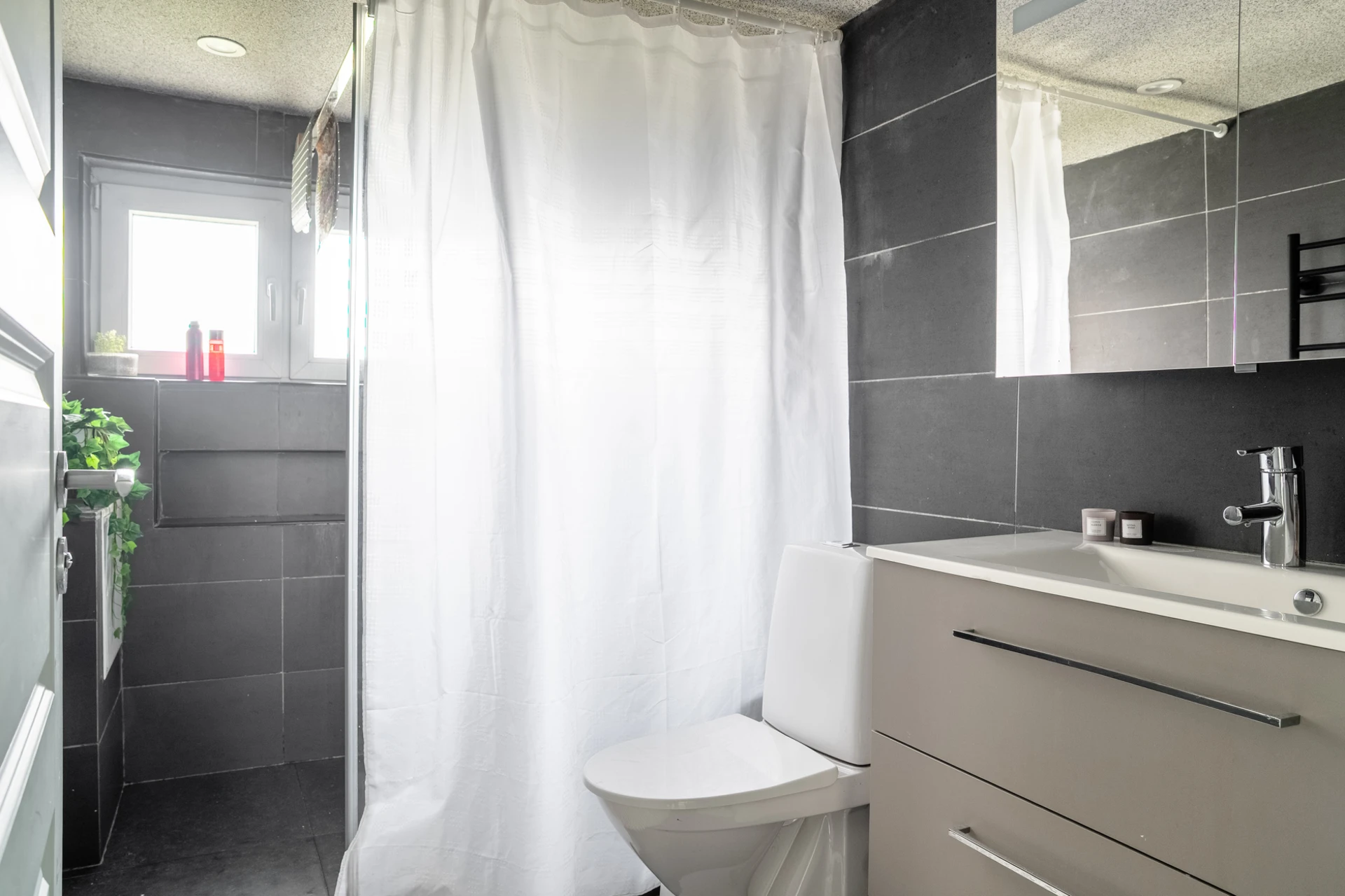 Helkaklat i grå nyans. Badrummet är utrustat med WC, dusch, handfat med kommod, spegelskåp och handdukstork.