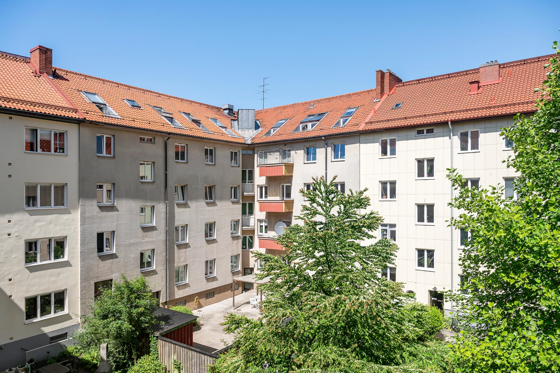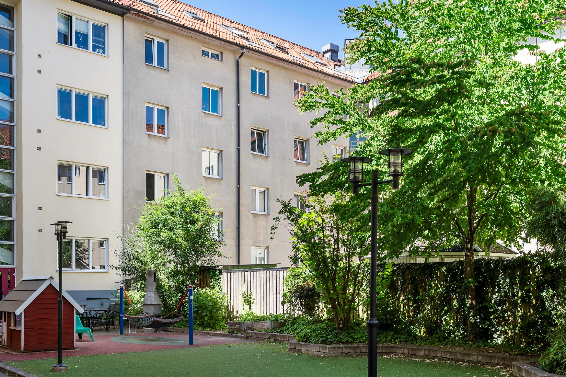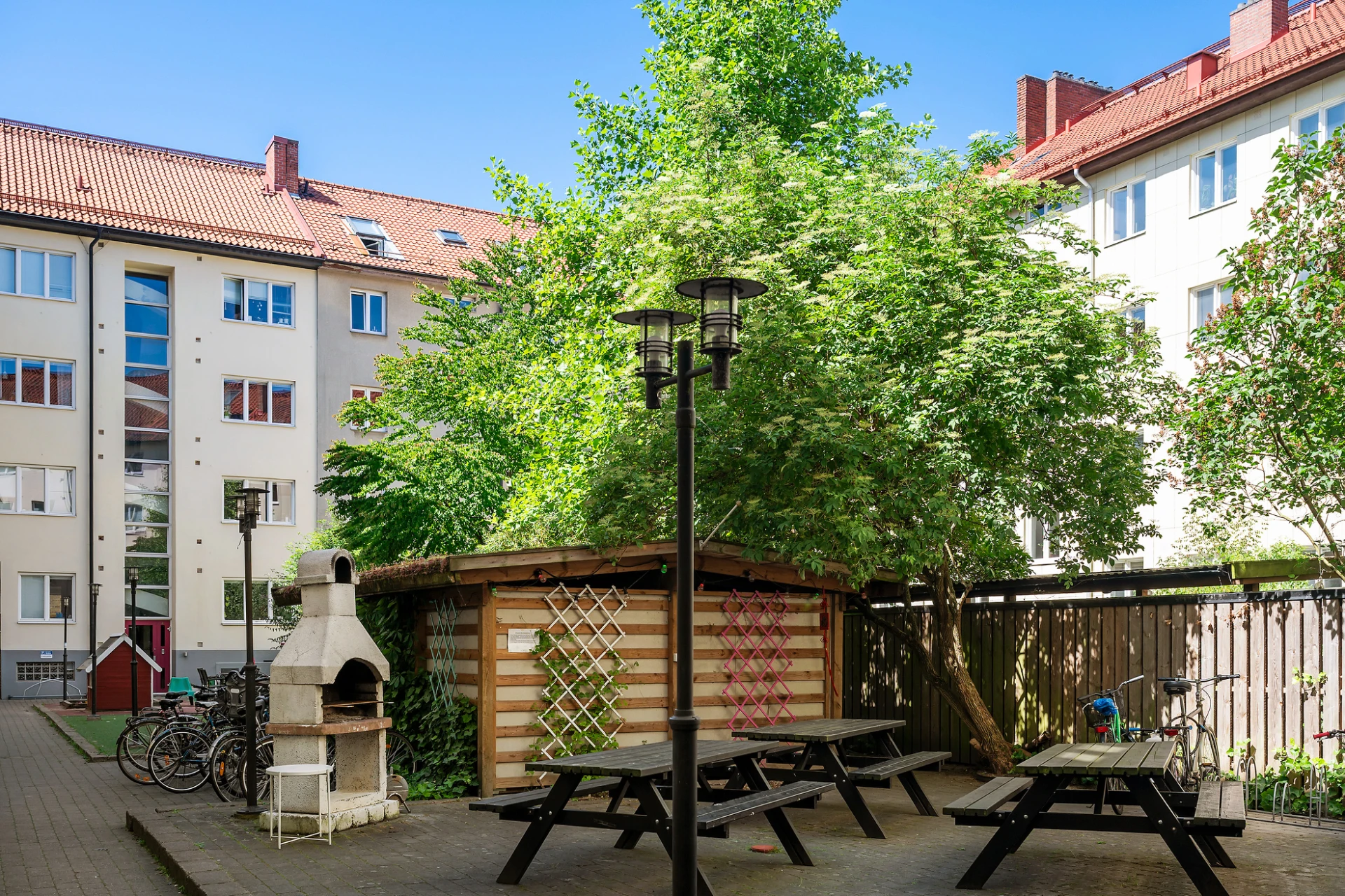 Föreningen har en stor härlig innergård med vacker grönska och fina stenbeläggningar. Det finns tillgång till två uteplatser, gemensamma utemöbler och murad grill, och lekplats med sandlåda och gungor finns för barn.