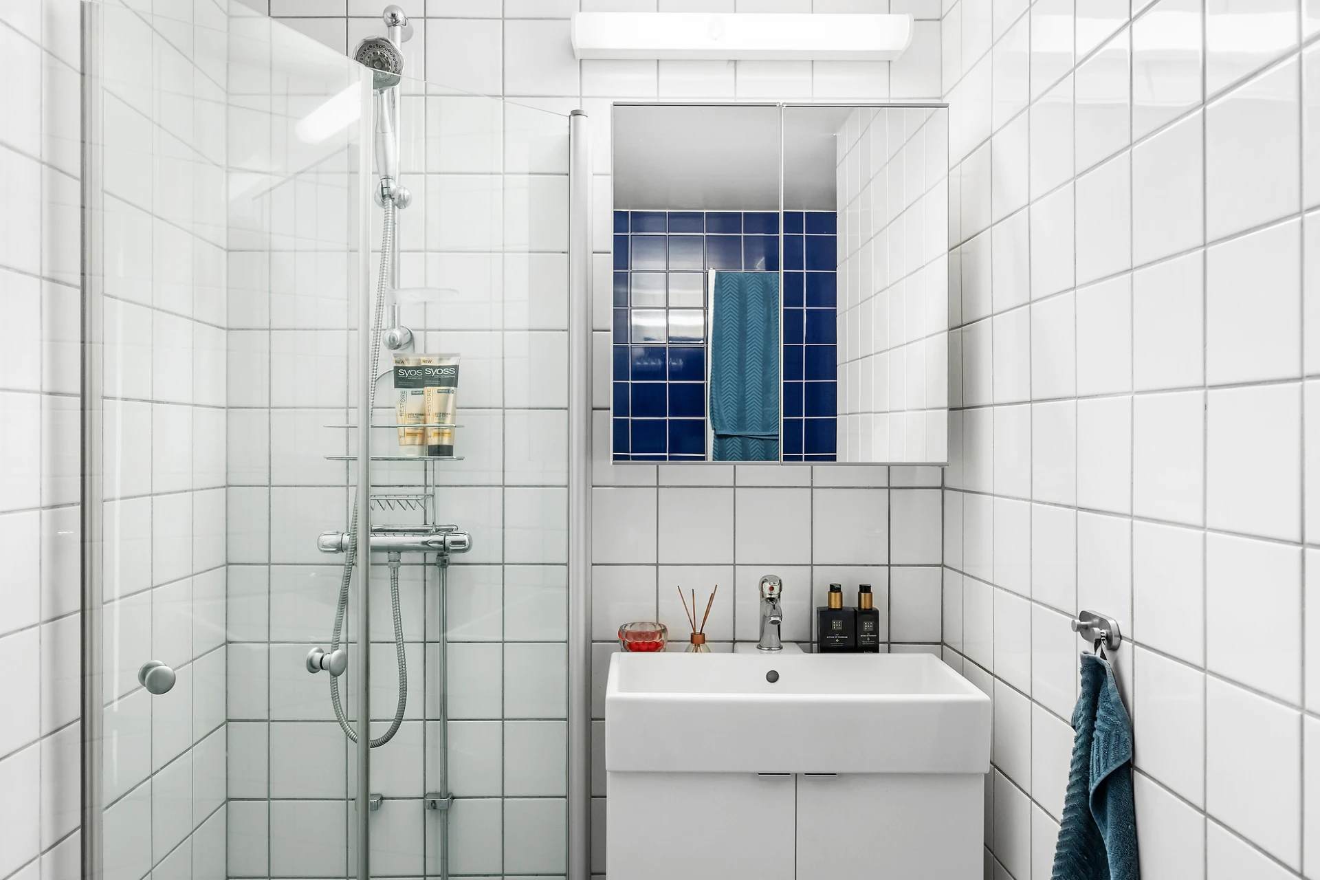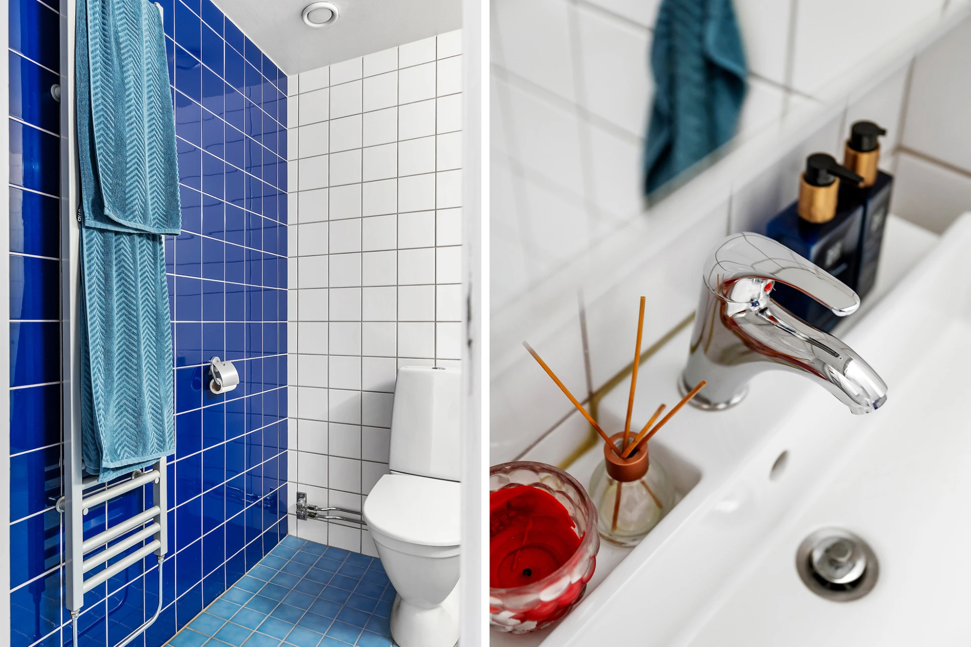 Helkaklat badrum utrustat med WC, dusch, handfat och handdukstork.