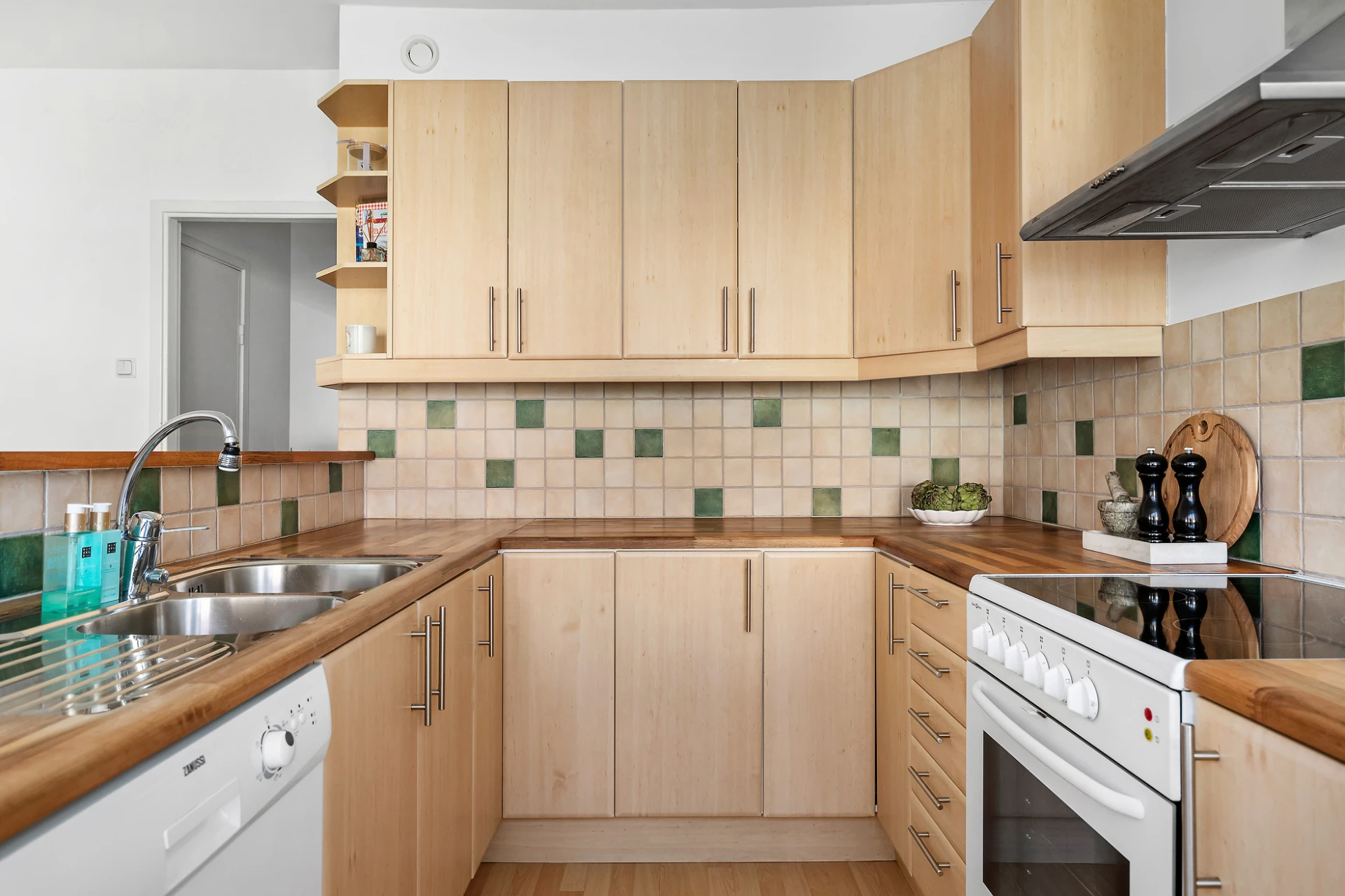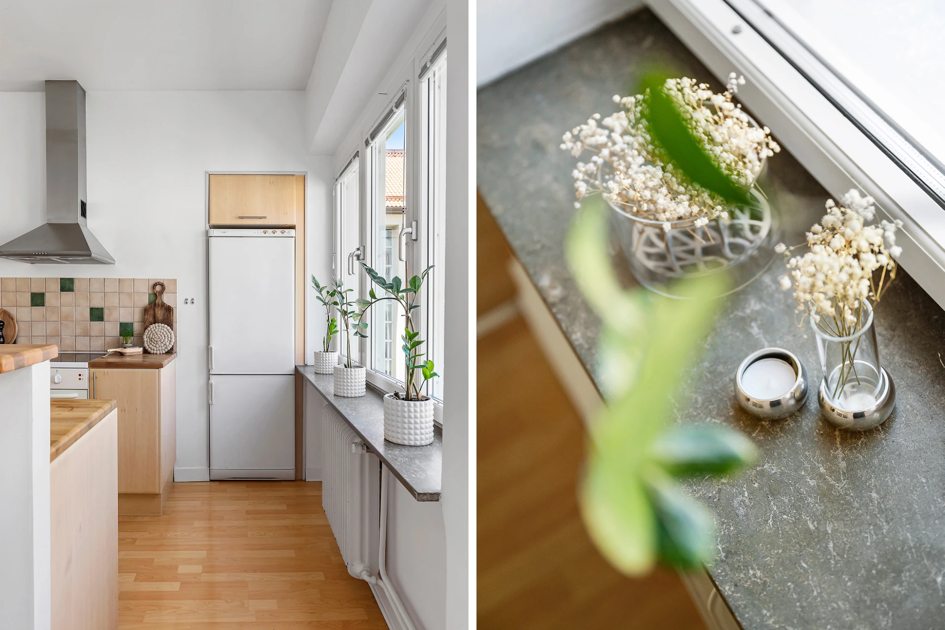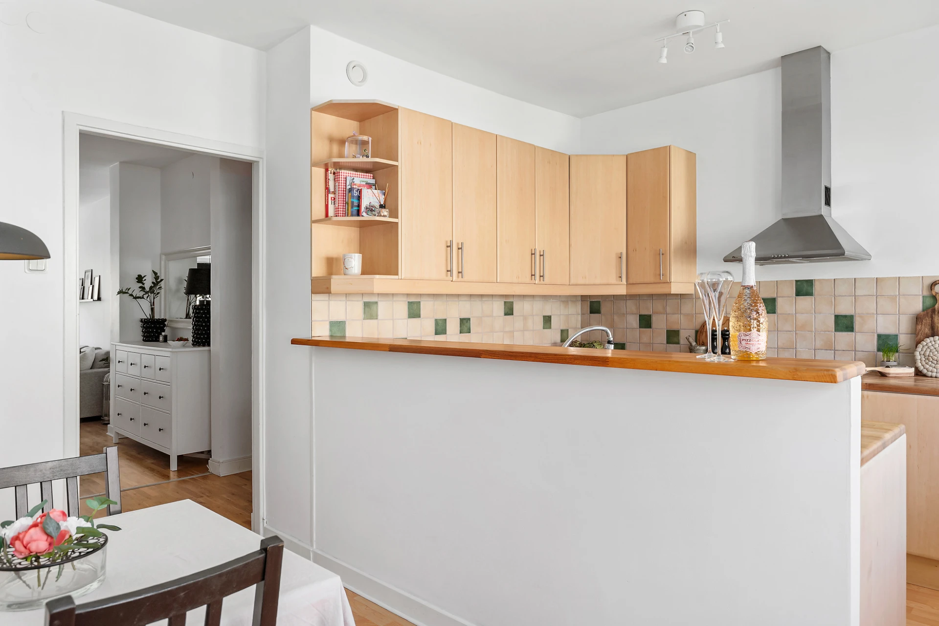 Parkettgolv och vita väggar. Ljusa köksluckor med bänkskiva i ek, samt kakel ovan arbetsbänk. Köket är utrustat med spis, köksfläkt, kyl/frys, diskmaskin och diskho. Här finns plats för stort matbord.