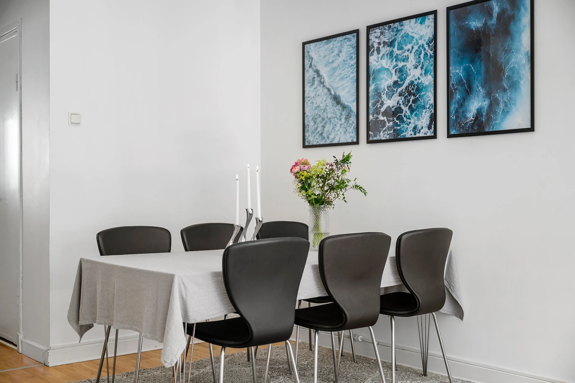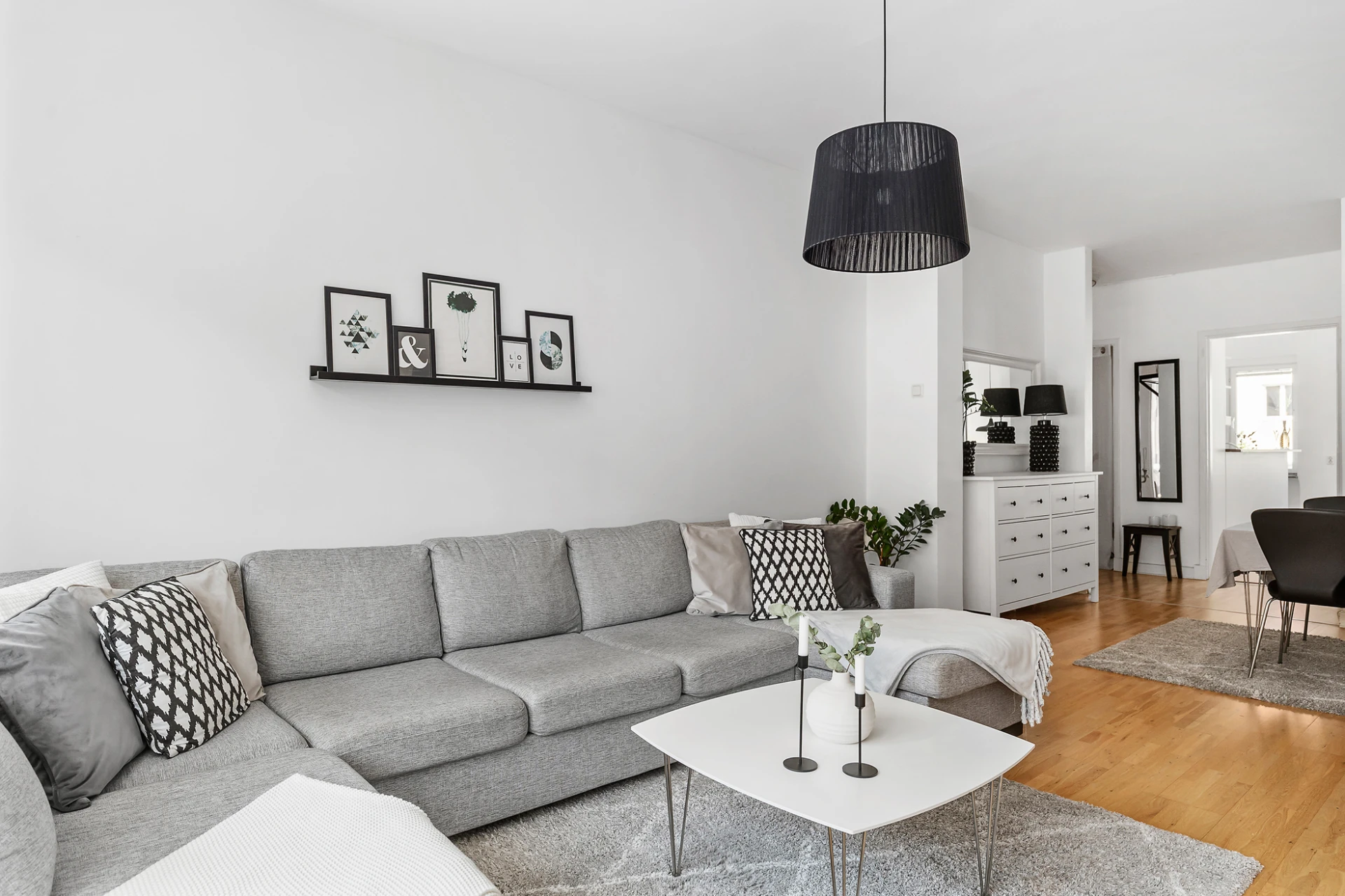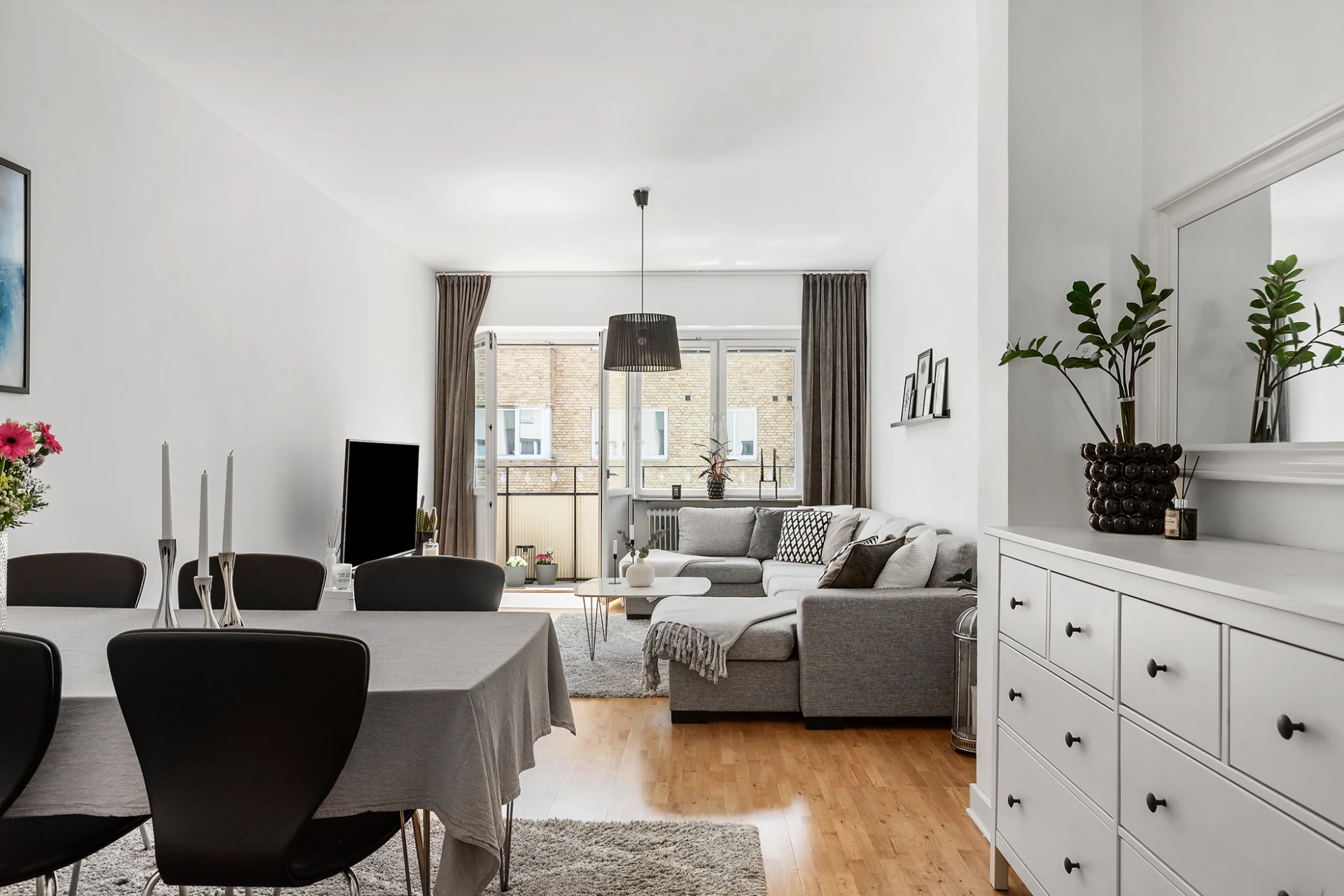 Parkettgolv och vita väggar. Här finns plats för matbord och soffgrupp samt utgång till balkongen.