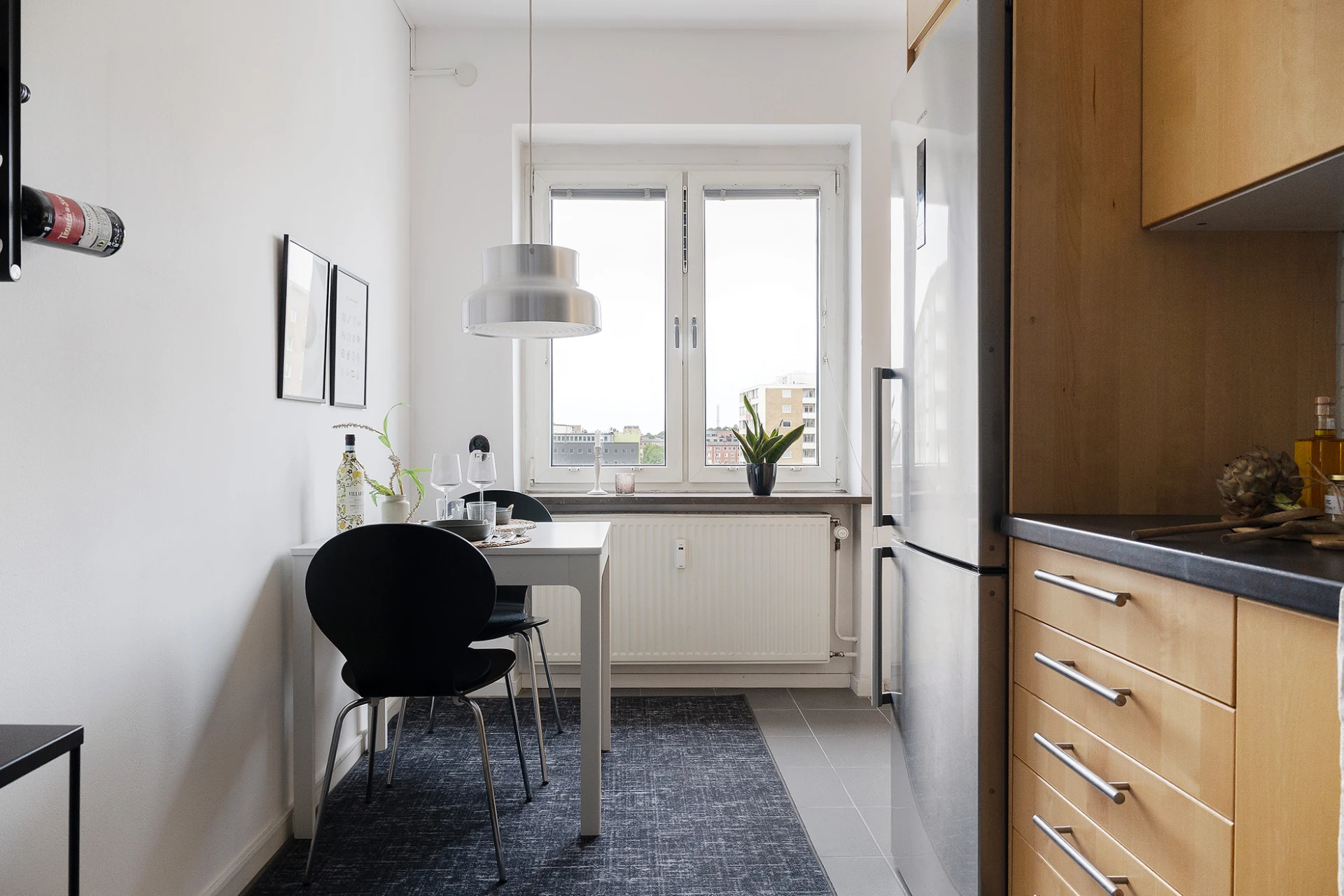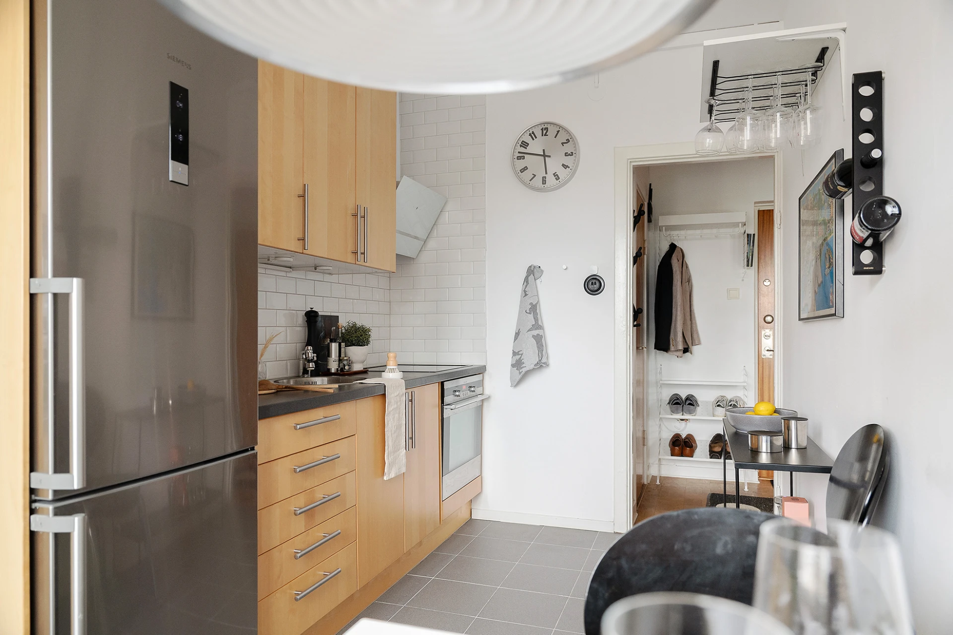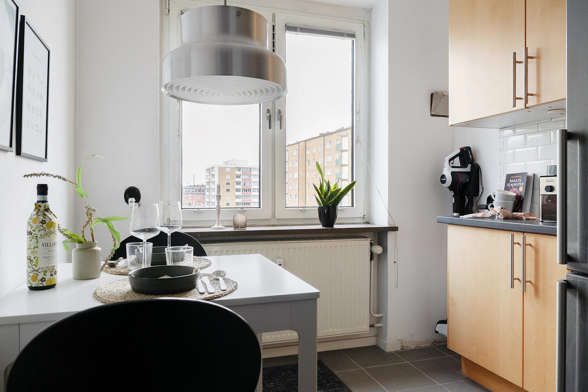 Köket ligger i eget utrymme och erbjuder gott om plats för både matlagning och umgänge – ett trivsamt nav för kvällsmiddagar eller helgfrukostar.