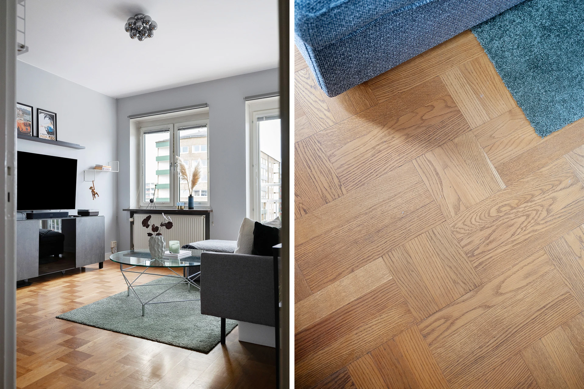 Parkettgolv och ljusgråa väggar. Fransk balkong.