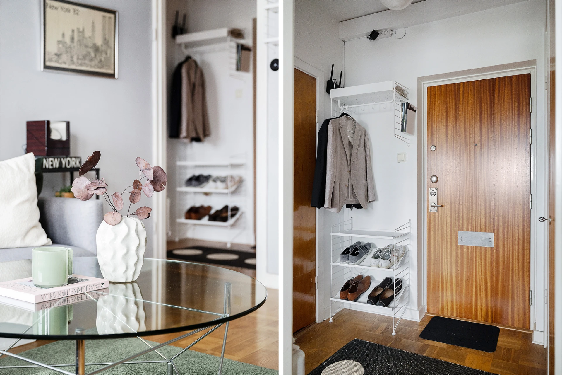 Parkettgolv och mönstrad tapet. Plats för avhängning och förvaringsutrymme i inbyggd garderob.
