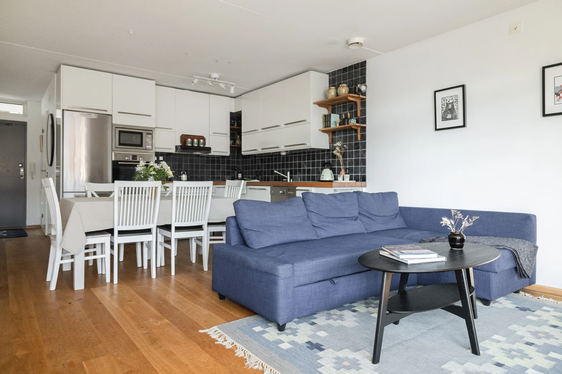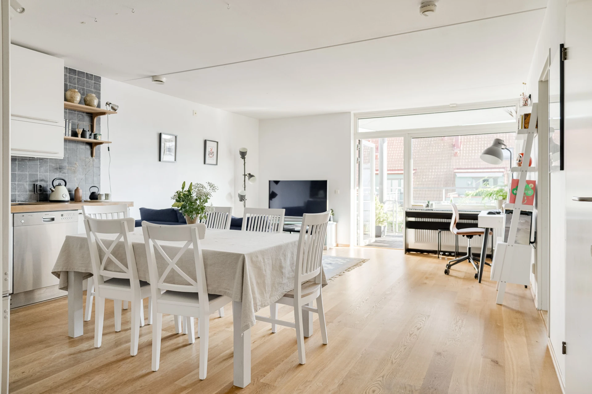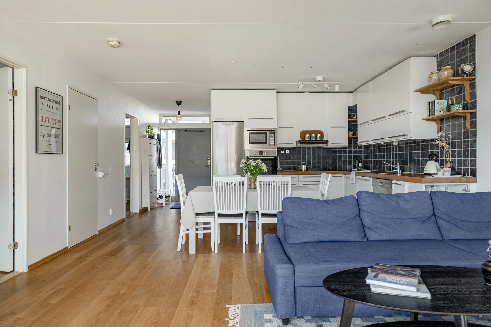 Bostaden erbjuder en genomgående planlösning där kök och vardagsrum möts i en öppen och social yta. Här finns plats för ett stort matbord mitt i rummet, den naturliga samlingspunkten för både vardag och fest. Från vardagsrummet når du den stora och soliga balkongen i söderläge, perfekt för avkoppling och sociala stunder under dygnets alla timmar. De två rymliga sovrummen ger gott om plats för både vila och hemmakontor om så önskas. Dessutom finns en generös klädkammare som kompletterar förvaringsmöjligheterna på bästa sätt. Det helkaklade badrummet är utrustat med inbyggt badkar samt kombinerad tvätt- och torkmaskin, vilket gör vardagen både smidigare och bekvämare.