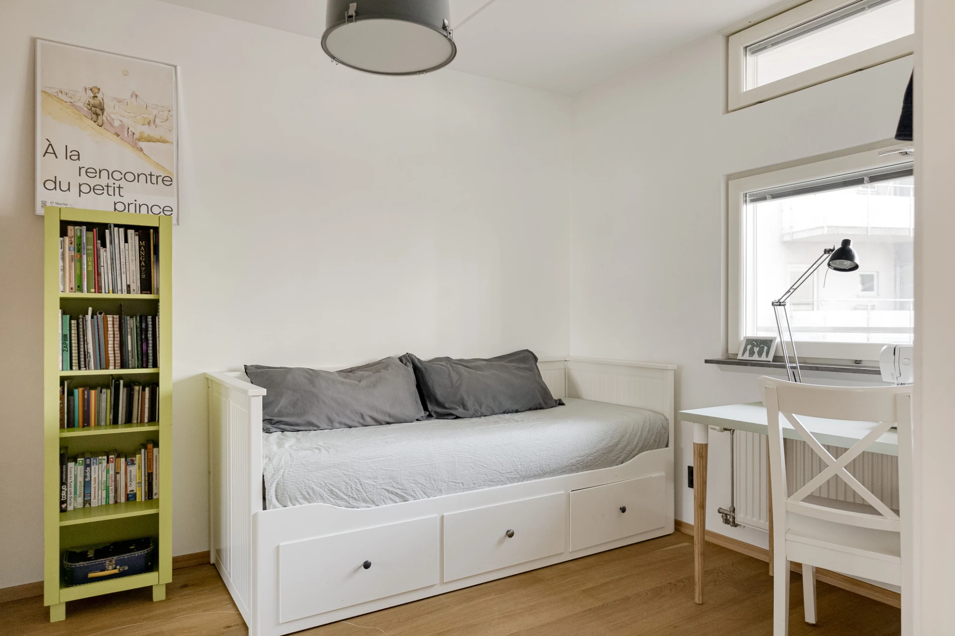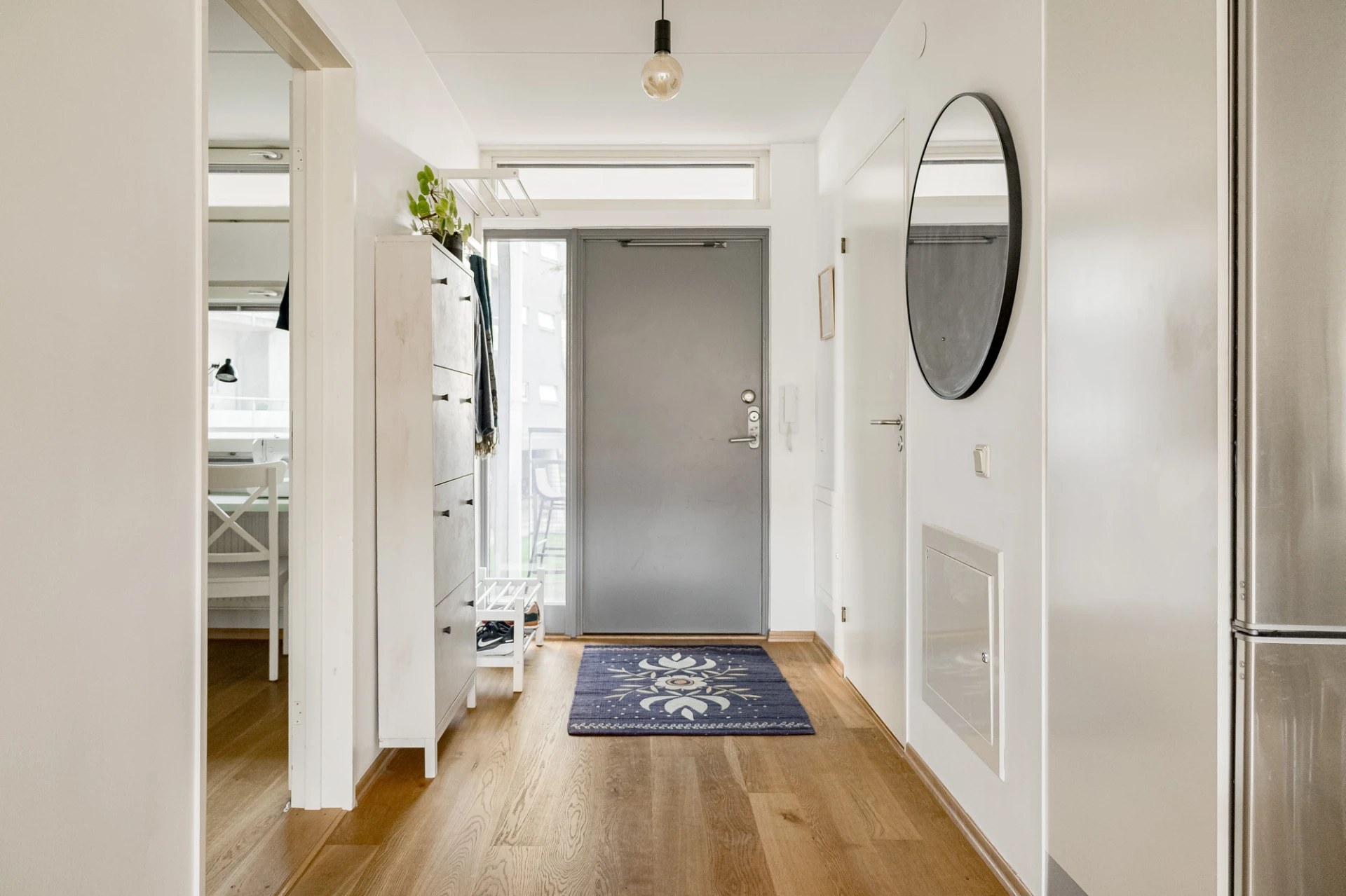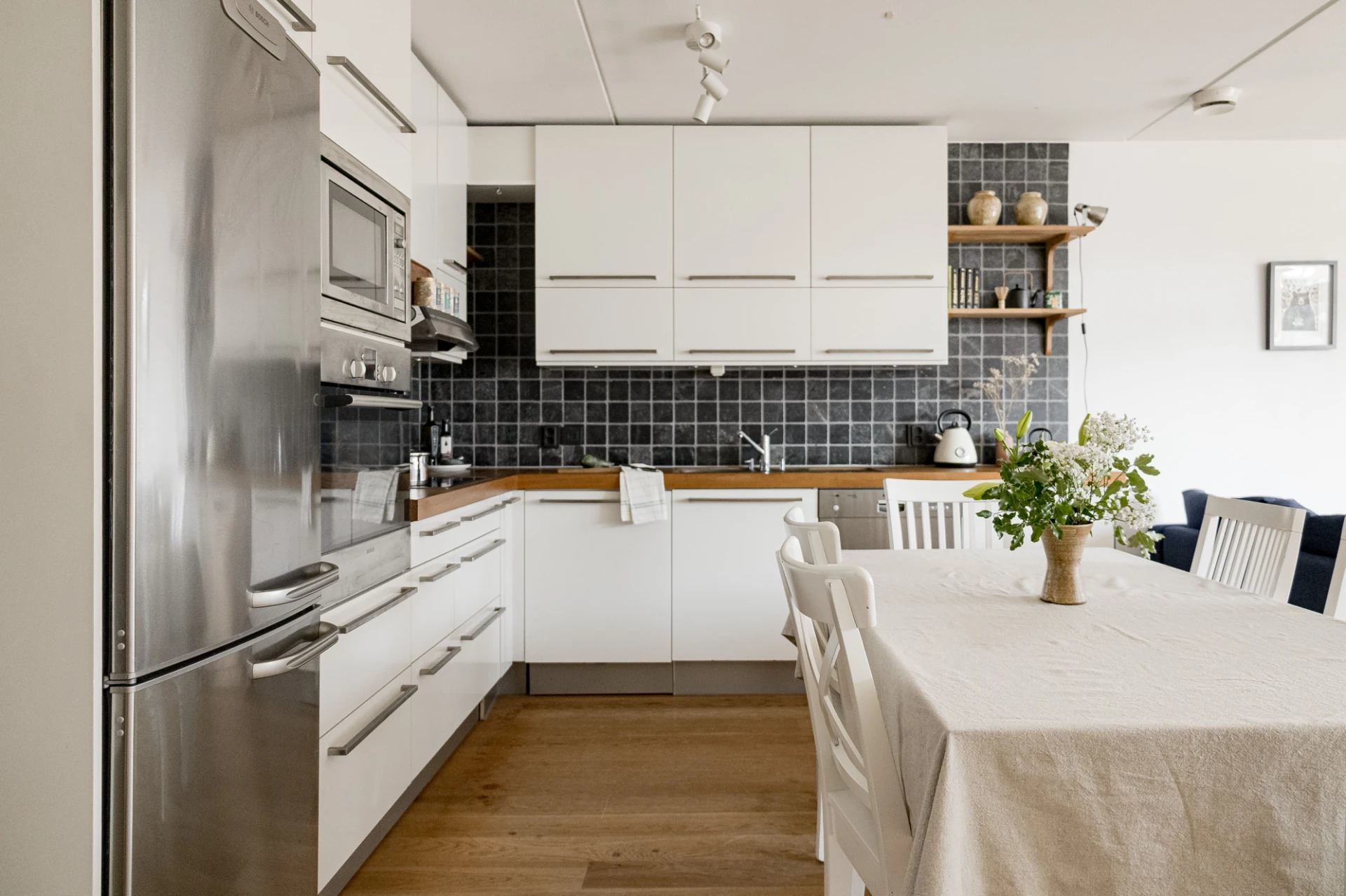 Bostaden erbjuder en genomgående planlösning där kök och vardagsrum möts i en öppen och social yta. Här finns plats för ett stort matbord mitt i rummet, den naturliga samlingspunkten för både vardag och fest. Från vardagsrummet når du den stora och soliga balkongen i söderläge, perfekt för avkoppling och sociala stunder under dygnets alla timmar. De två rymliga sovrummen ger gott om plats för både vila och hemmakontor om så önskas. Dessutom finns en generös klädkammare som kompletterar förvaringsmöjligheterna på bästa sätt. Det helkaklade badrummet är utrustat med inbyggt badkar samt kombinerad tvätt- och torkmaskin, vilket gör vardagen både smidigare och bekvämare.
