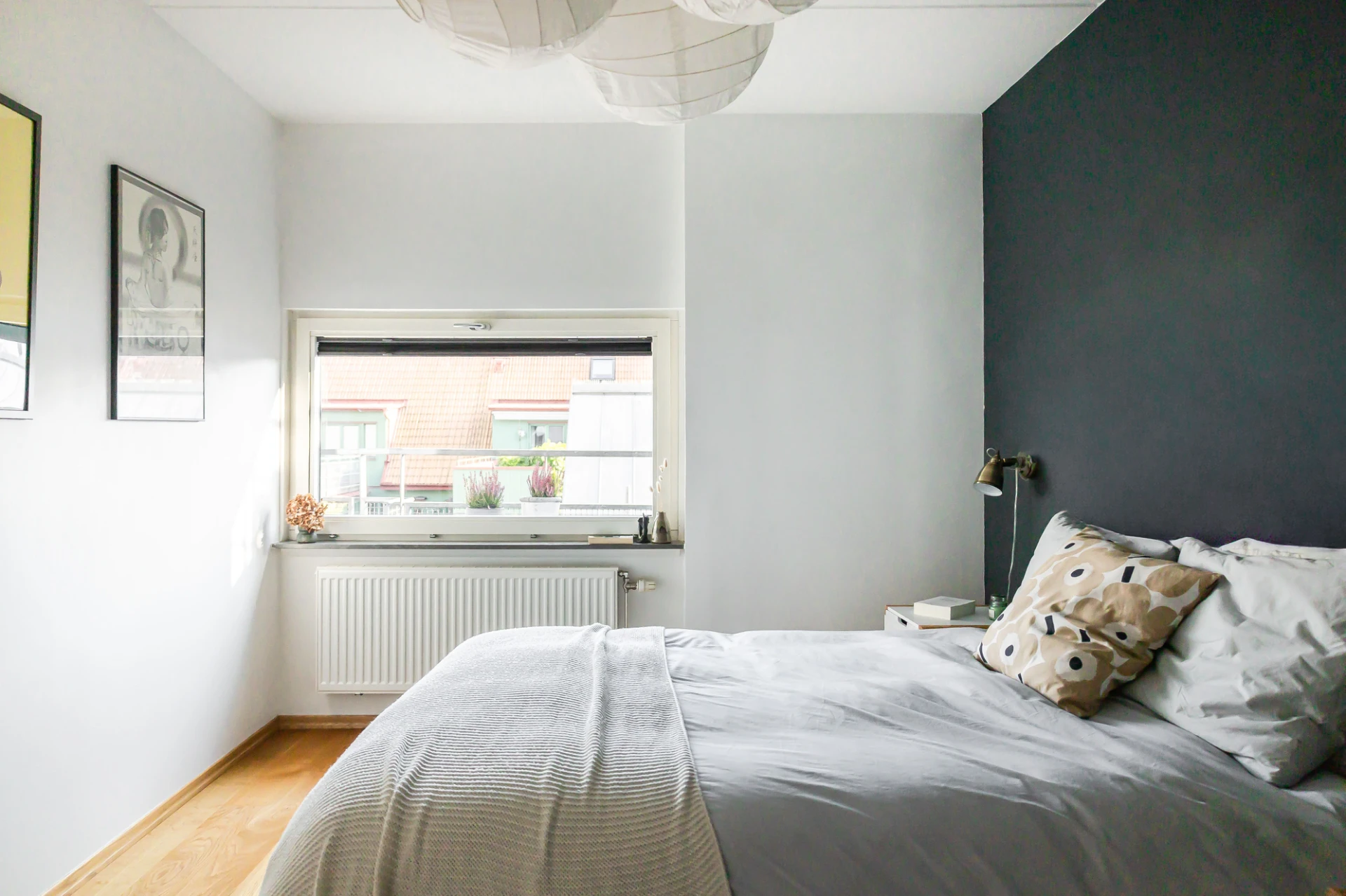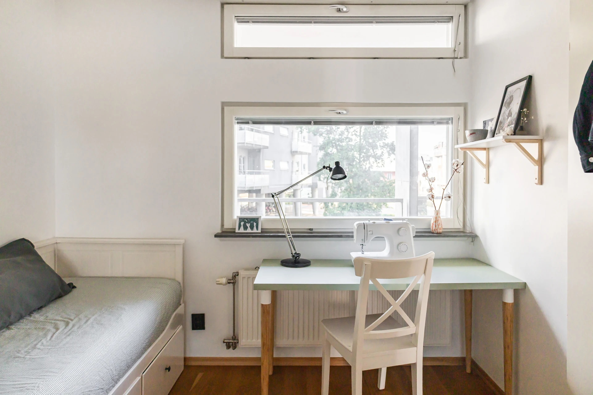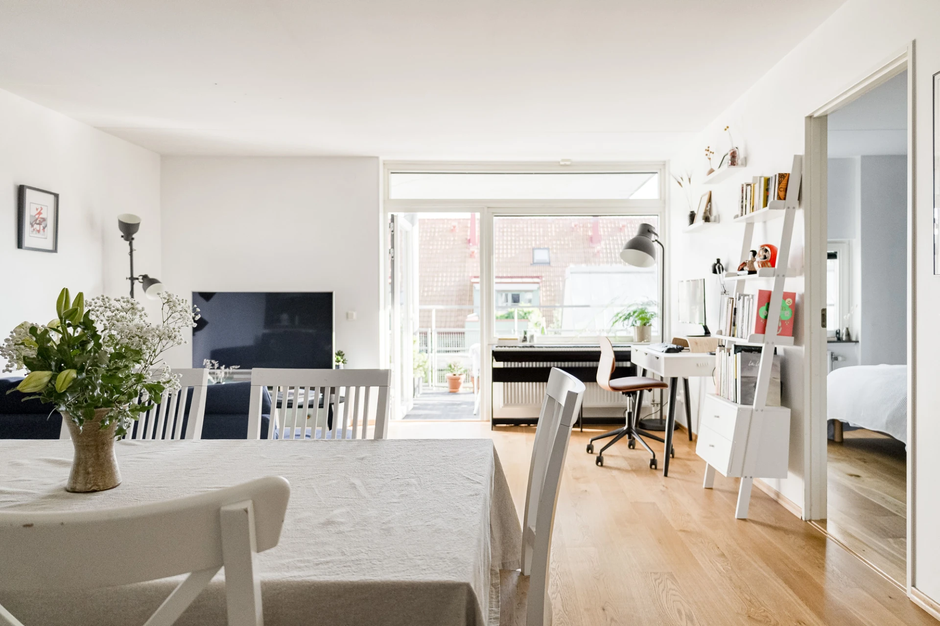 Parkettgolv och vita väggar. Utgång till balkong i söderläge.