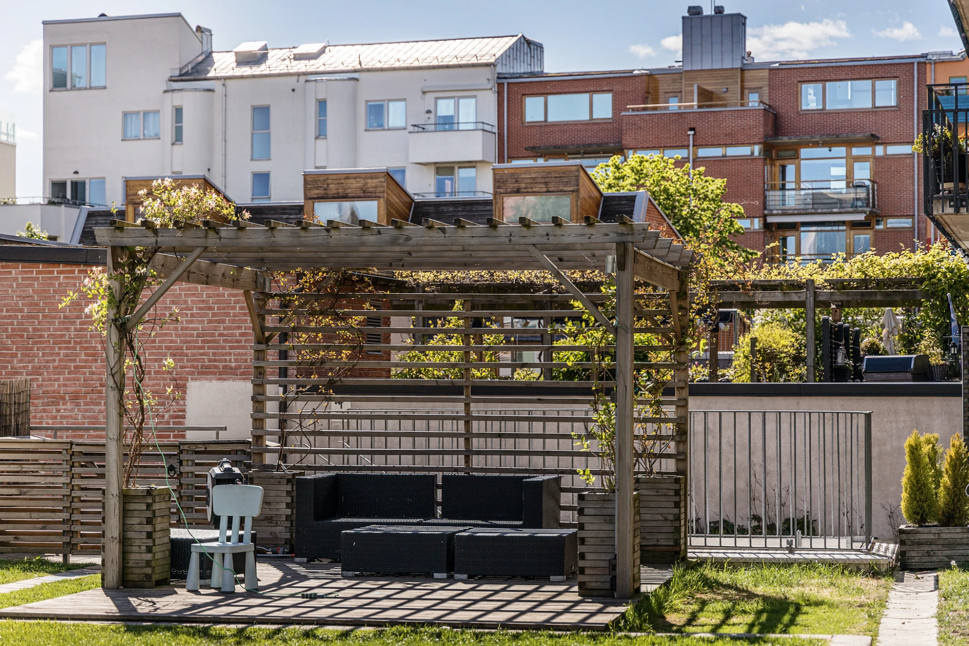 Föreningen har en gemensam innergård med lekplats och tillgång till utemöbler under mysig pergola.