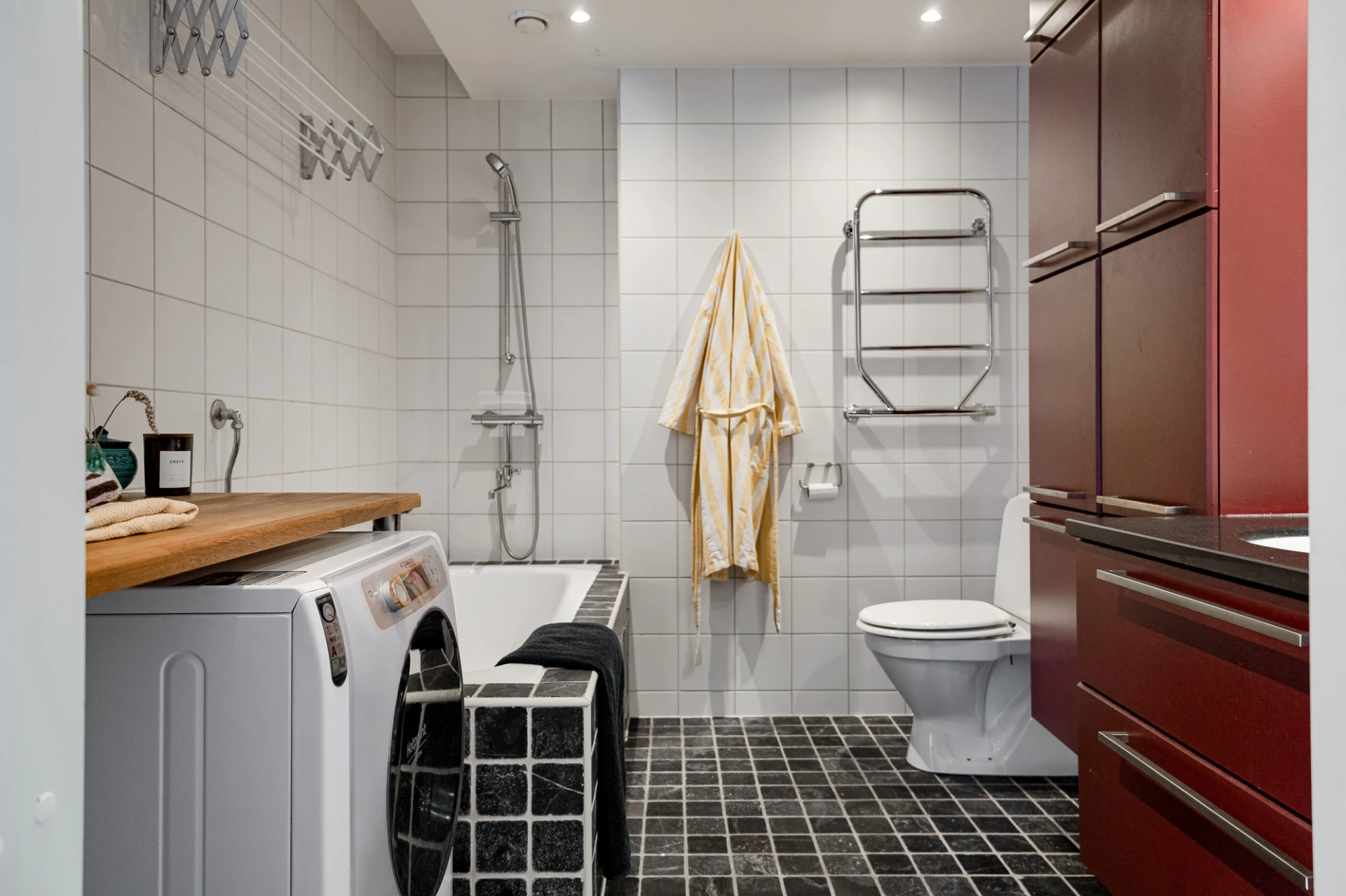 Mörk klinker och vitkaklade väggar. Badrummet är inrett med wc, handfat med underskåp, spegel, handdukshängare, inbyggd badkar, kombinerad tvätt och torkmaskin, bänkskiva i trä, förvaringsskåp, fönster och golvvärme.