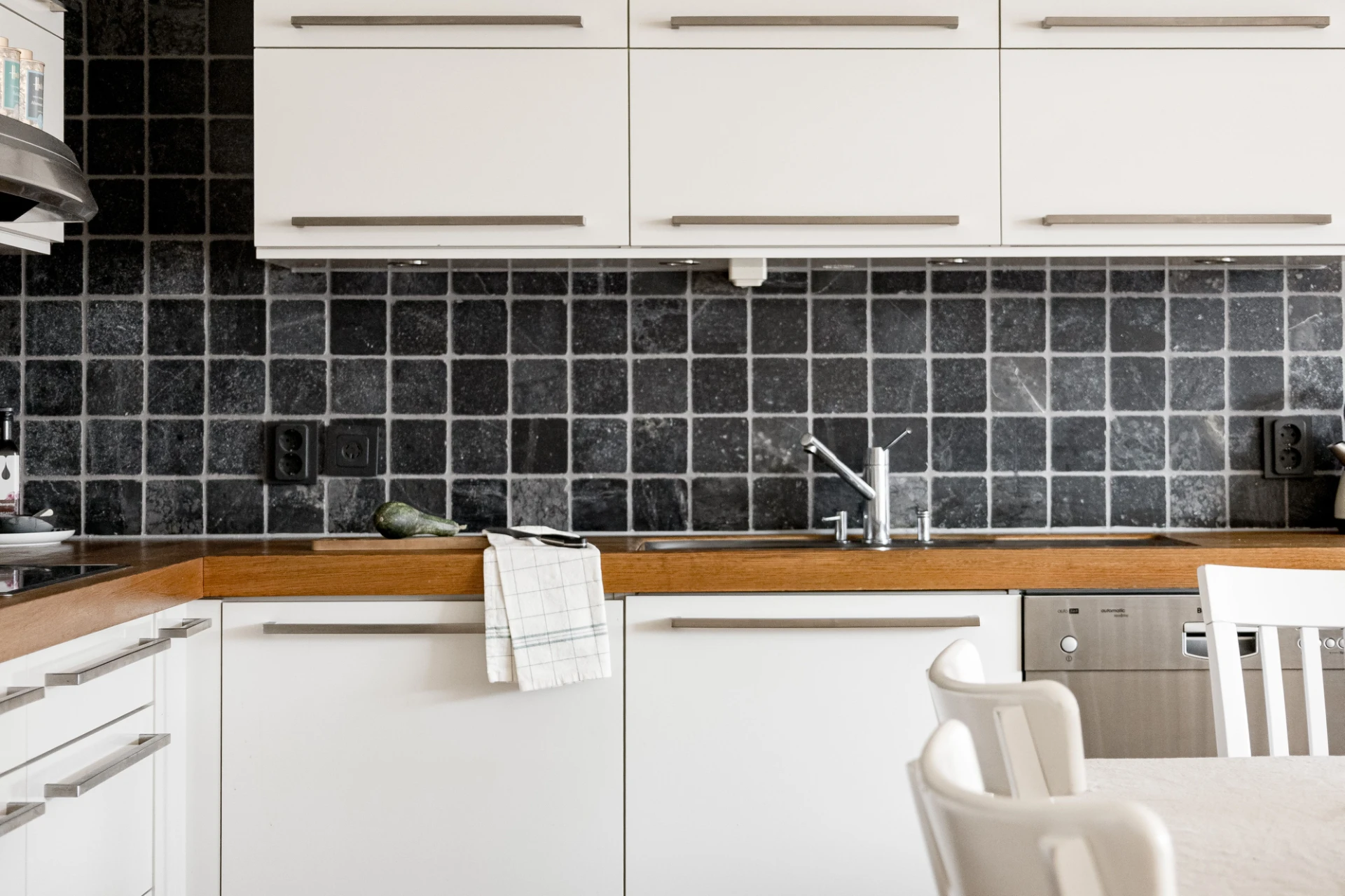 Parkettgolv och vita väggar. Vit köksinredning, mörkgrått kakel ovan bänkskiva i trä. Köket är utrustat med kyl/frys, häll, ugn, inbyggd mikrovågsugn, fläkt. Ingång till klädkammare.