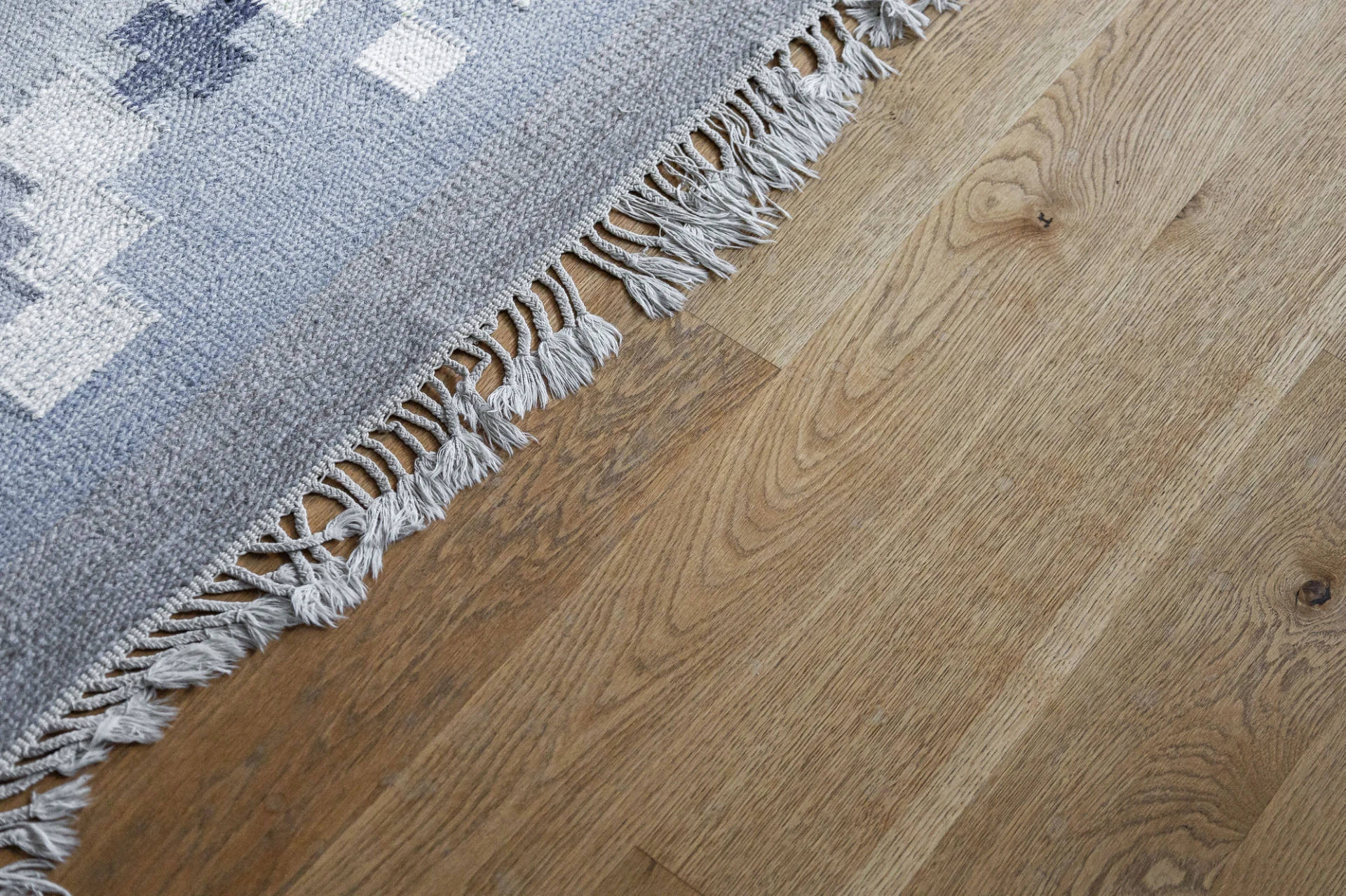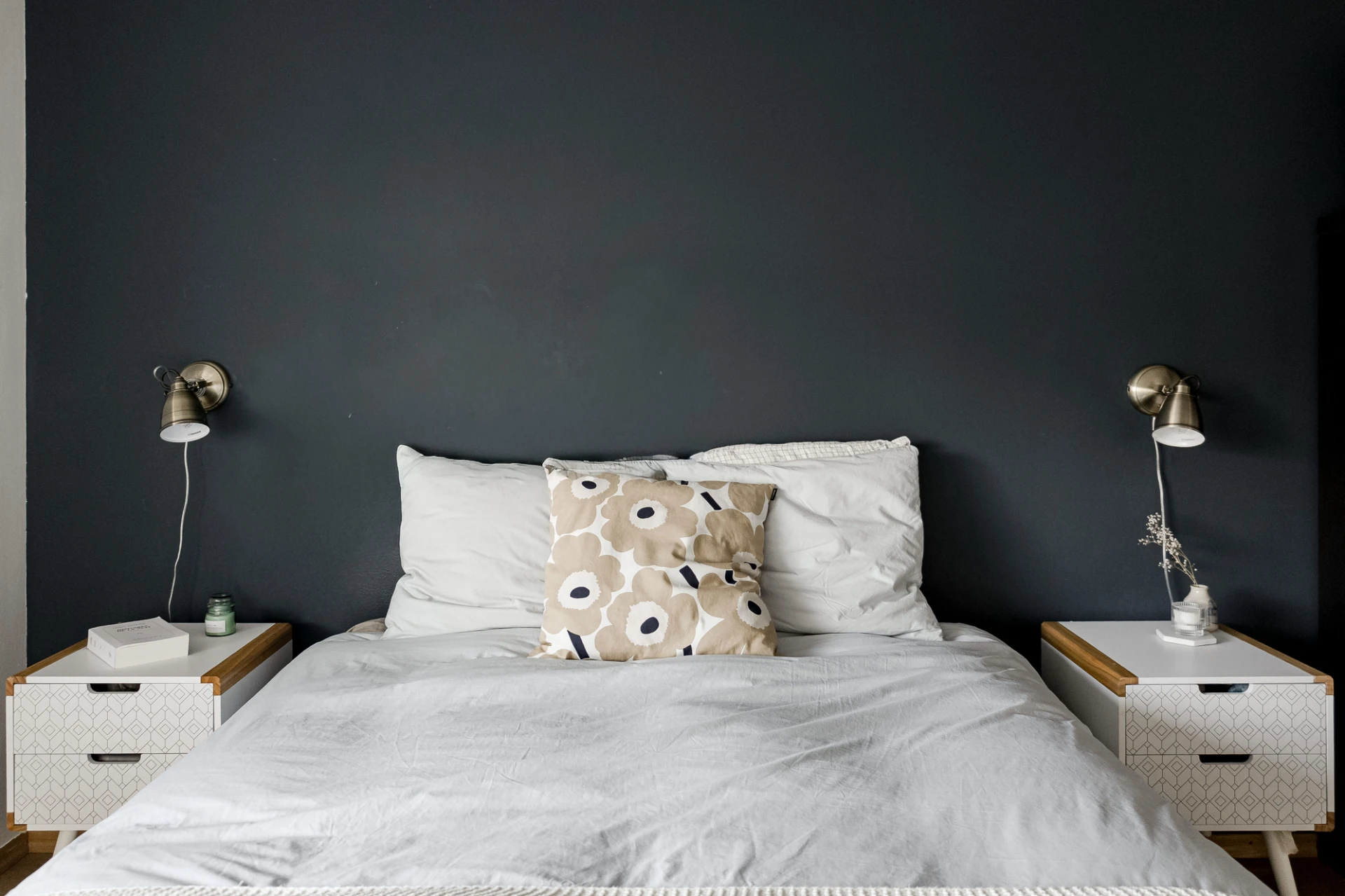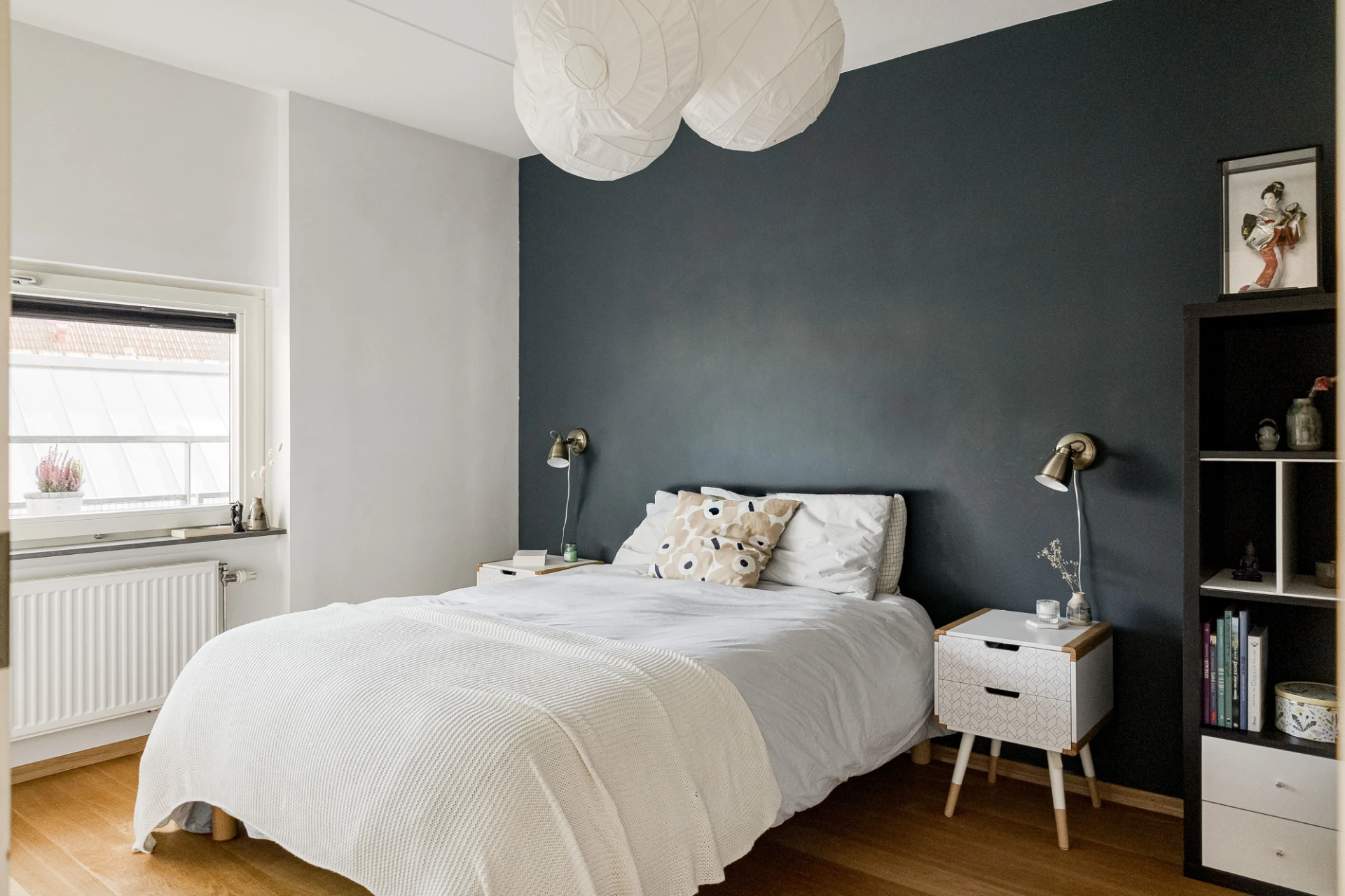 Parkettgolv och vita väggar samt en mörk fondvägg.