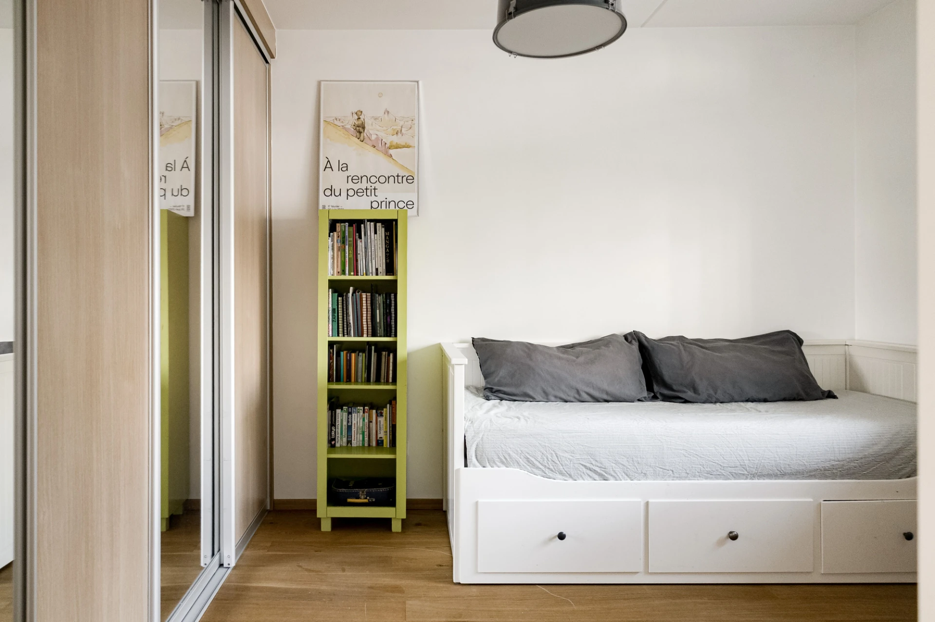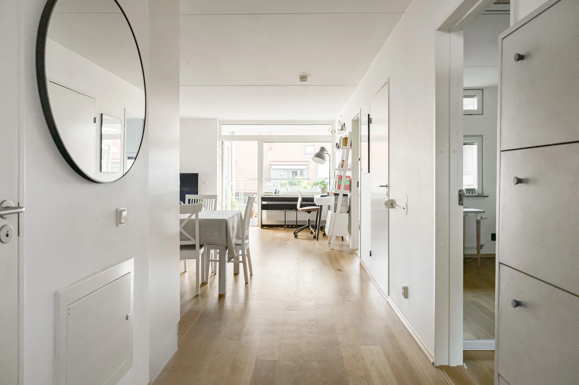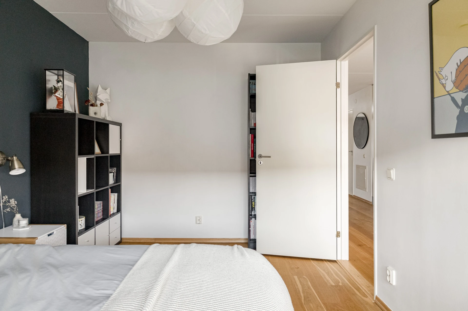 Parkettgolv och vita väggar samt inbyggd garderob med skjutdörrar.