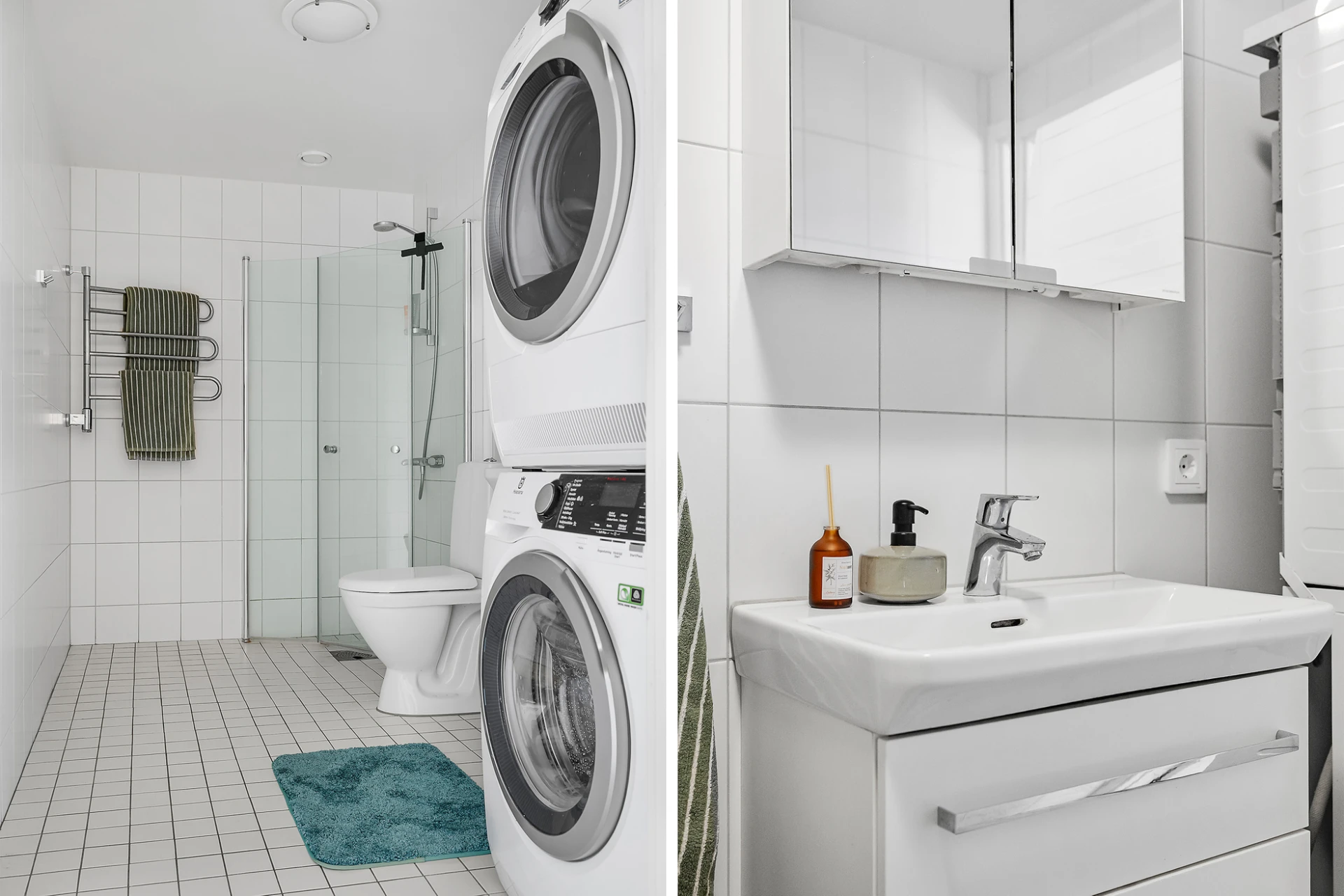 Det helkaklade badrummet i vitt erbjuder en praktisk och fräsch miljö med stor duschhörna med vikbara glasdörrar, kommod, spegelskåp, wc, handdukstork samt en tvättpelare med tvättmaskin och torktumlare från Husqvarna – allt för att underlätta vardagen.