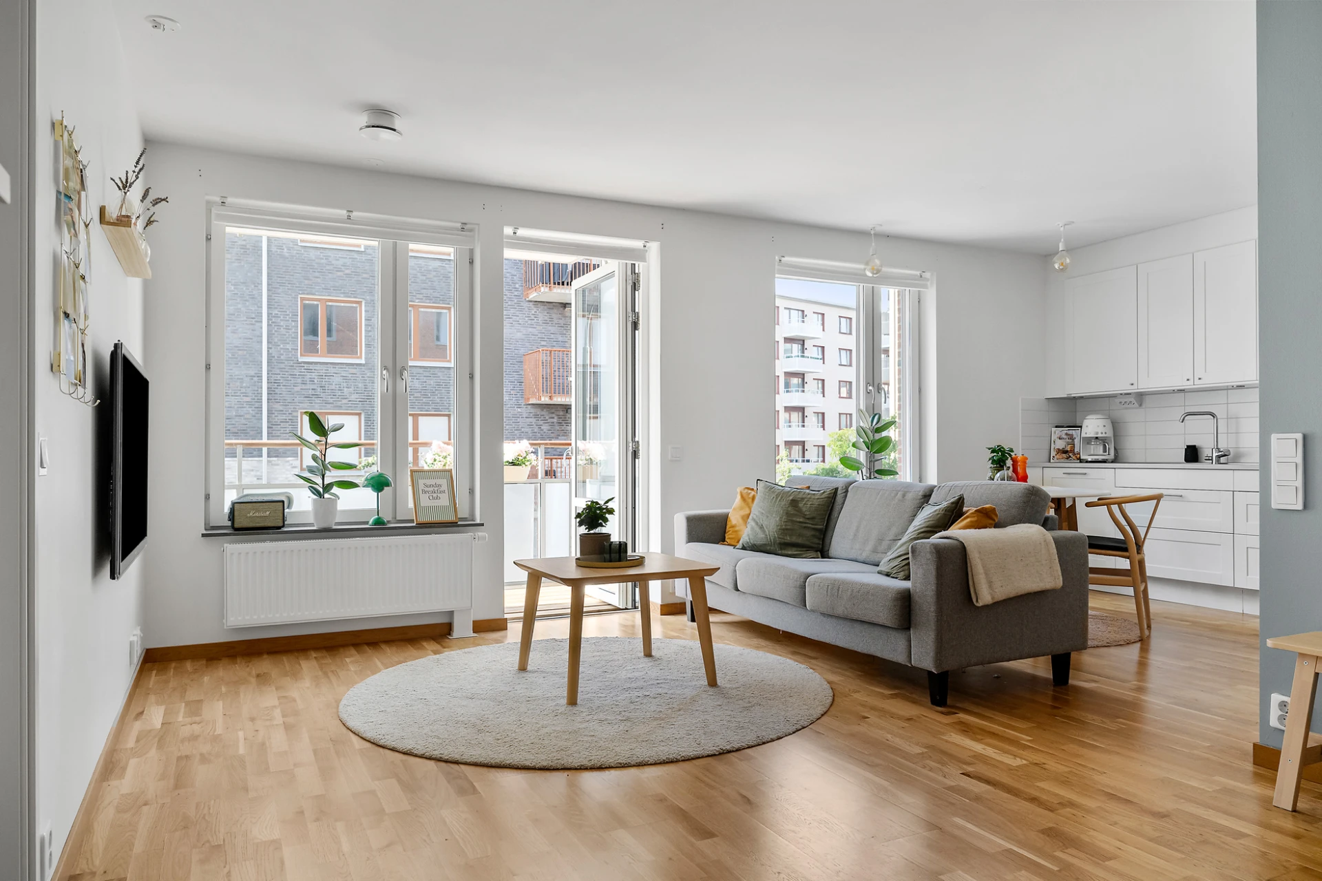 Rymligt vardagsrum i öppen planlösning med köket. Plats för både soffgrupp och matbord. Stora fönster för härligt ljusinsläpp. Vackra fönsterbrädor i sten. Utgång till den stora balkongen i soligt västerläge.