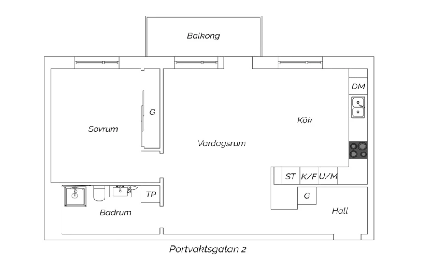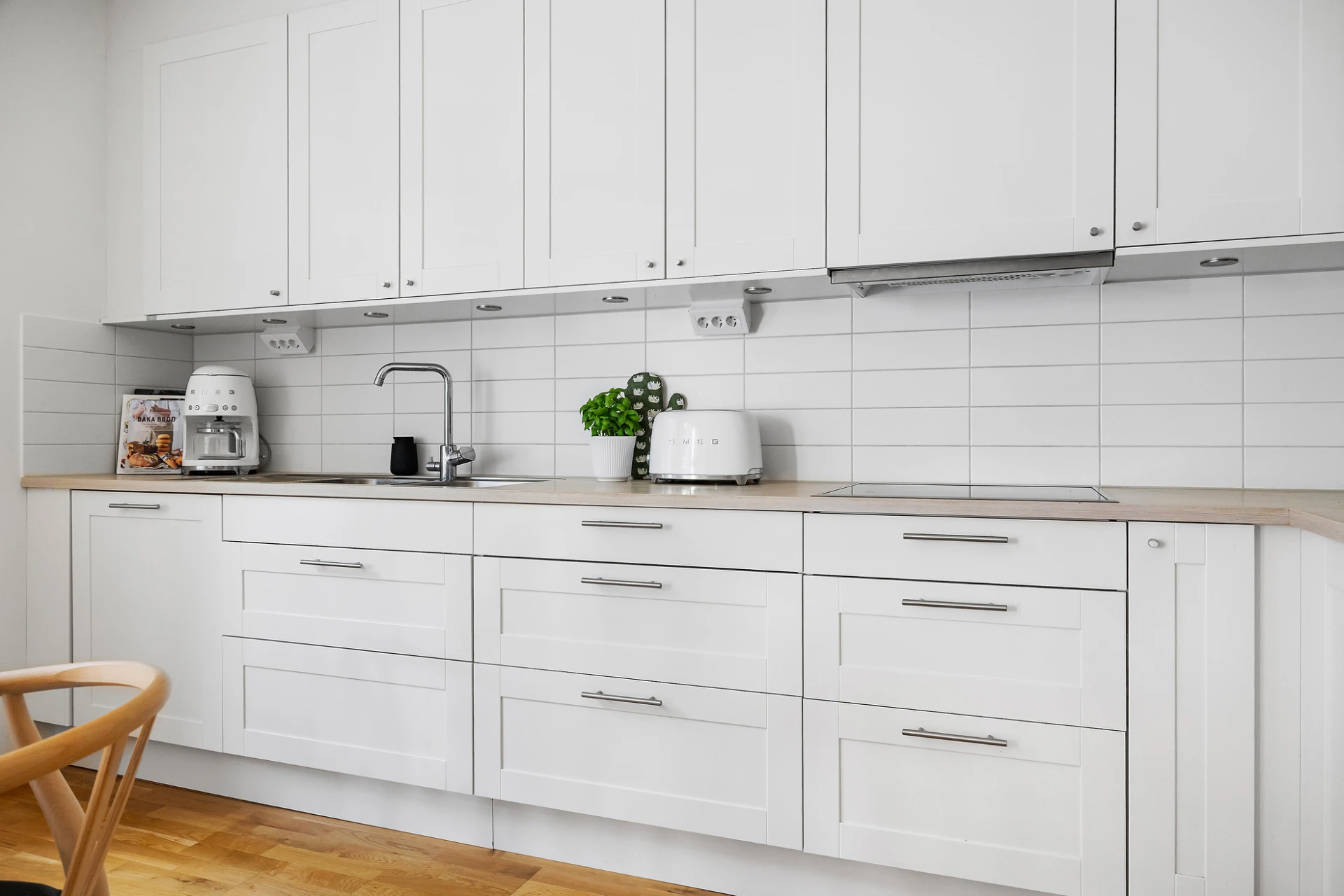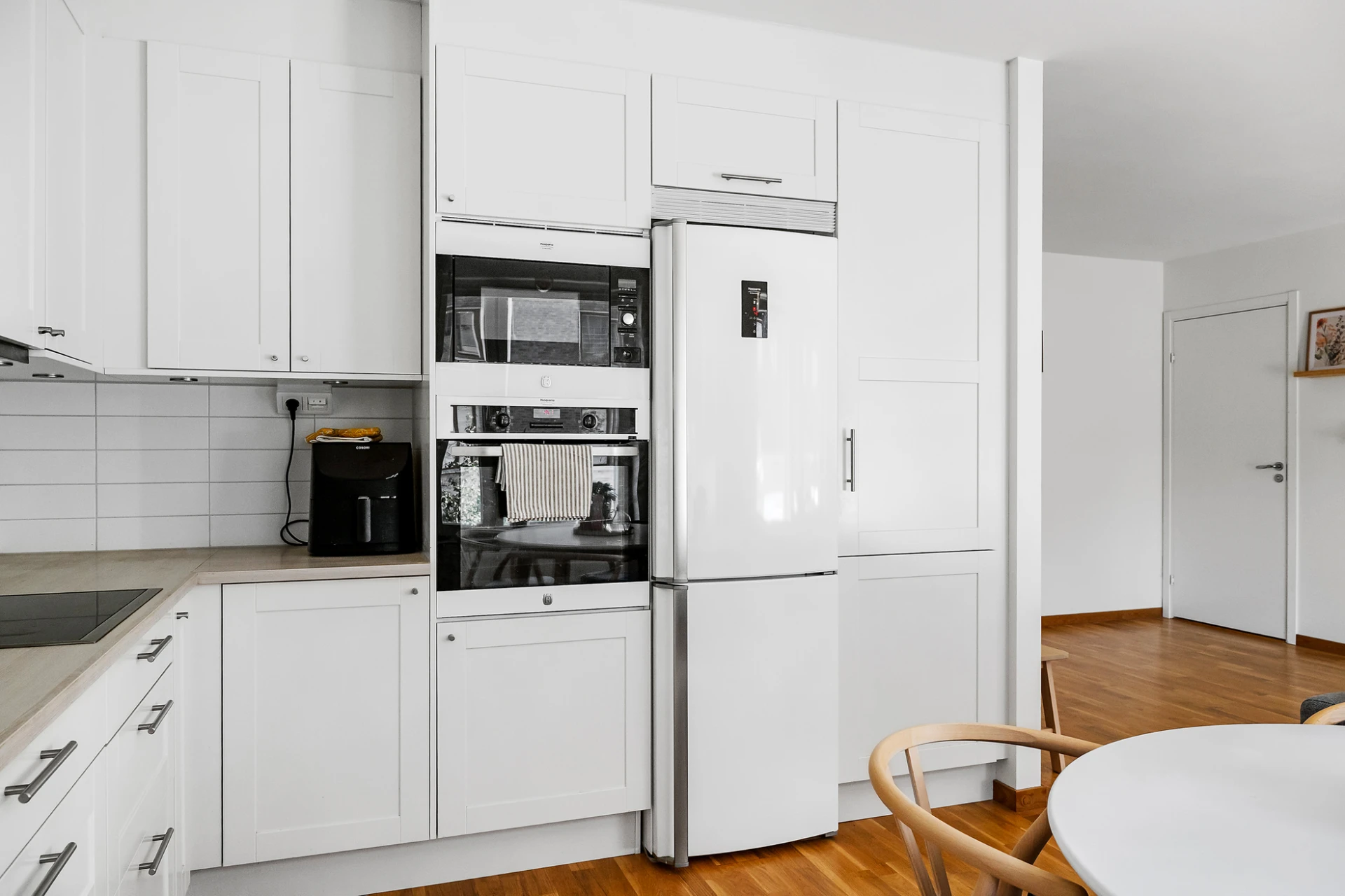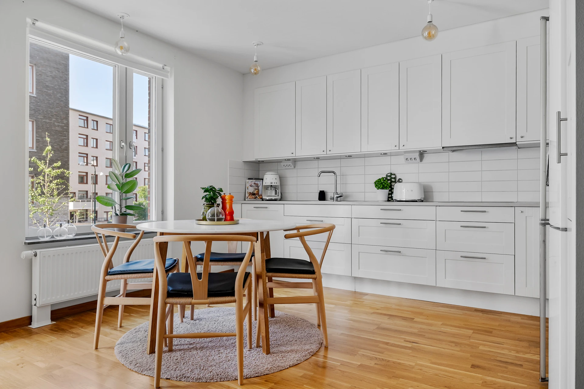 Köket från Marbodal är snyggt och funktionellt i vitt, med matchande vitt klinker ovanför bänkskivan. Integrerad diskmaskin, induktionshäll, inbyggd ugn och micro, samt fristående kyl/frys – samtliga från Husqvarna/Electrolux. Den öppna planlösningen mellan kök och vardagsrum skapar härliga sociala ytor med gott om plats för både soffgrupp och matbord.