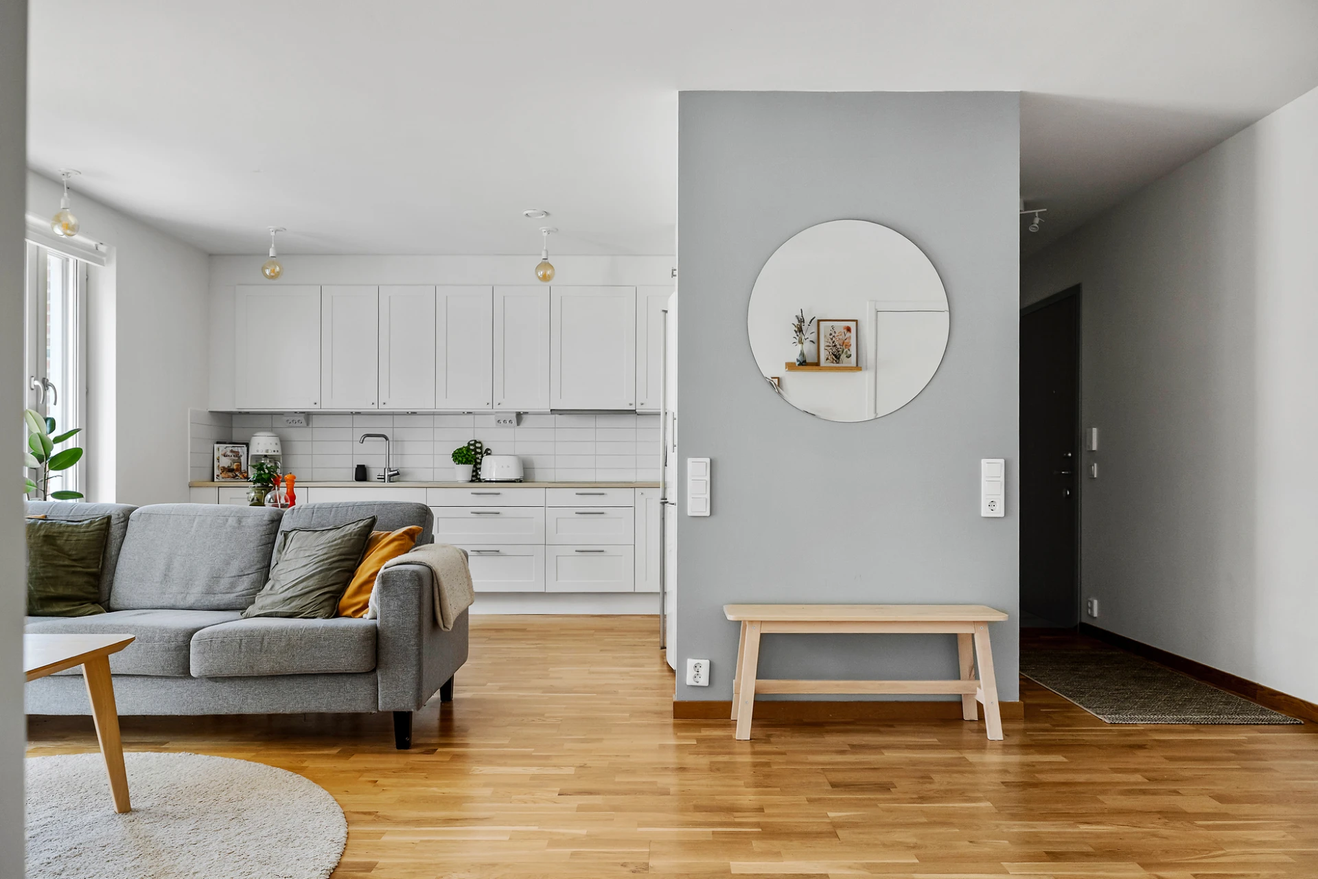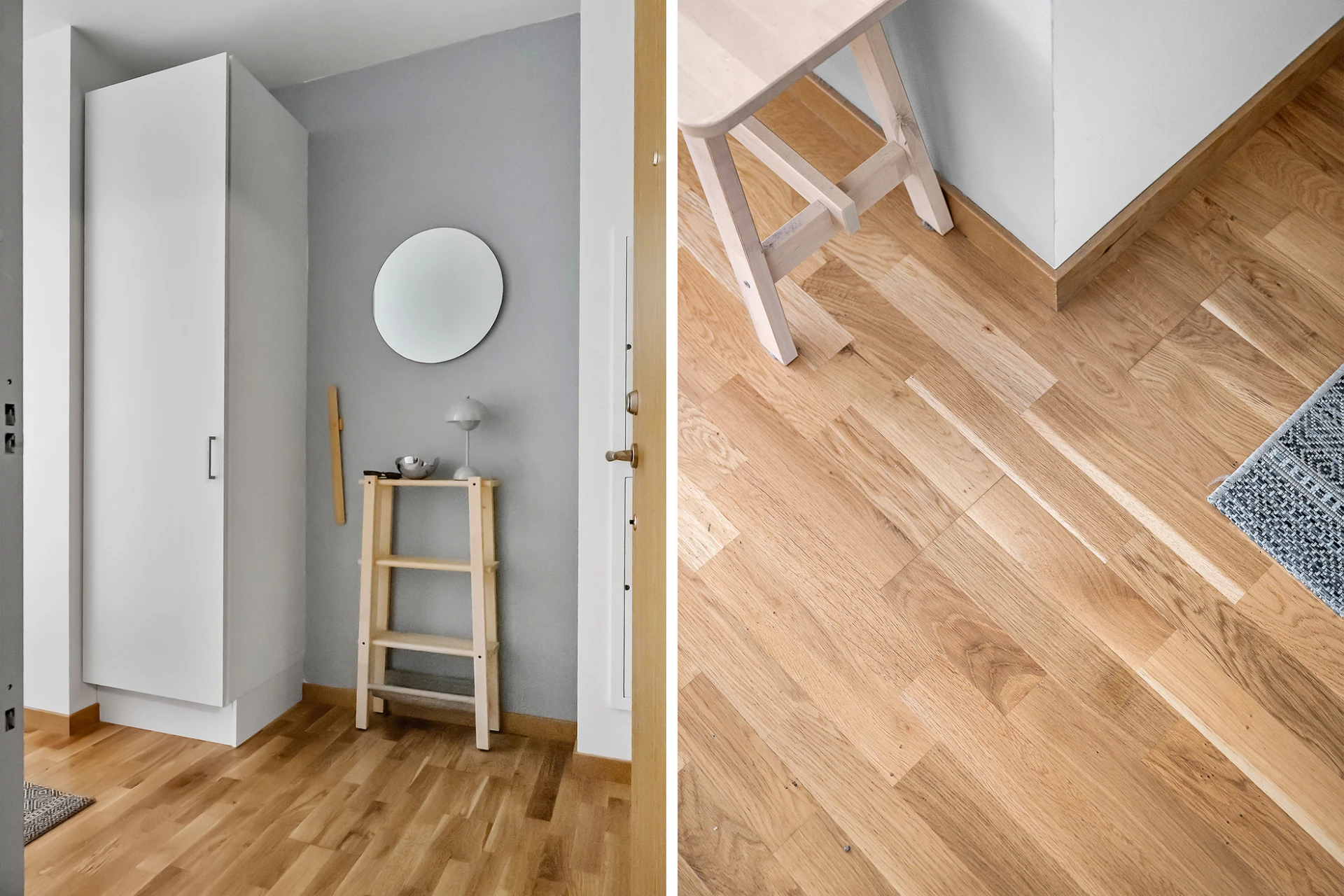 Genomgående ekparkett, vita släta väggar samt en fondvägg i grågrön ton. Plats för ytterkläder samt en garderob.