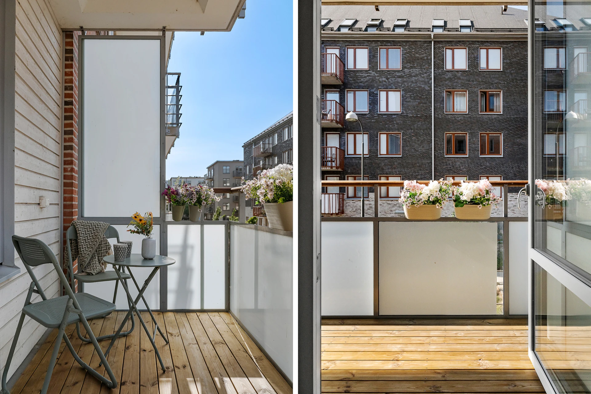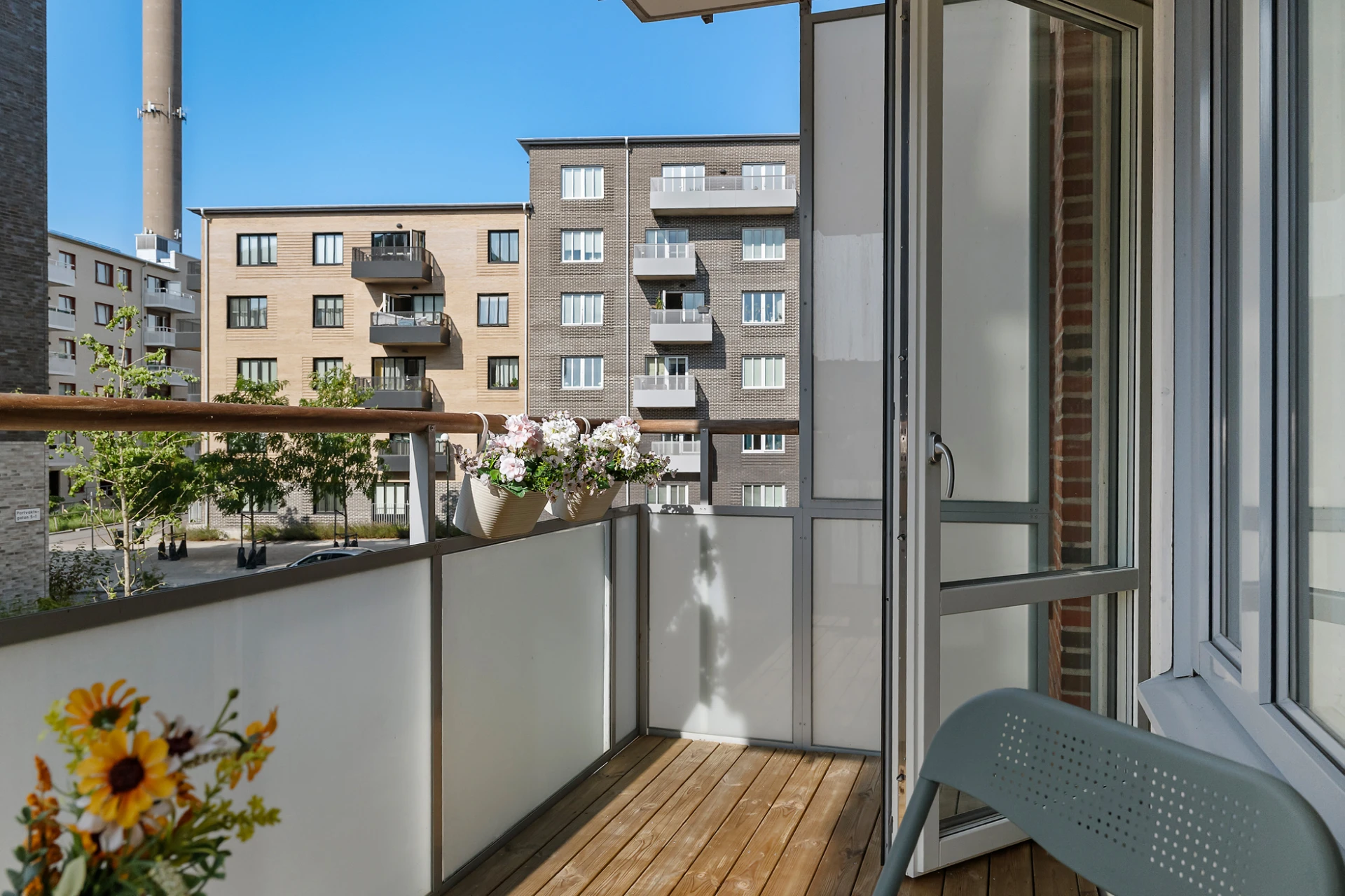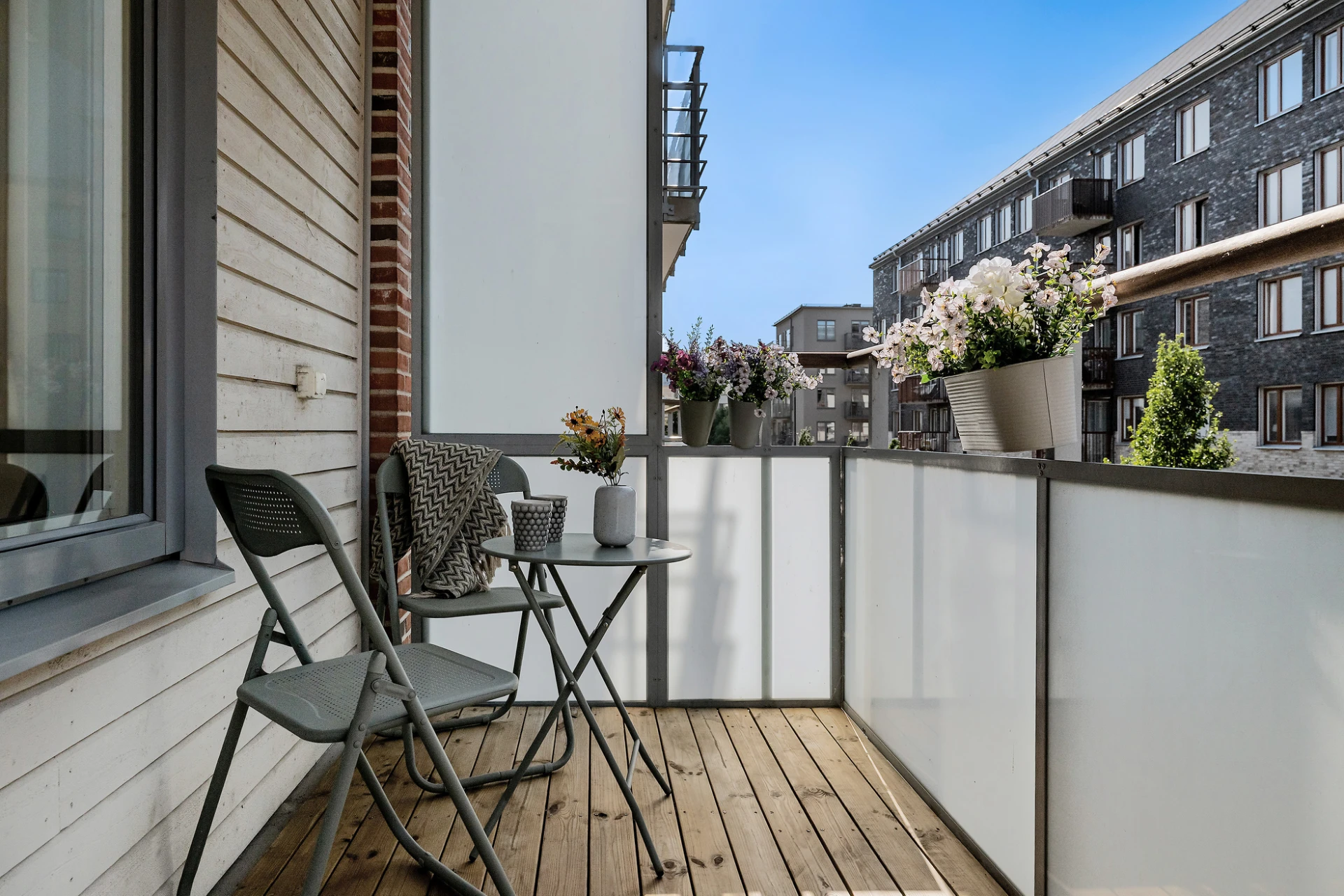Den generösa balkongen i västerläge blir snabbt en favoritplats, med sol från eftermiddag till kväll och plats för både loungemöbler och växter – en naturlig förlängning av det redan rymliga vardagsrummet.