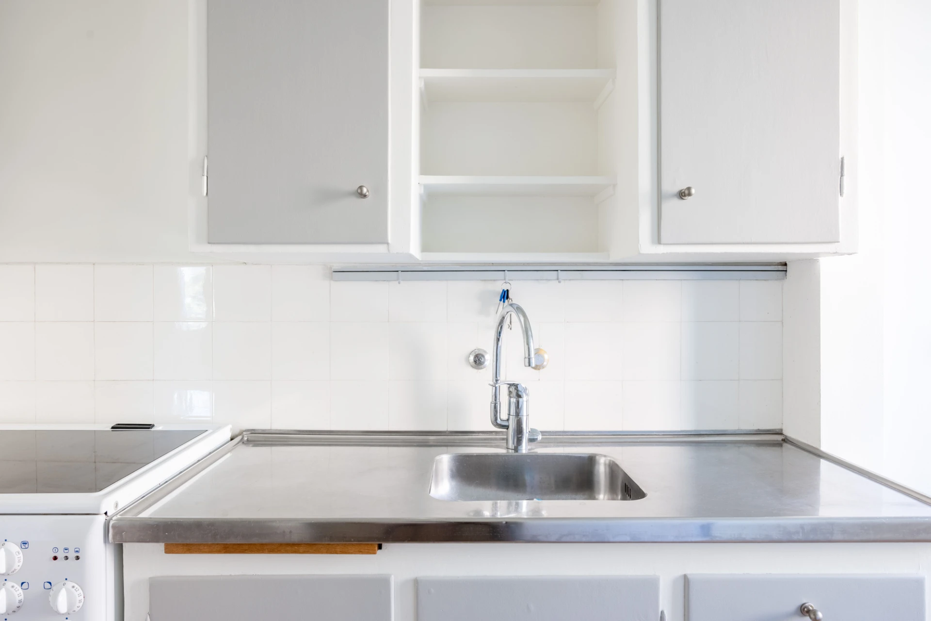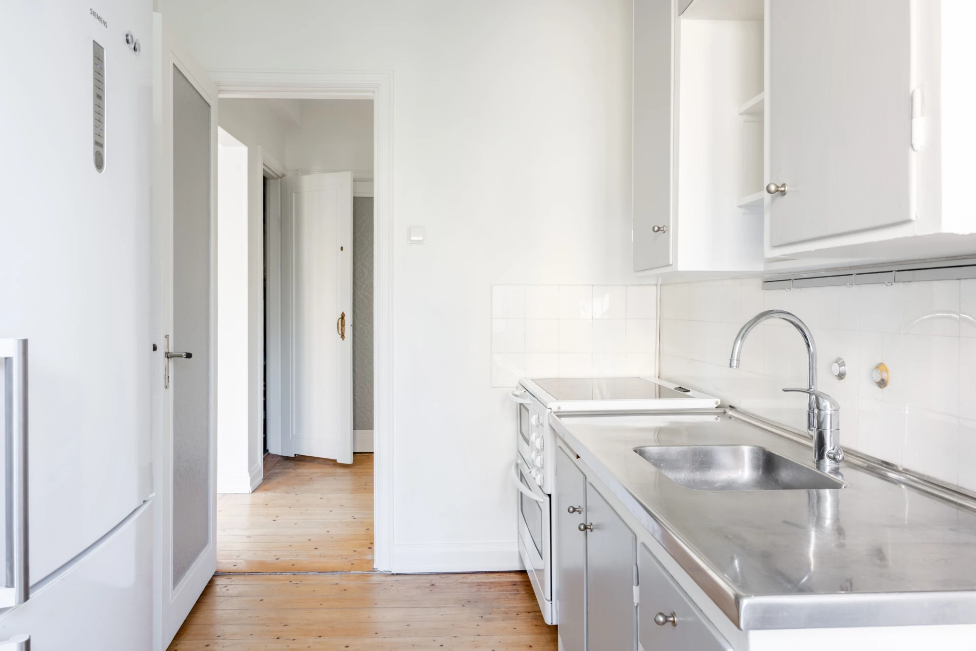 Brädgolv och vita väggar. Vit originalinredning med ljusgrå luckor och vitt kakel ovanför bänkskiva i rostfritt. Rymligt skafferi. Köket är utrustat med kyl/frys och spis/ugn. Matplats för ca 2-4 personer.
