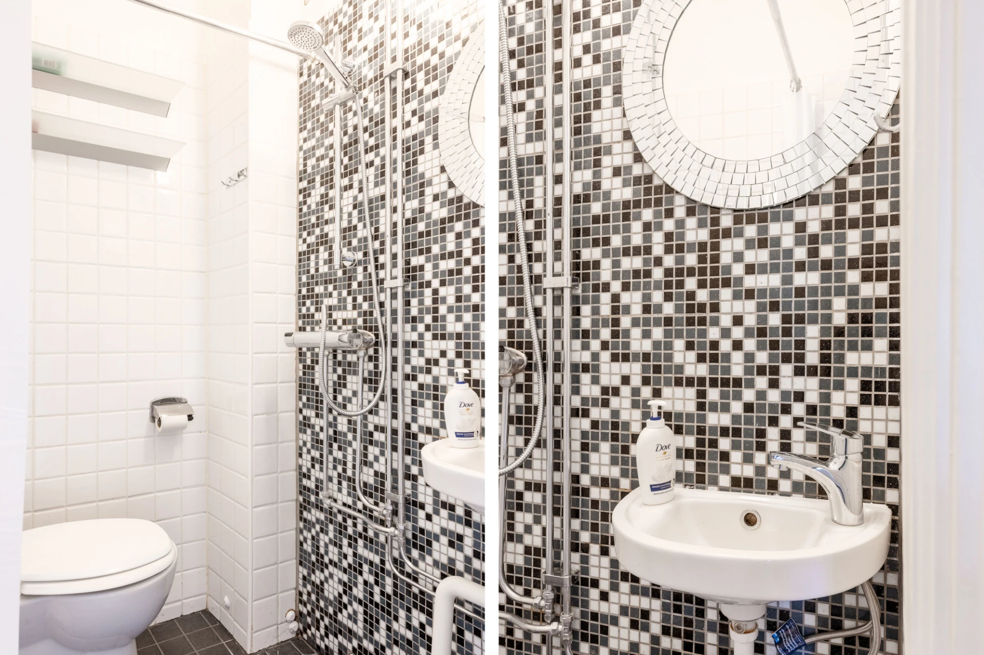 Antracitgrå klinker på golv och vitt kakel på väggarna samt fondvägg med mosaik. Badrummet är utrustat med WC, dusch och handfat.