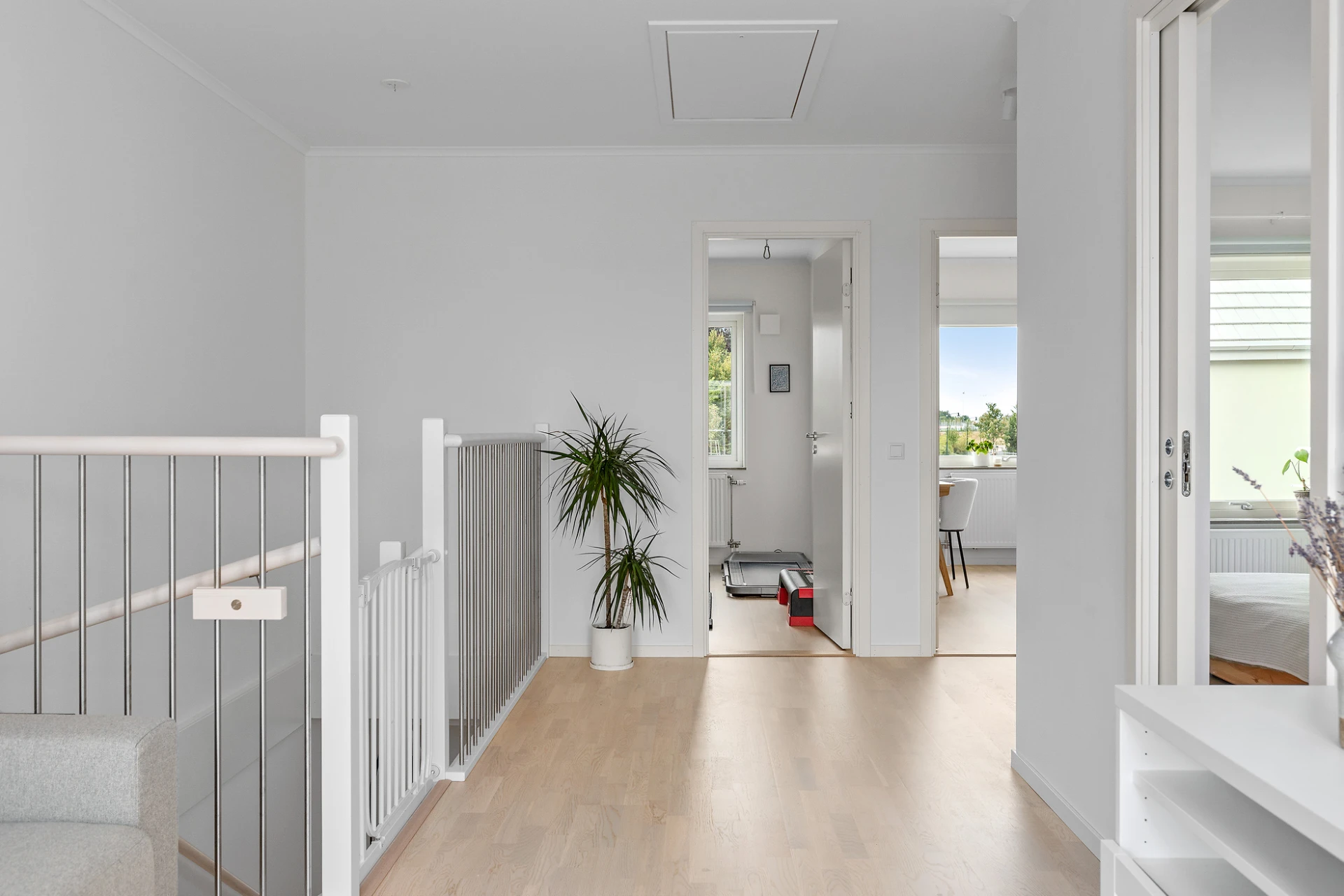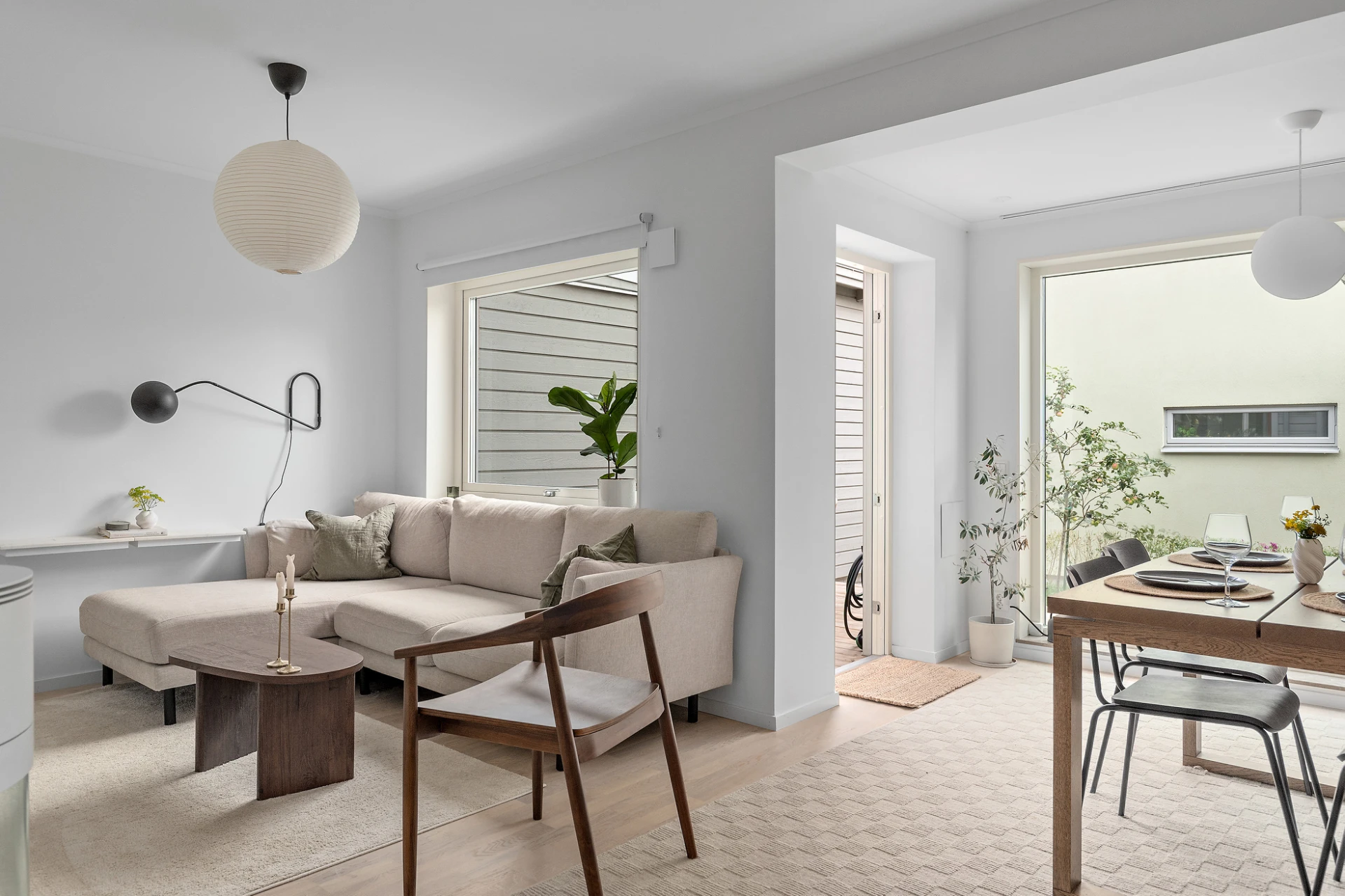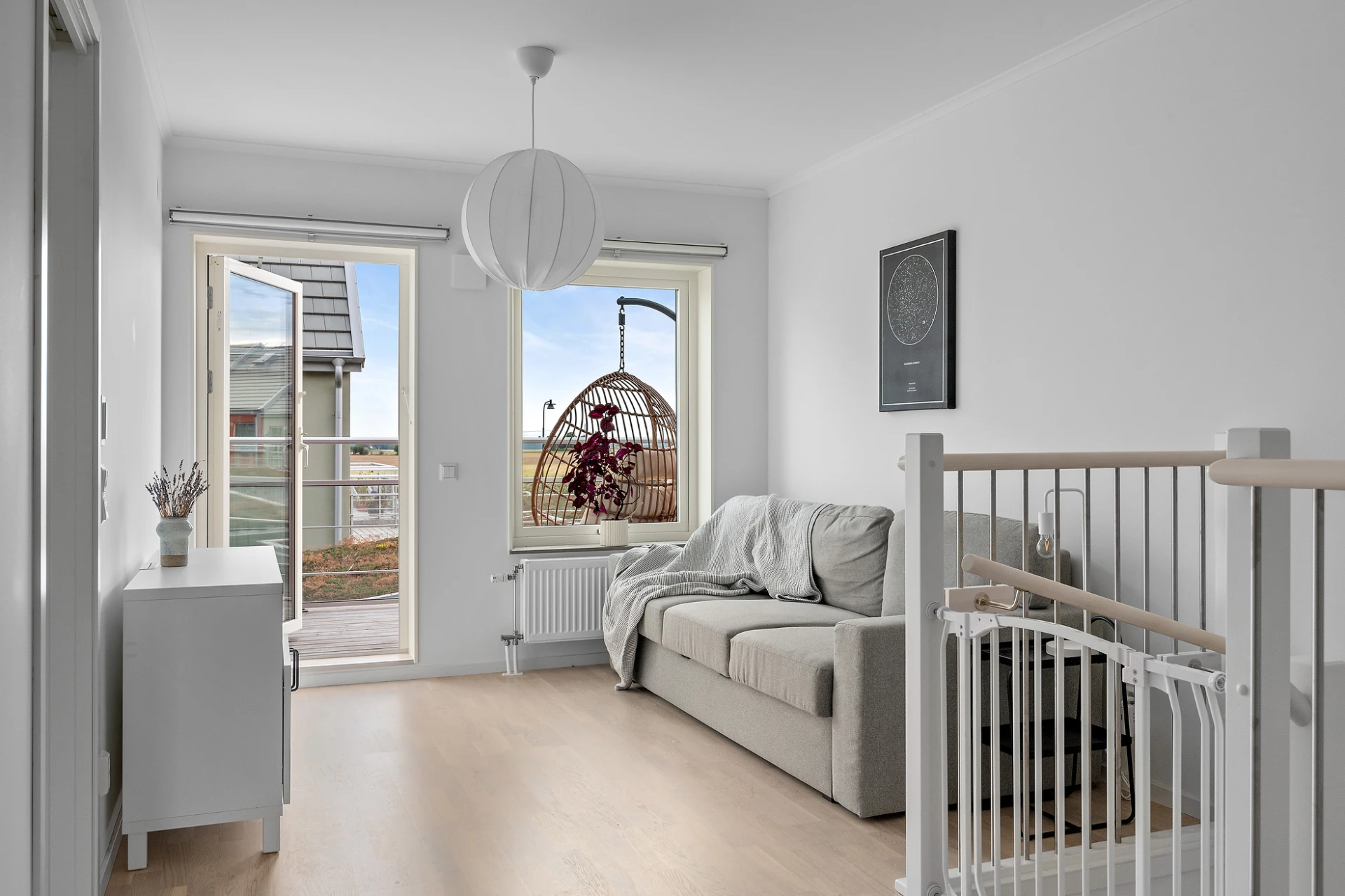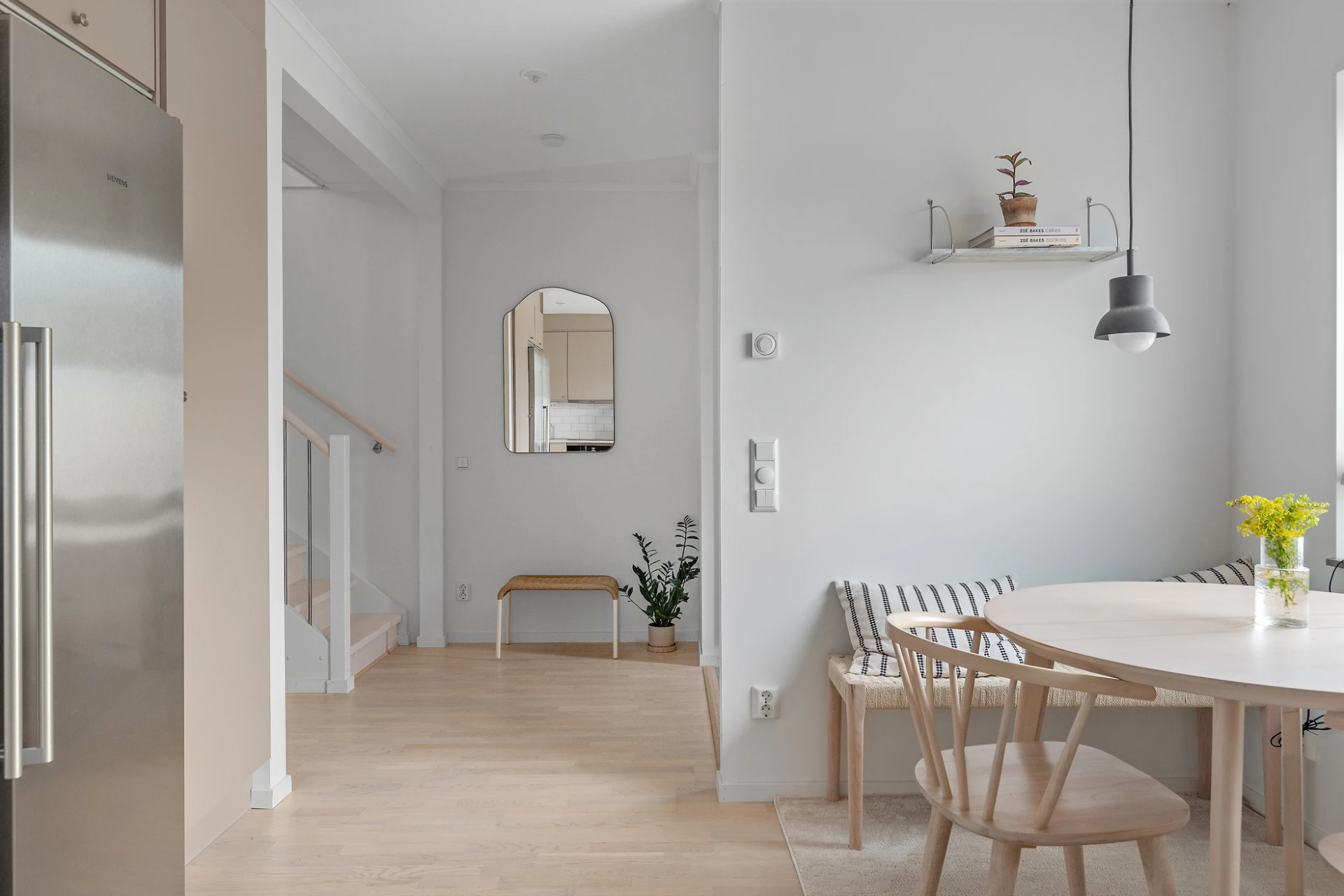 Parkettgolv och vita väggar samt utgång till altan/trädgård.