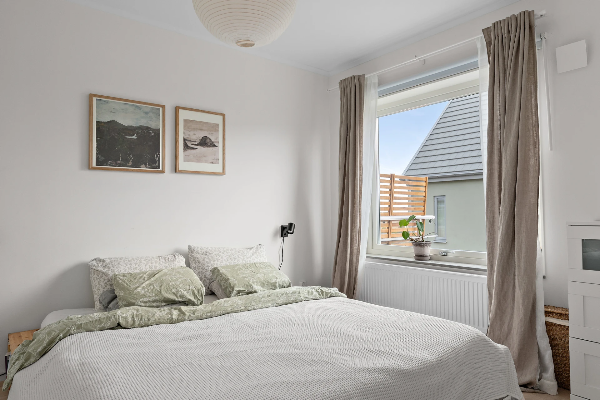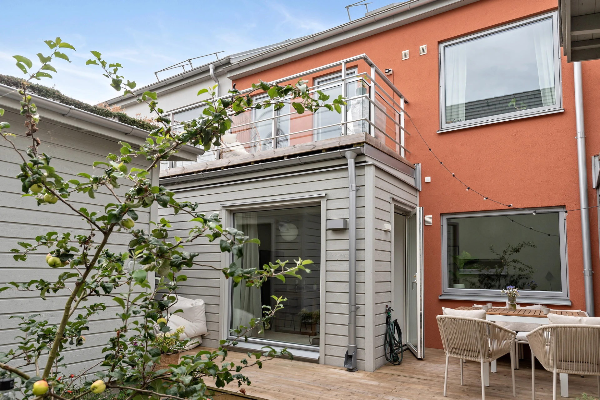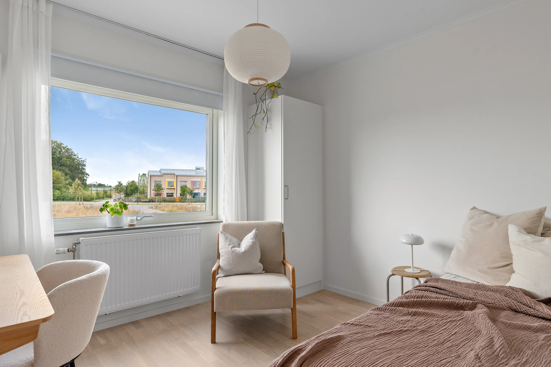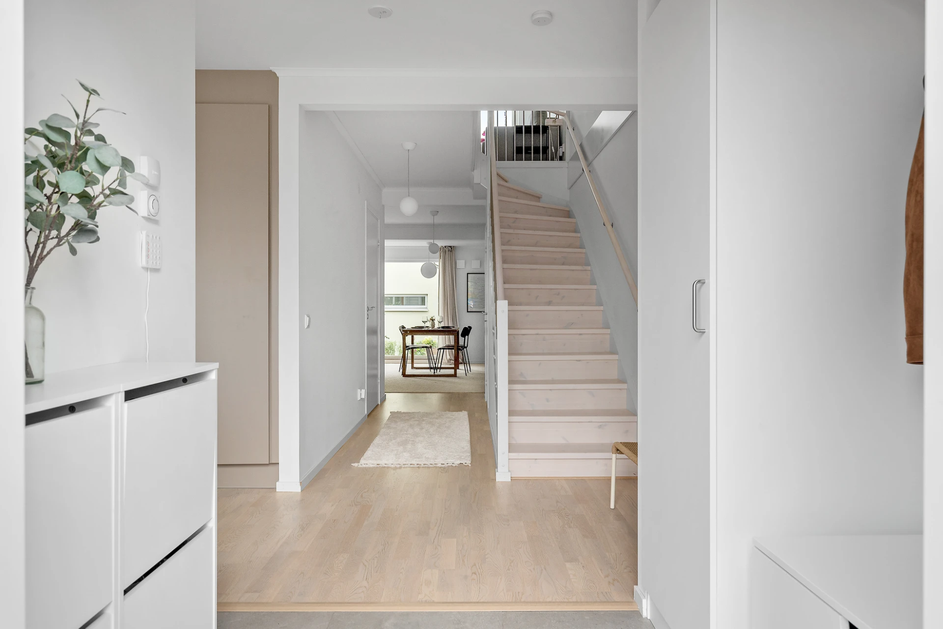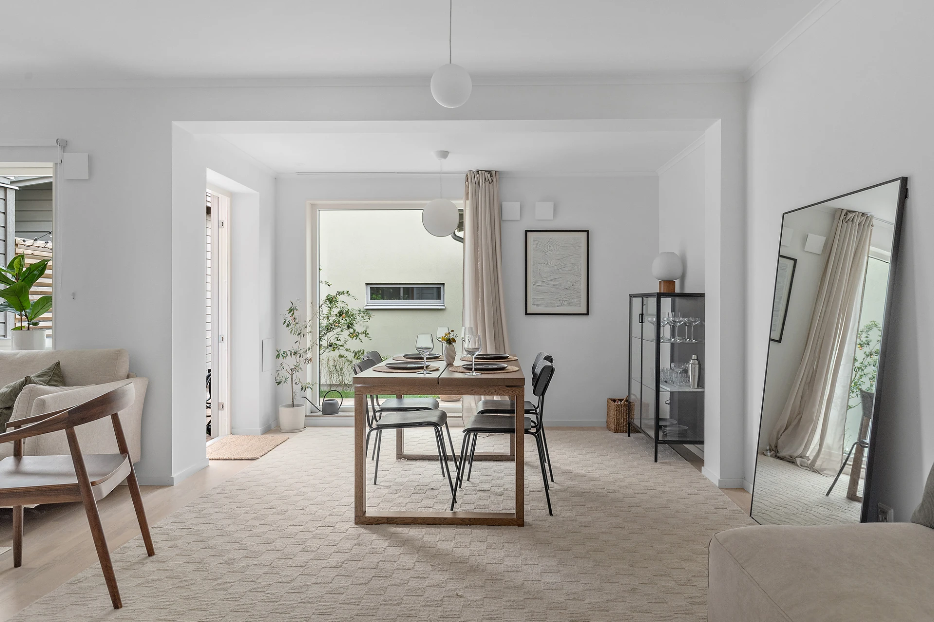 Parkettgolv och vita väggar samt utgång till altan/trädgård.