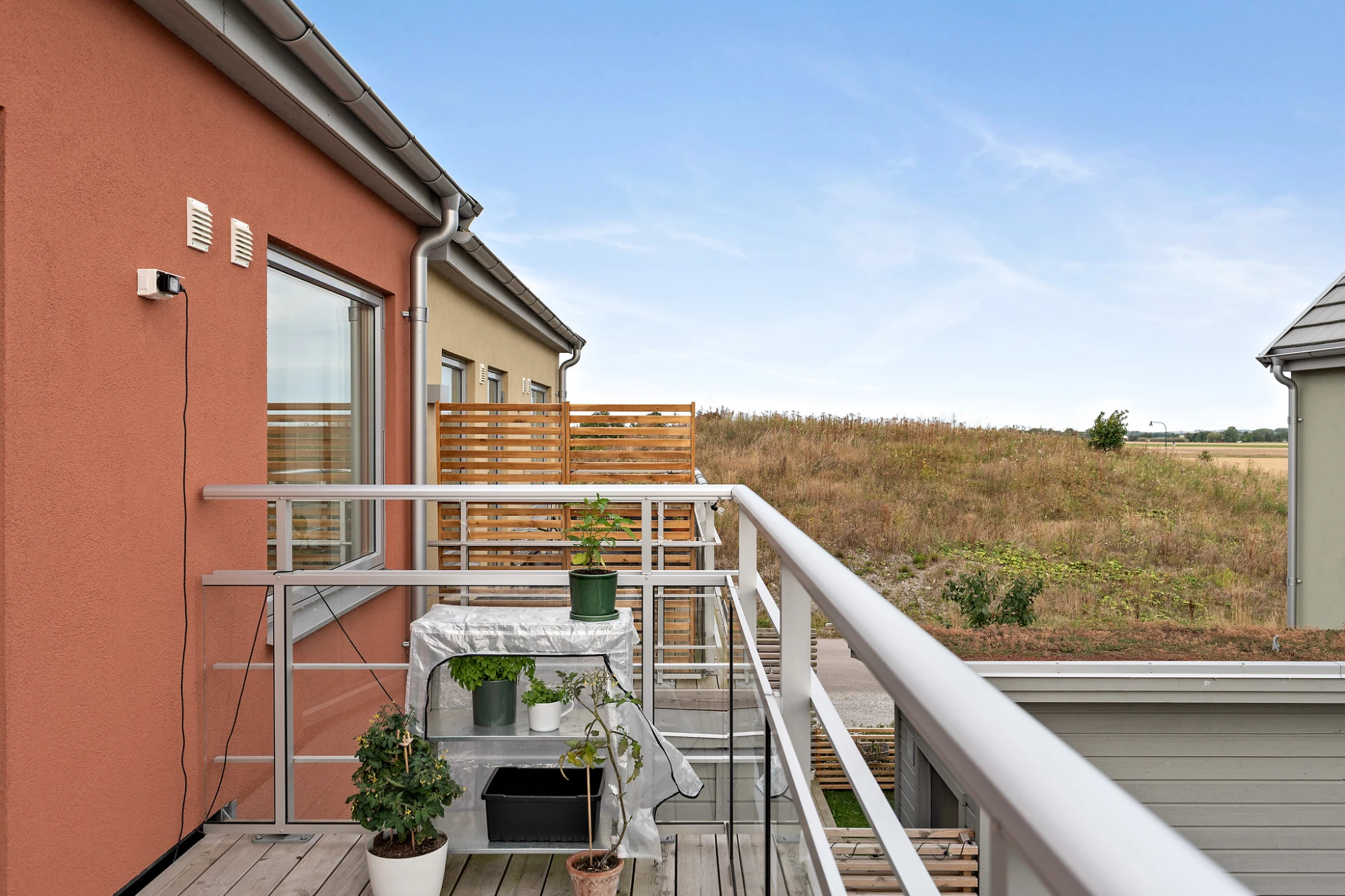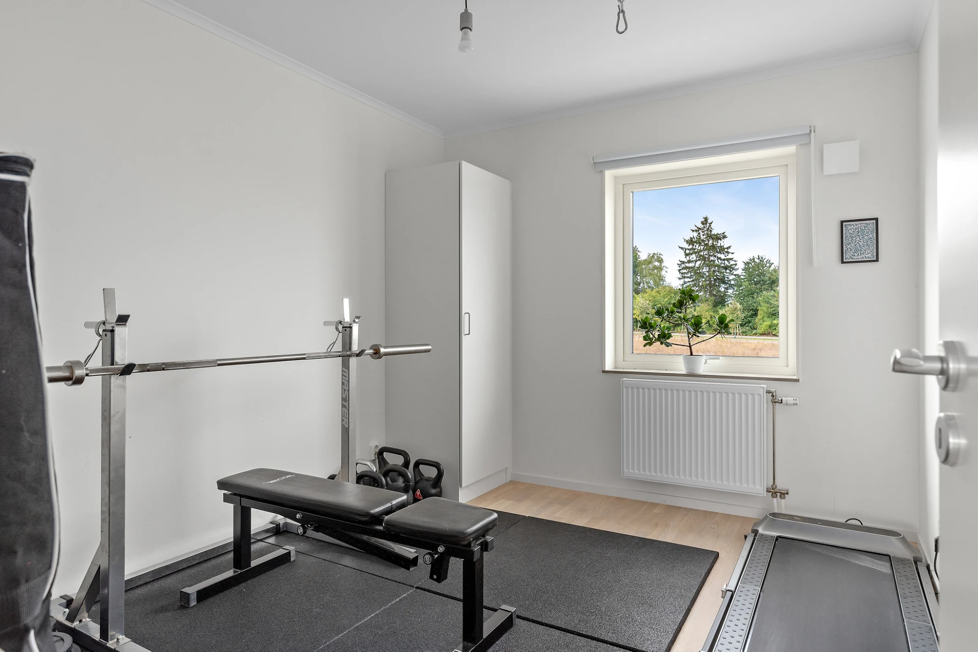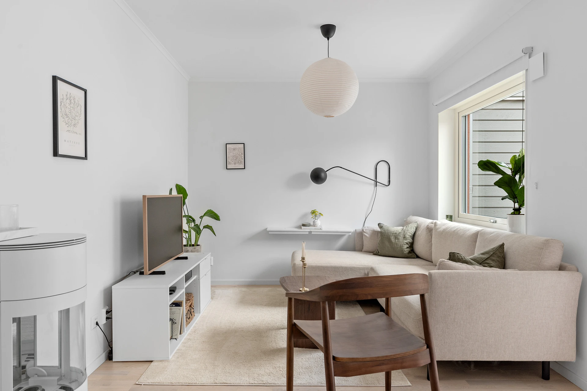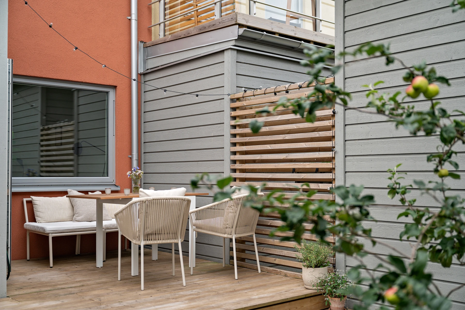 Parkettgolv och vita väggar samt utgång till altan/trädgård.