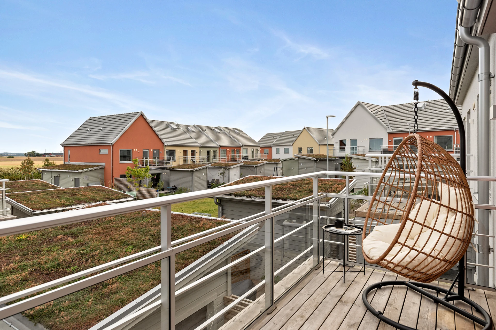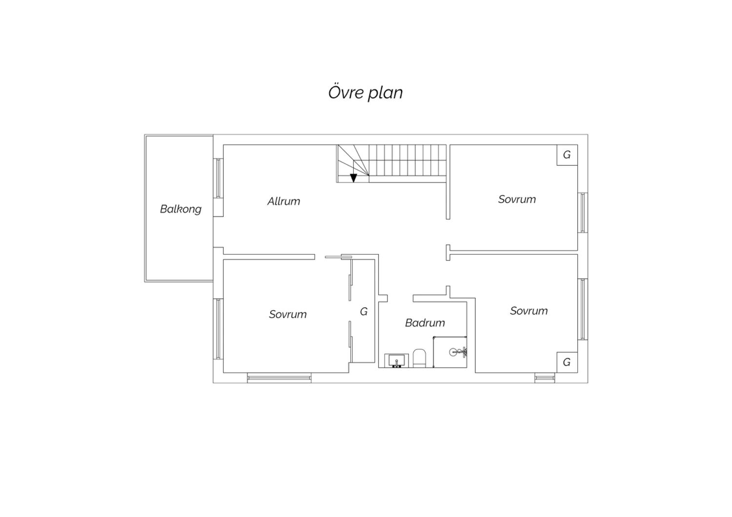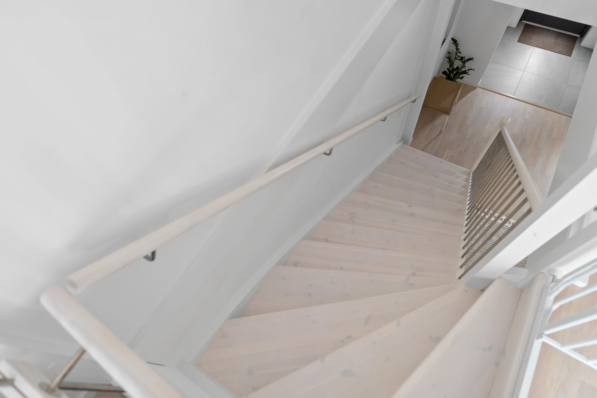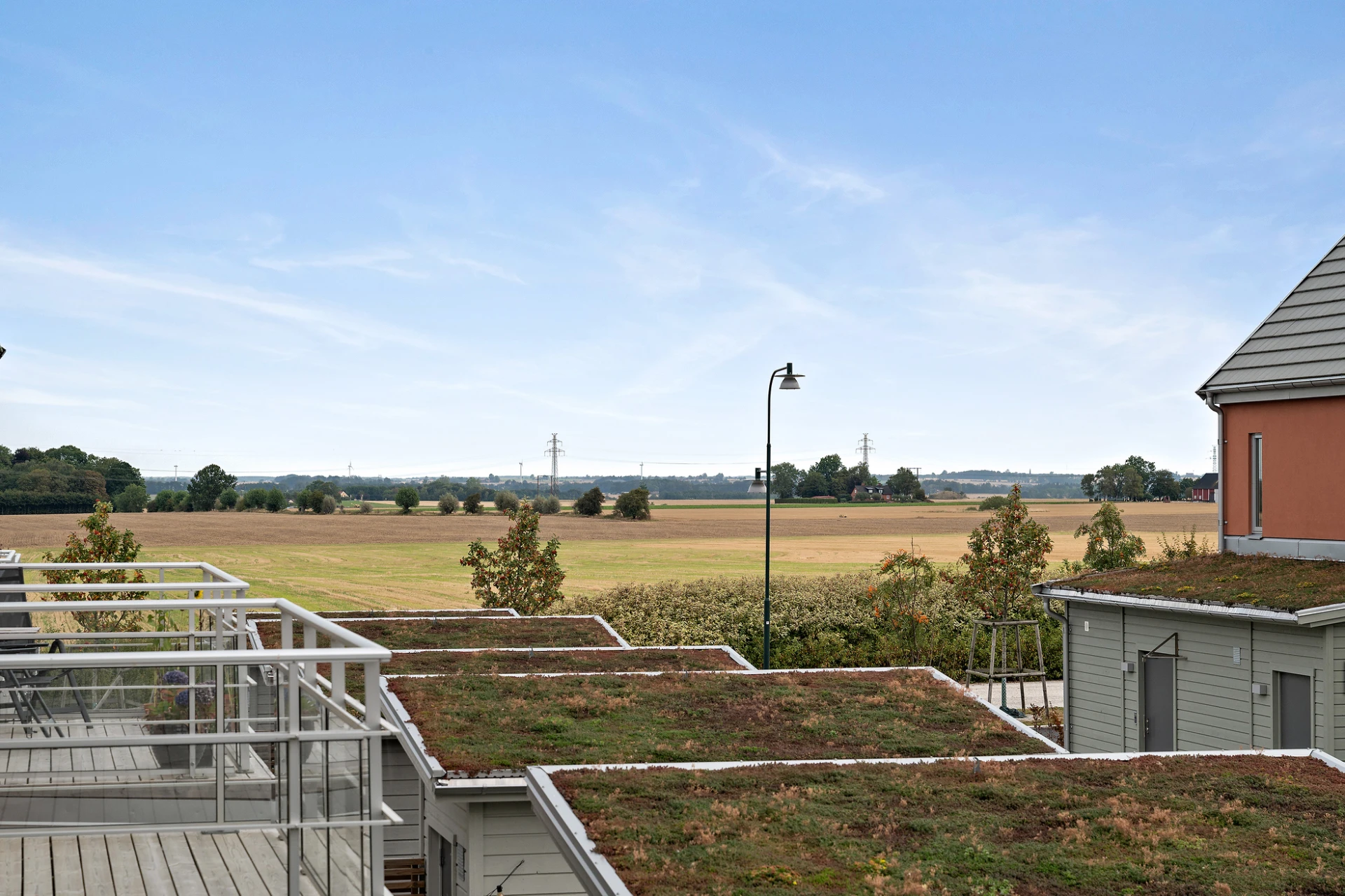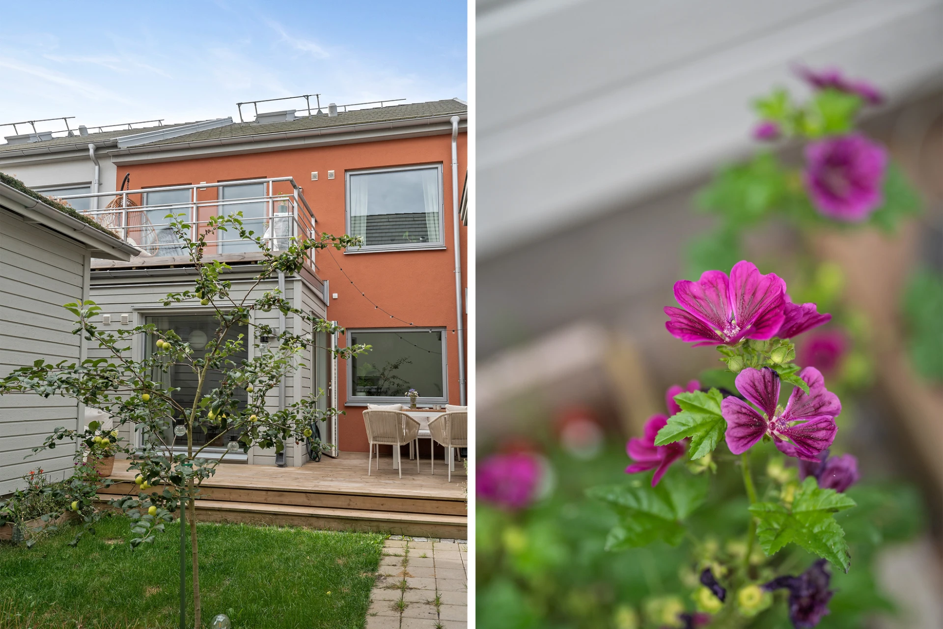 Parkettgolv och vita väggar samt utgång till altan/trädgård.