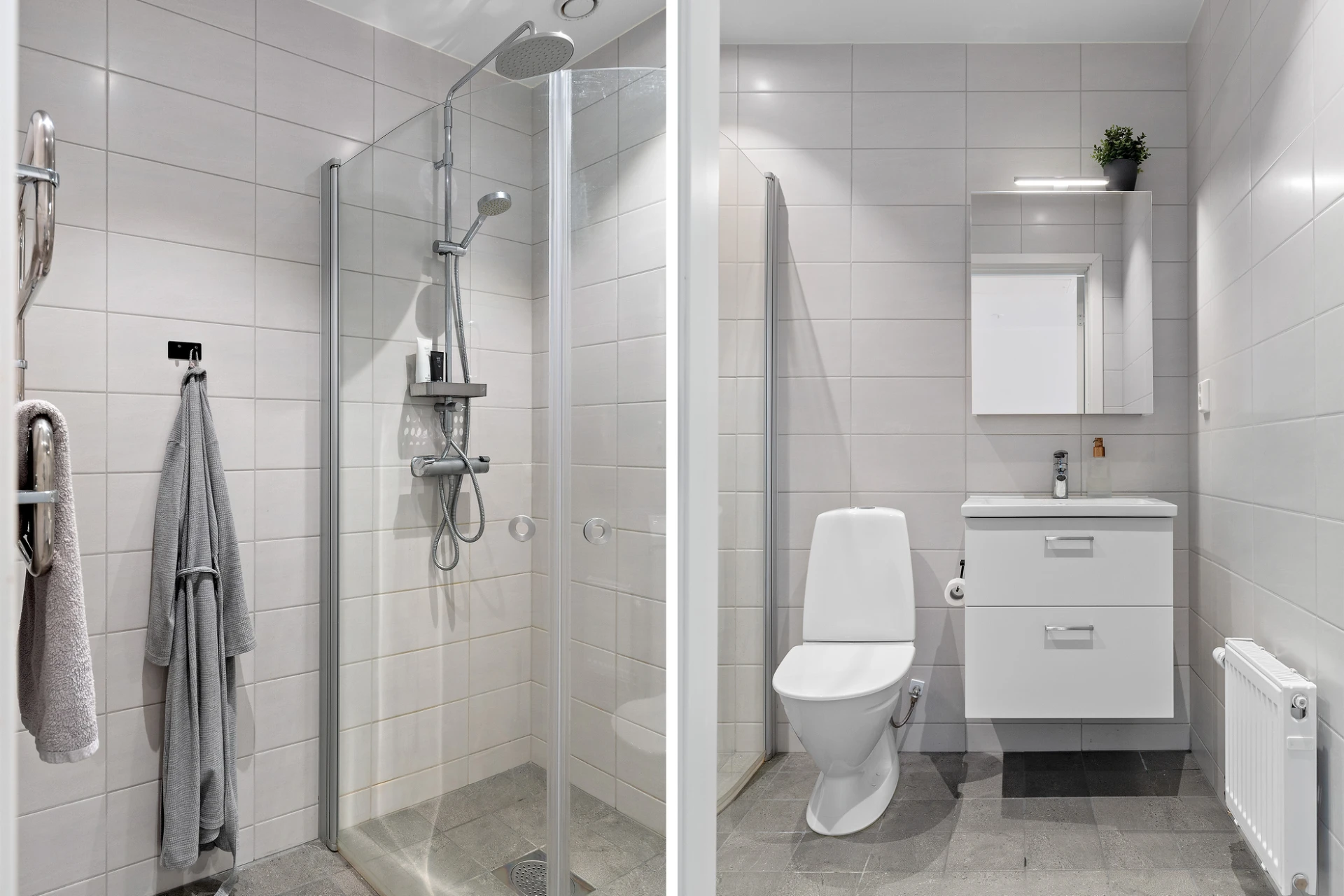 Helkaklat badrum utrustat med WC, handfat med underskåp, spegelskåp, dusch med vikbara glasväggar och handdukstork.