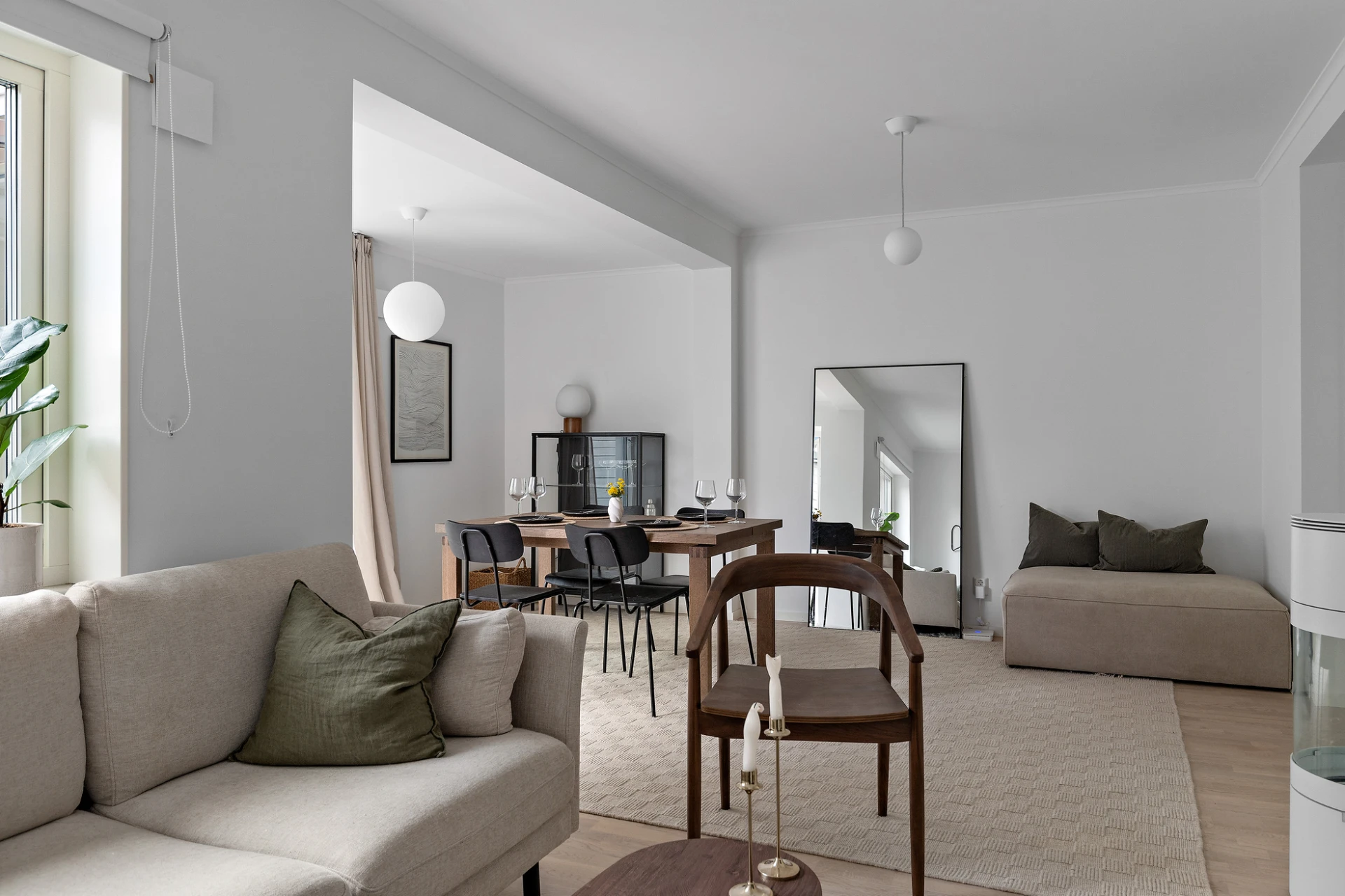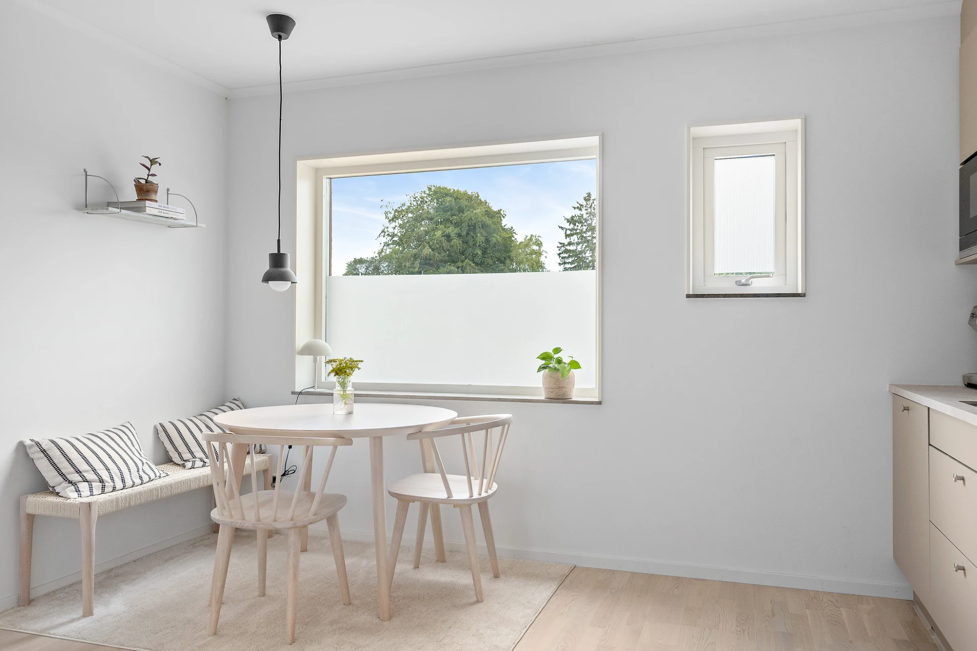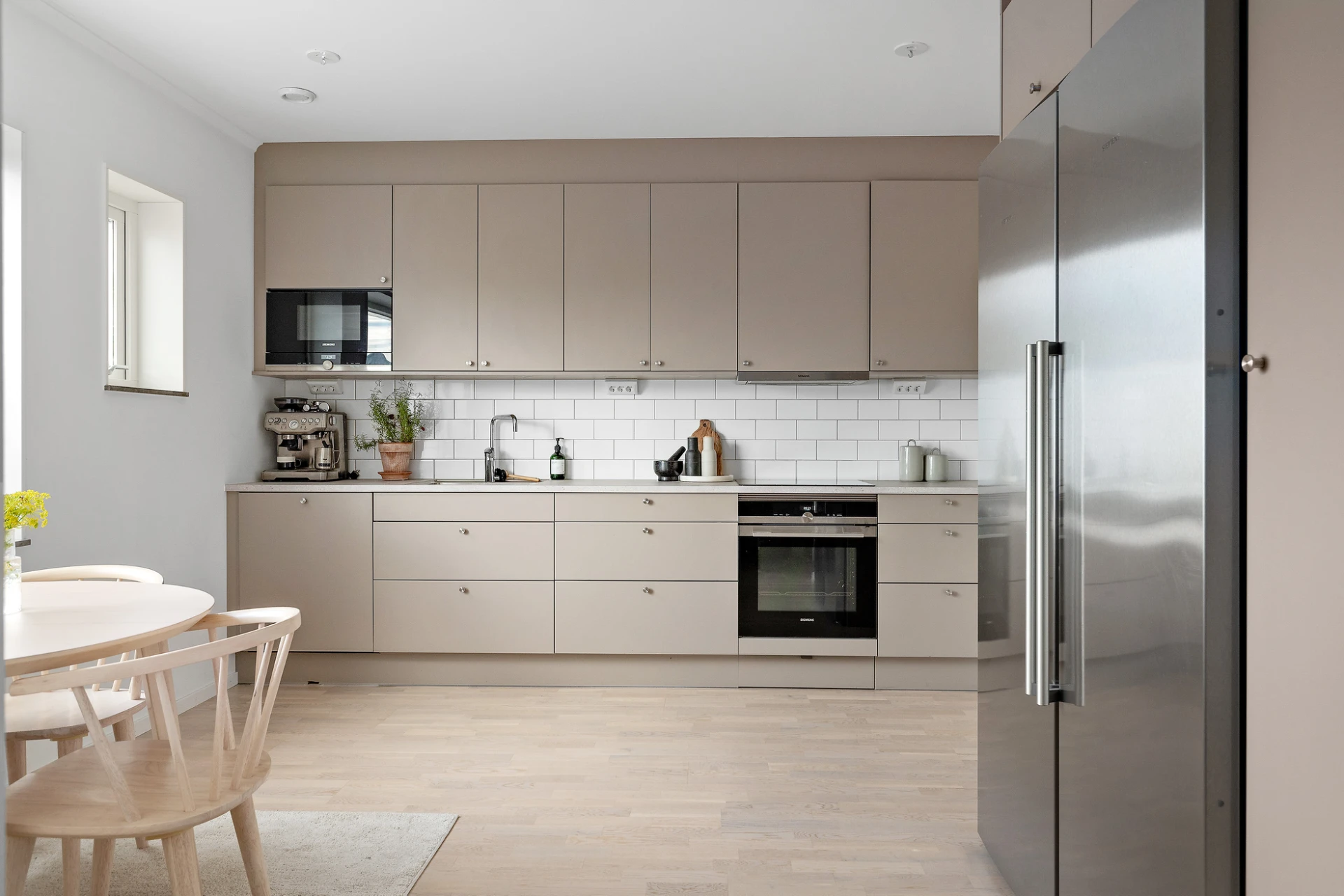Parkettgolv och vita väggar. Greige köksinredning med vit kakel ovan bänkskiva i laminat. Köket är utrustat med kyl, frys, integrerad diskmaskin, integrerad mikrovågsugn, vask, induktionshäll, ugn och fläkt. Matplats för ca 8 personer.