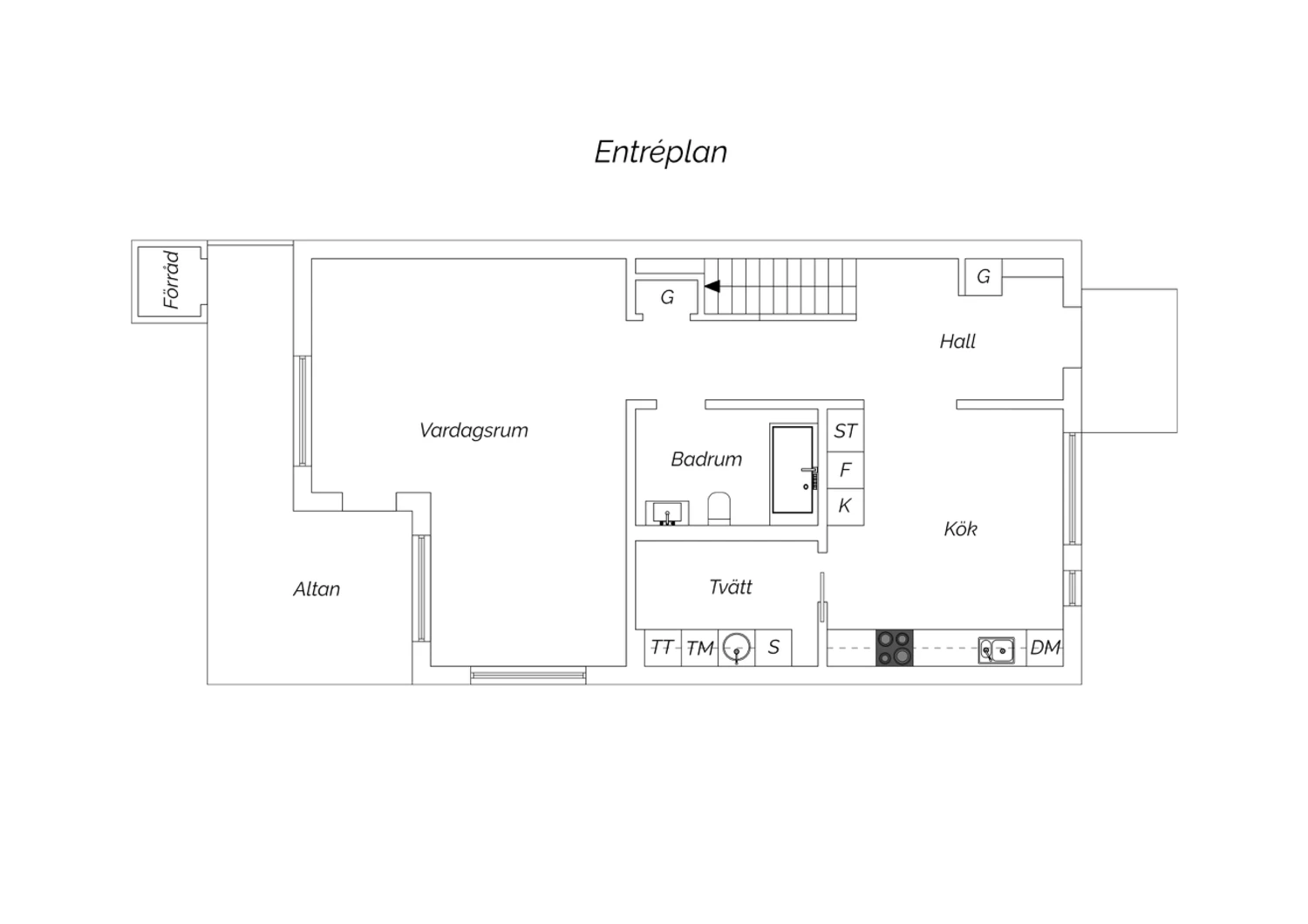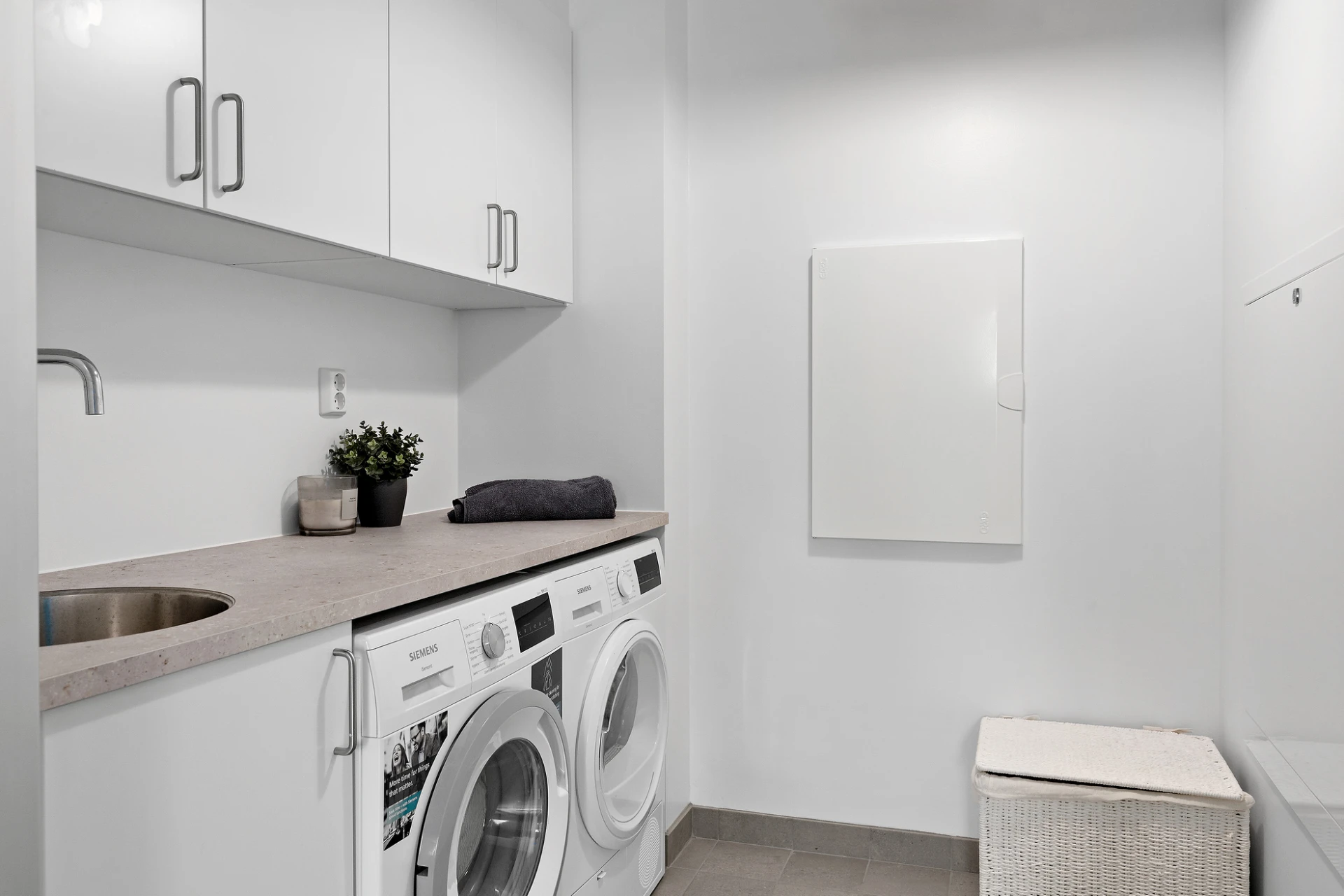 Klinker och vita väggar. Tvättstugan är utrustad med arbetsyta, tvättmaskin, torktumlare, vask, fjärrvärmepump och platsbyggd förvaring.