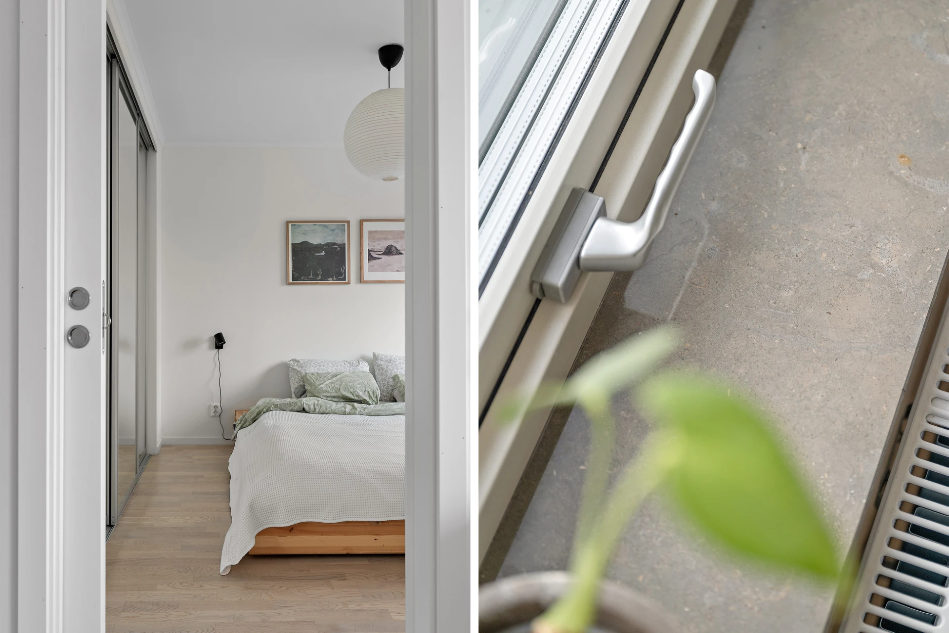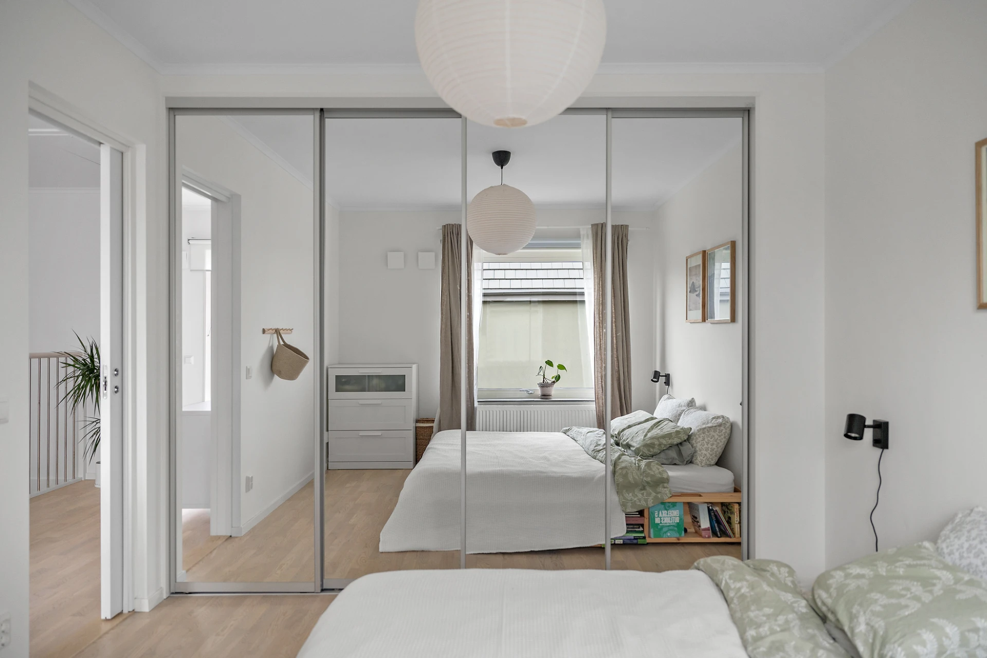 Parkettgolv och vita väggar samt garderob med skjutdörrar.
