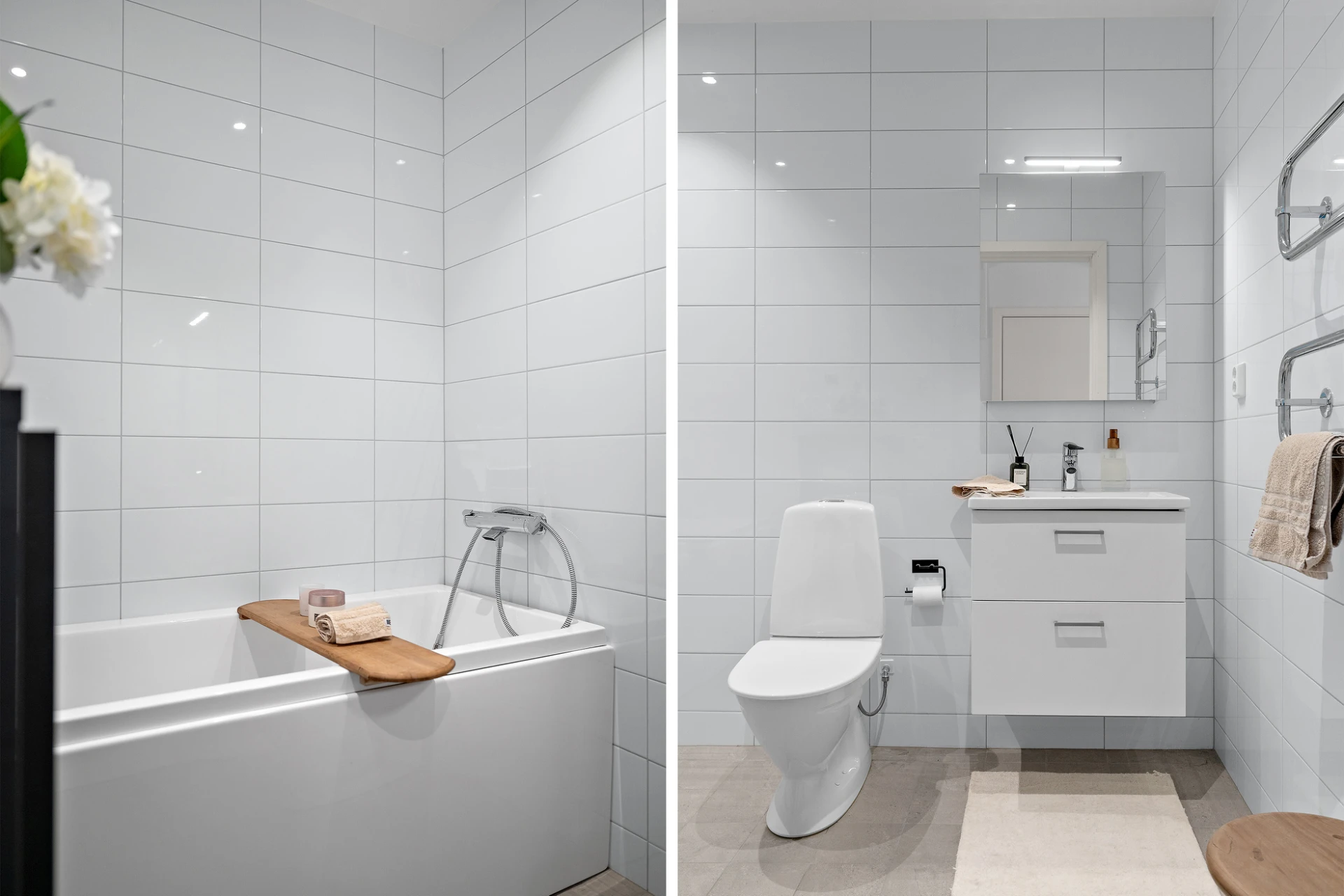 Helkaklat badrum utrustat med WC, handfat med underskåp, spegelskåp, badkar, handdukstork och golvvärme.